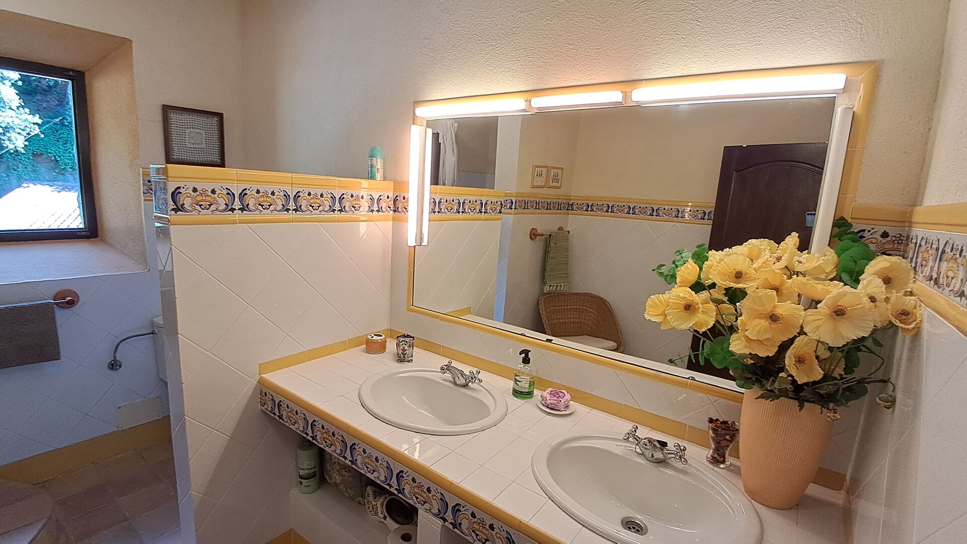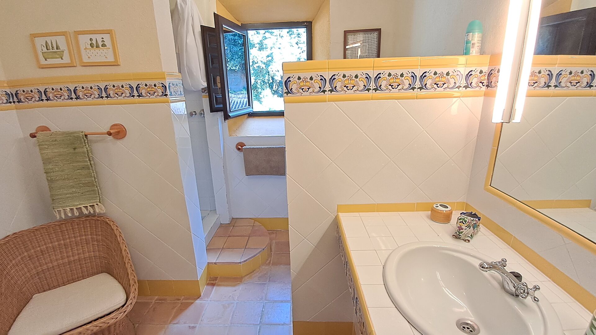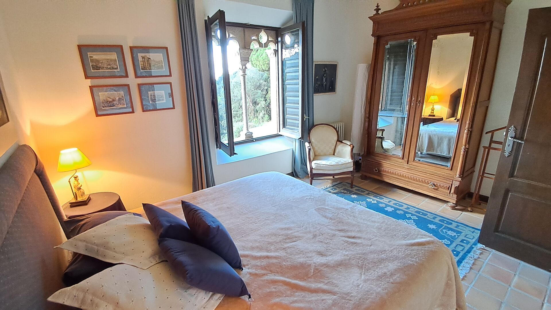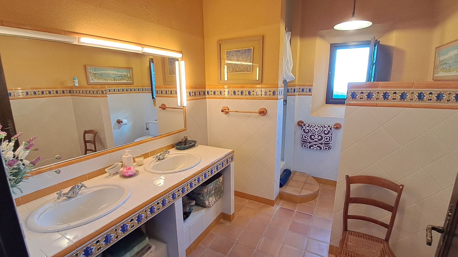 El esposo de Patricia es diseñador de cocinas, por lo que la estufa fue hecha a medida para la casa y, en general, la cocina es fantástica si te gusta cocinar. También hay un comedor muy agradable con acceso directo al jardín, donde hay una gran terraza cubierta, ideal para comer al aire libre, y cómodos sofás para tomar una copa o un café mientras disfrutas de las increíbles vistas. En la planta baja también encontrarás una amplia sala de estar con sofás, televisión e incluso una pantalla enrollable, si traes un proyector. Desde la sala de estar se accede a un pasillo con dos dormitorios grandes y bonitos que comparten un baño con bañera y ducha.