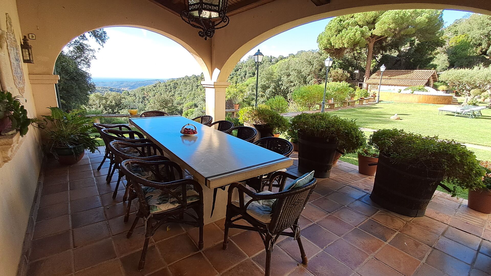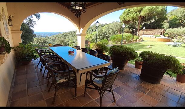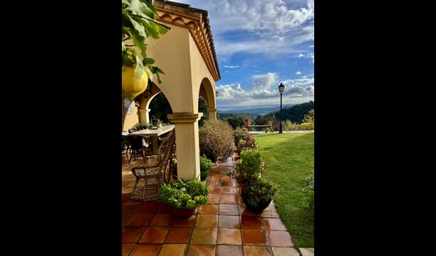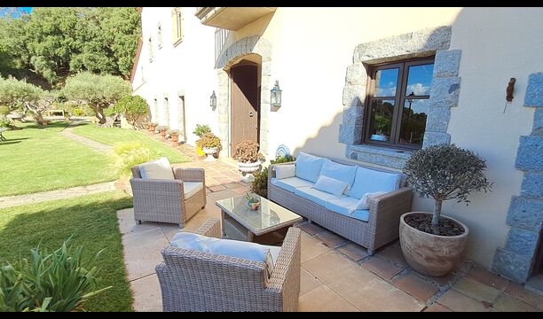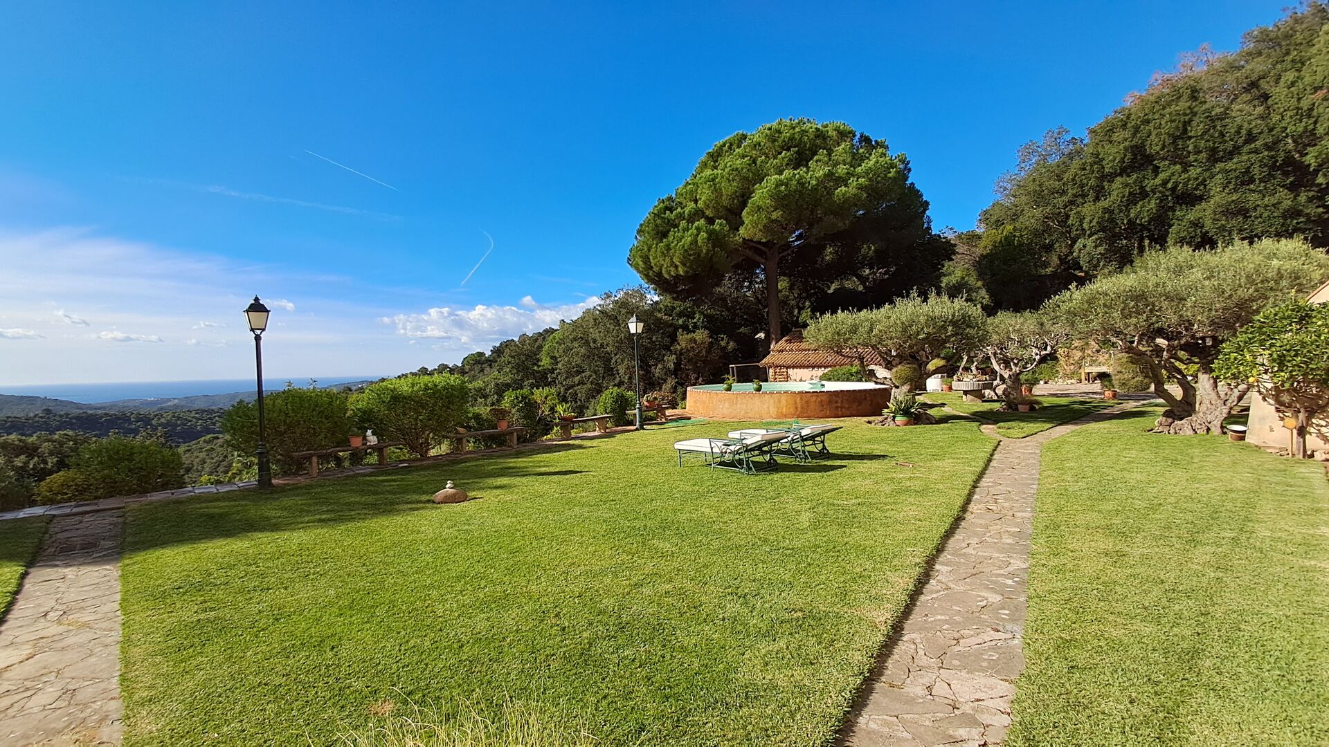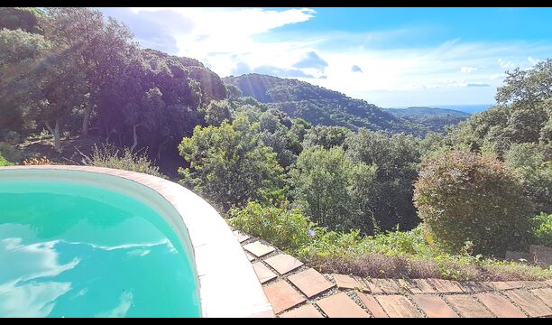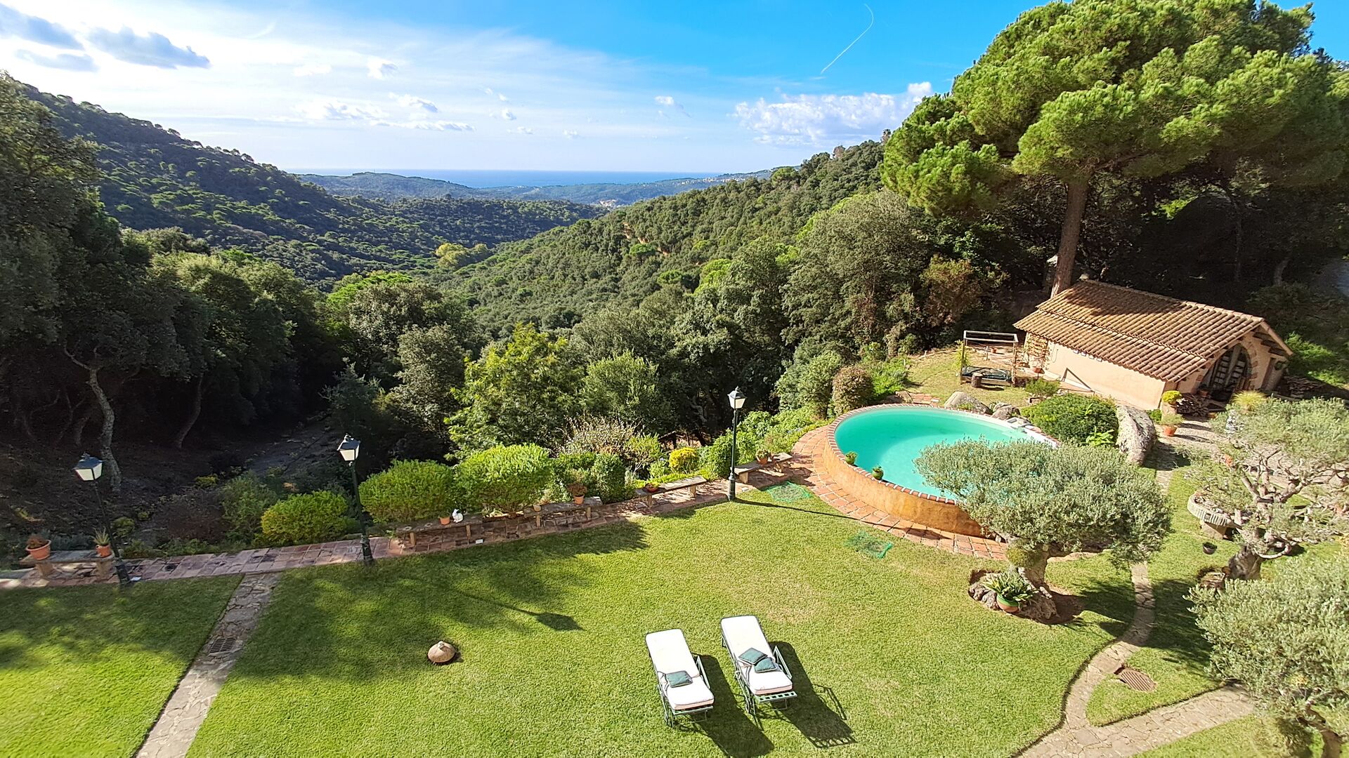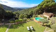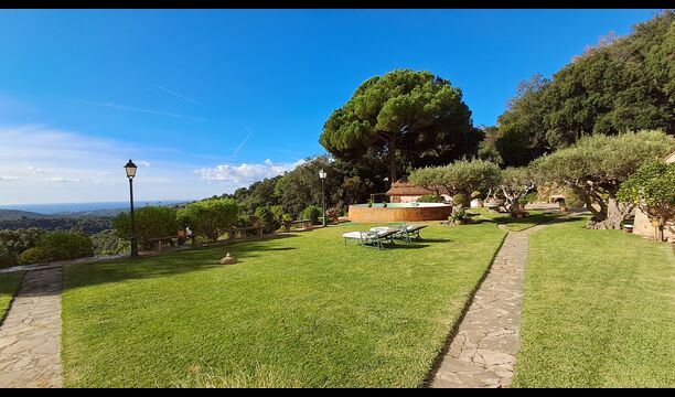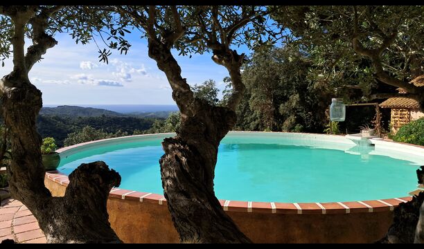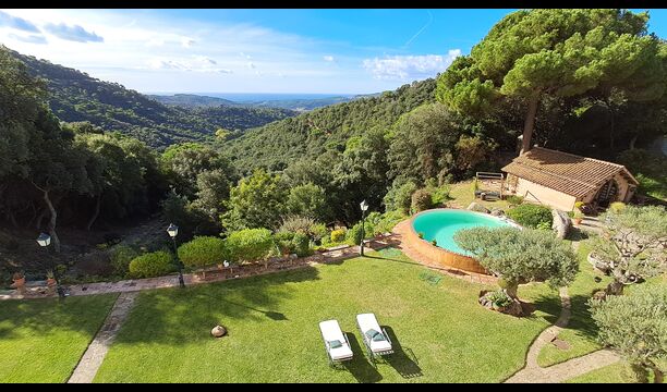 En el exterior, el césped con tumbonas, la terraza y el rincón con sofá junto a la piscina, lo convierten en un lugar fantástico, sobre todo por las impresionantes vistas al bosque y al mar Mediterráneo.