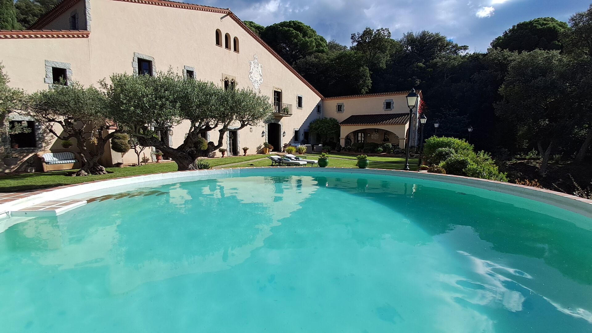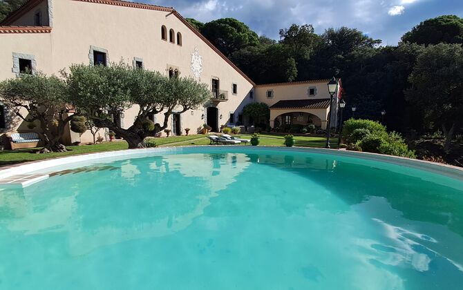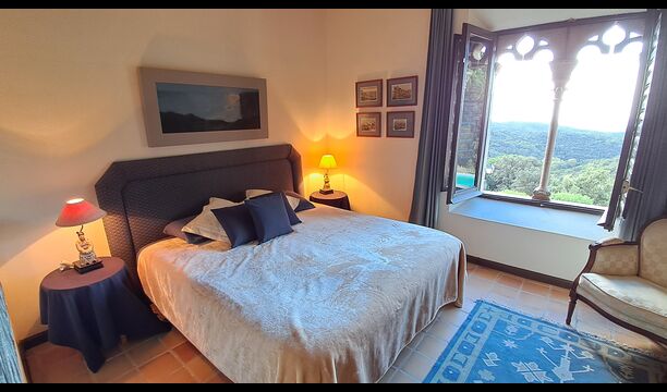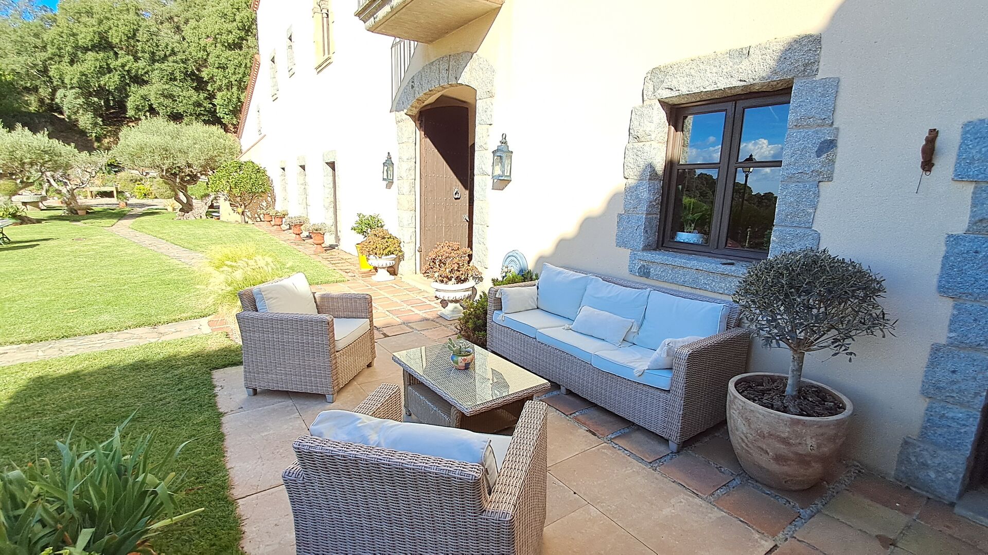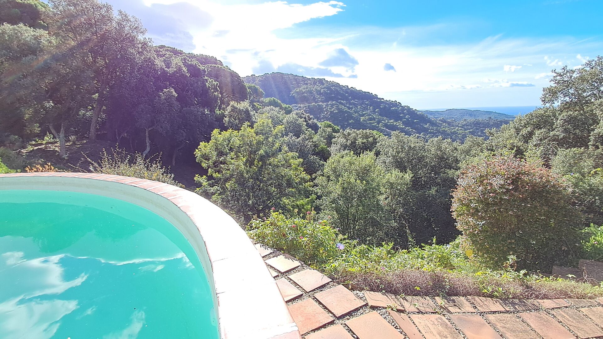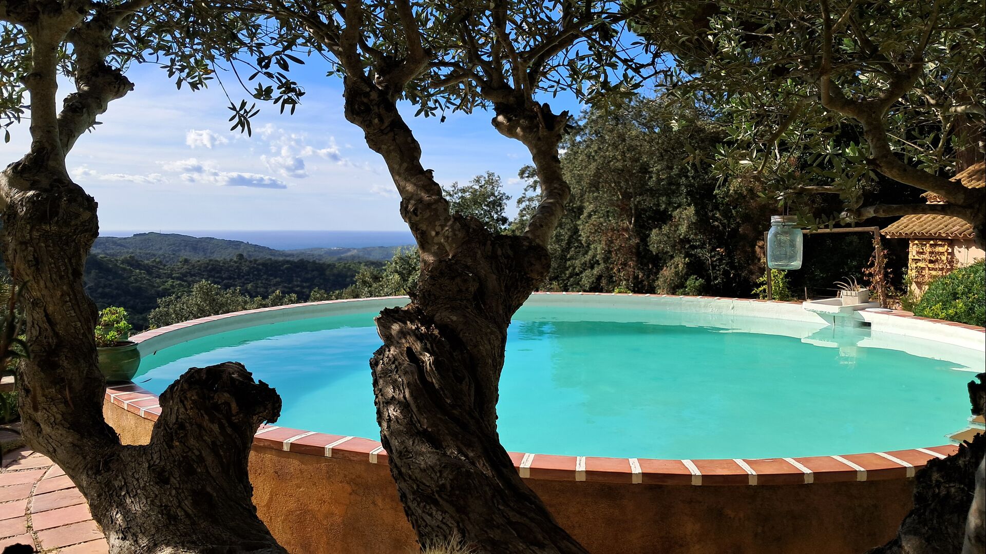 En el exterior, el césped con tumbonas, la terraza y el rincón con sofá junto a la piscina, lo convierten en un lugar fantástico, sobre todo por las impresionantes vistas al bosque y al mar Mediterráneo.