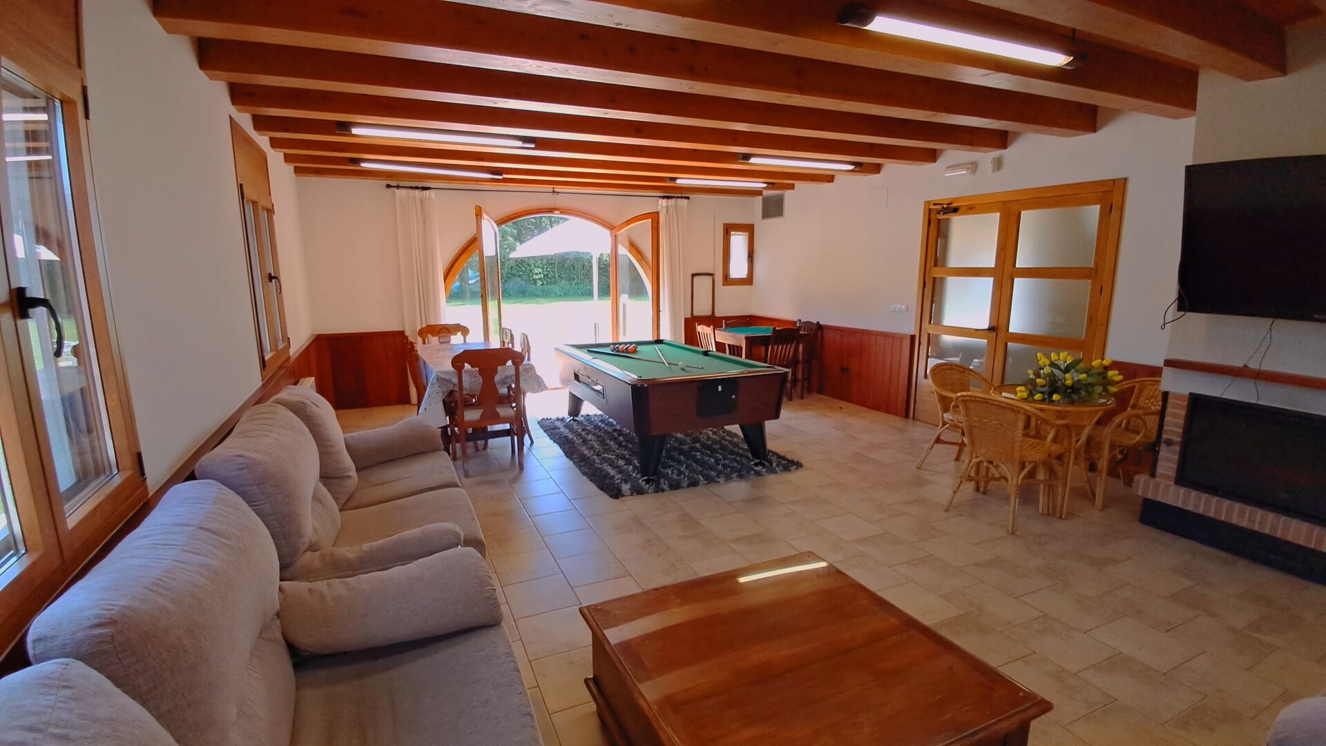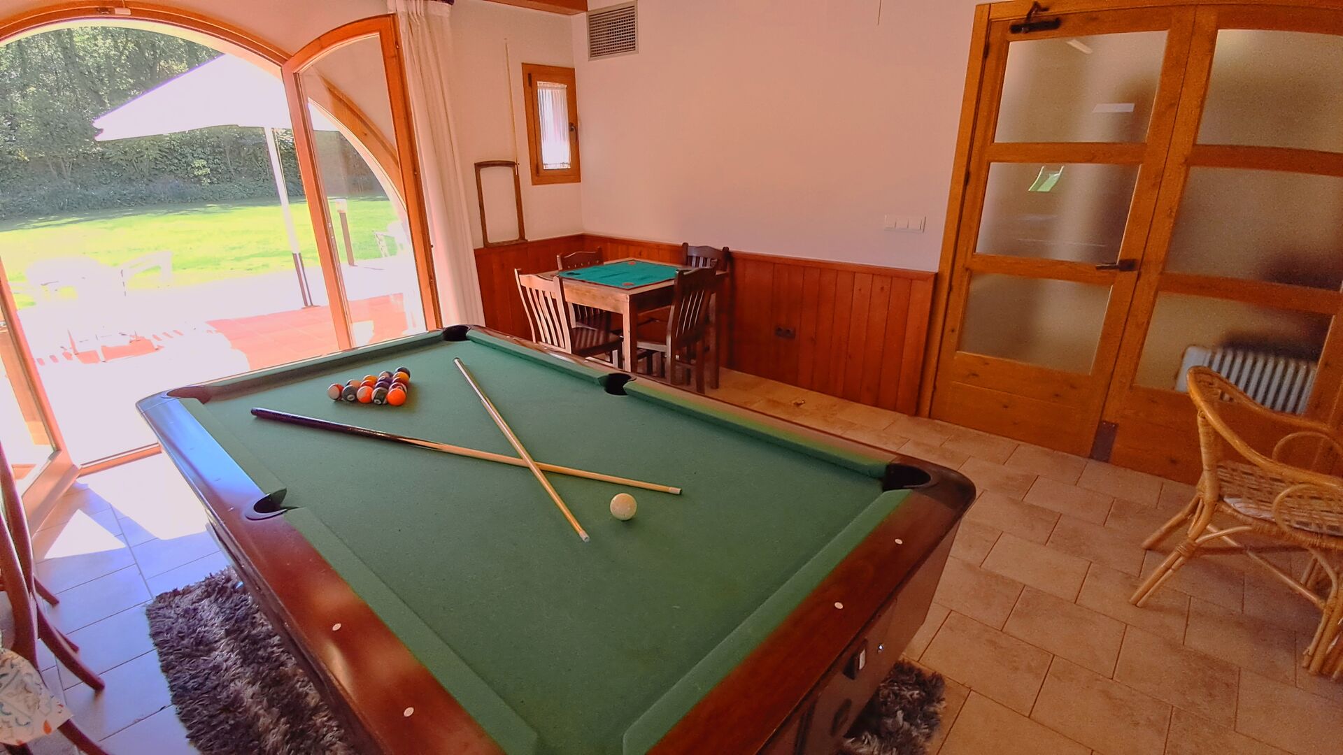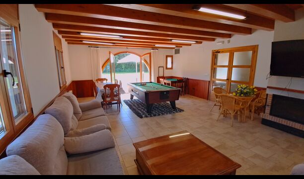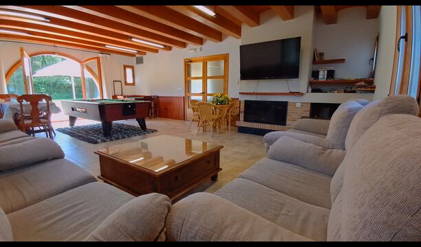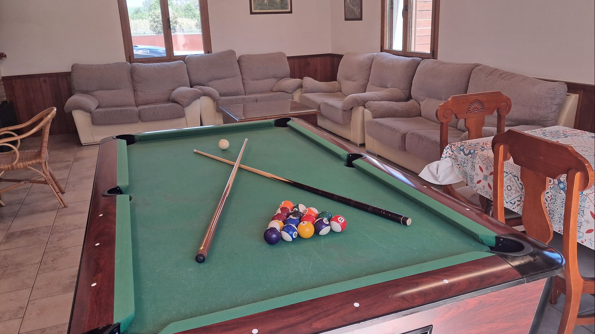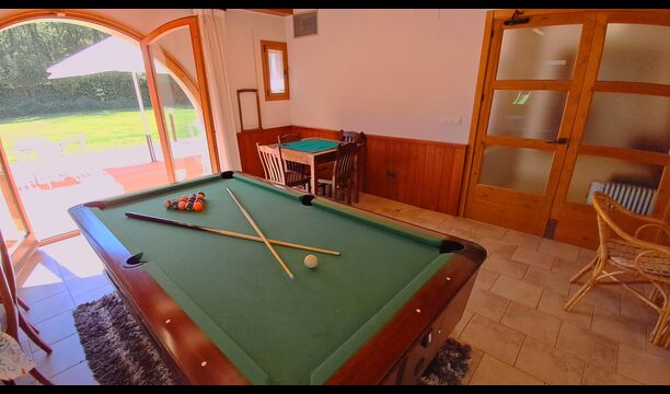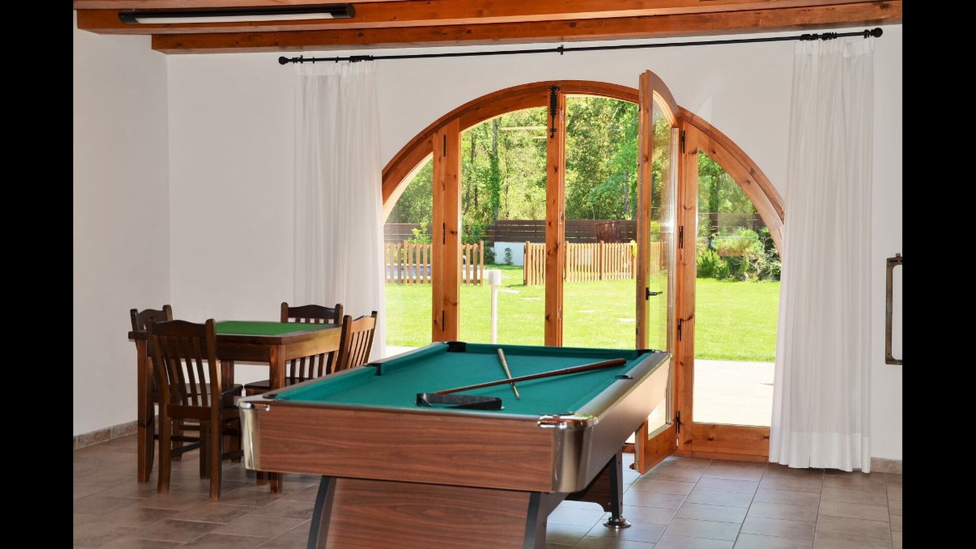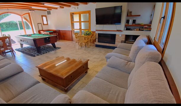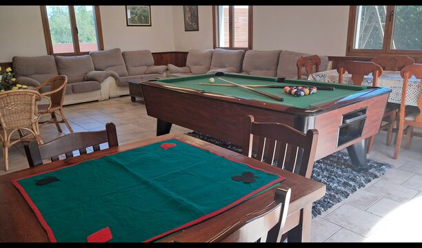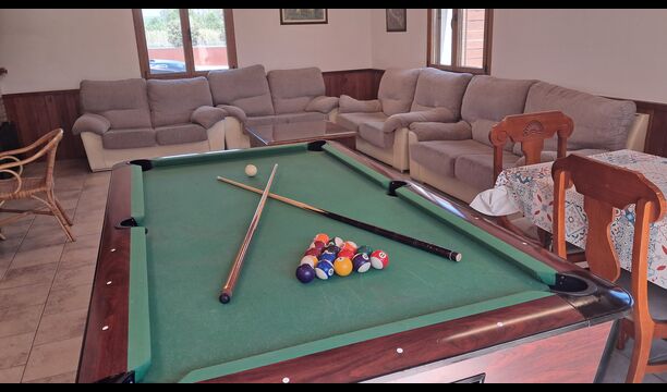 Cuando ingresa a la entrada de la villa de vacaciones, a la izquierda hay una sala de estar. Aquí hay sofás, una mesa de billar, una gran pantalla plana y equipo de música, un excelente lugar para relajarse en el interior. A la derecha, puede ver la cocina muy bien equipada de la casa de vacaciones. Tiene un congelador (que siempre está lleno de aceite fresco para los huéspedes que llegan), microondas, varios refrigeradores, cafetera Nespresso, horno gigante, lavavajillas grande y mucho más. En relación con esto, hay un agradable comedor, y puede acceder al comedor al aire libre, para que pueda disfrutar de las largas y cálidas noches de verano.