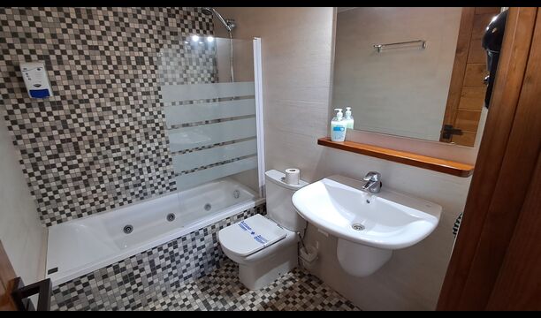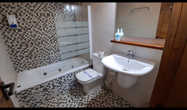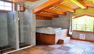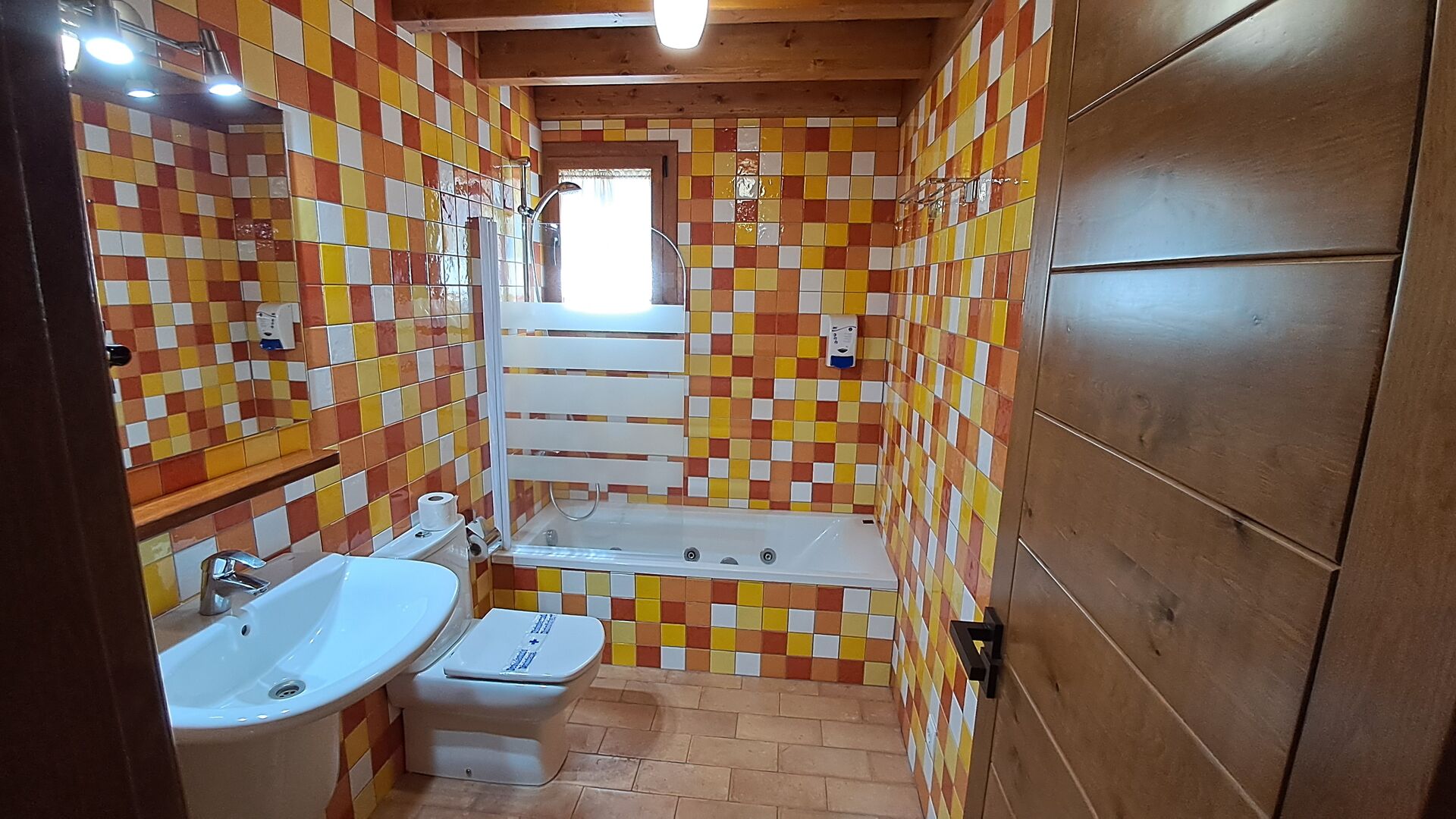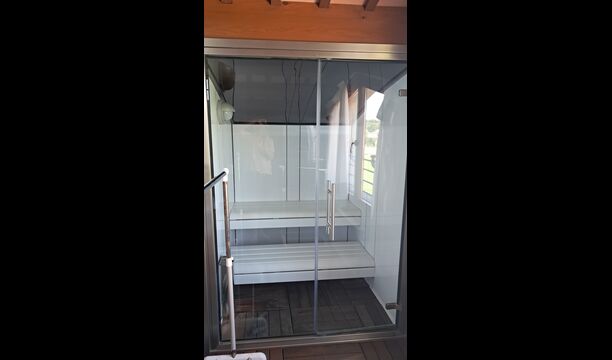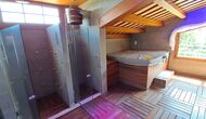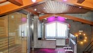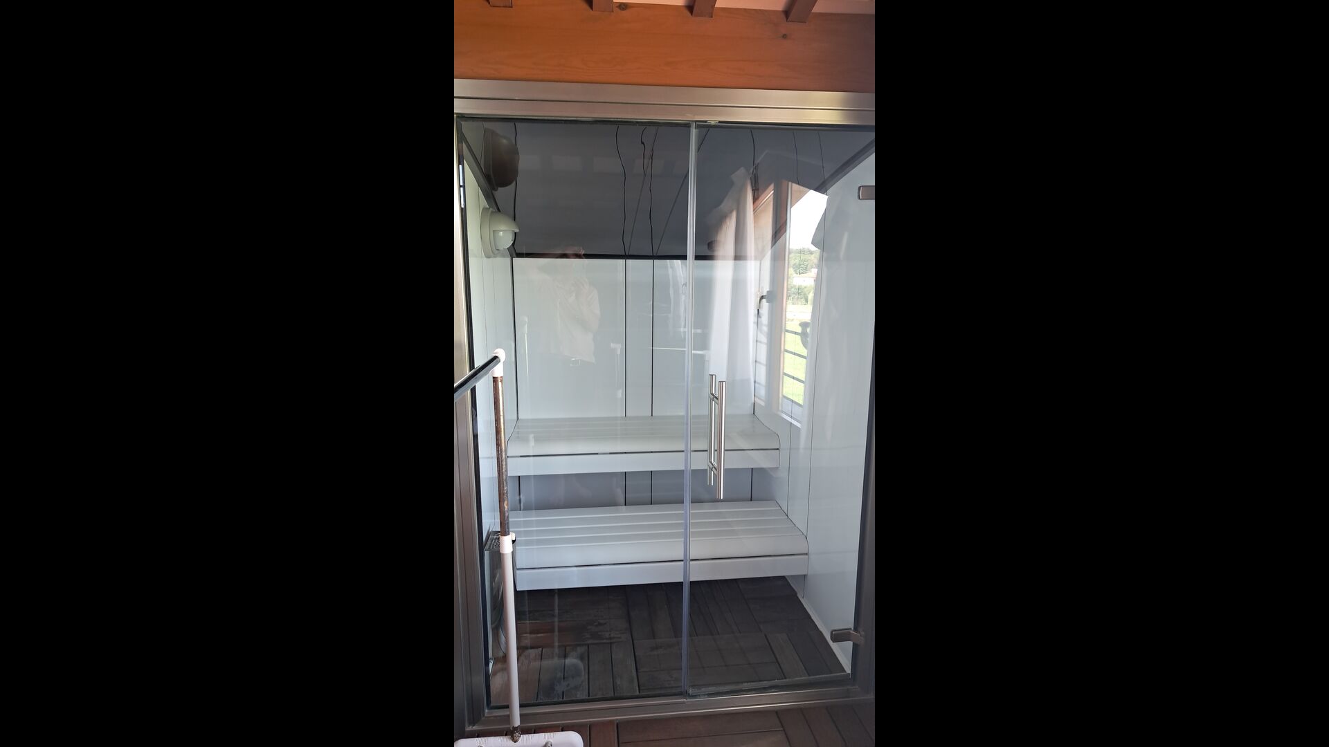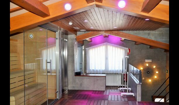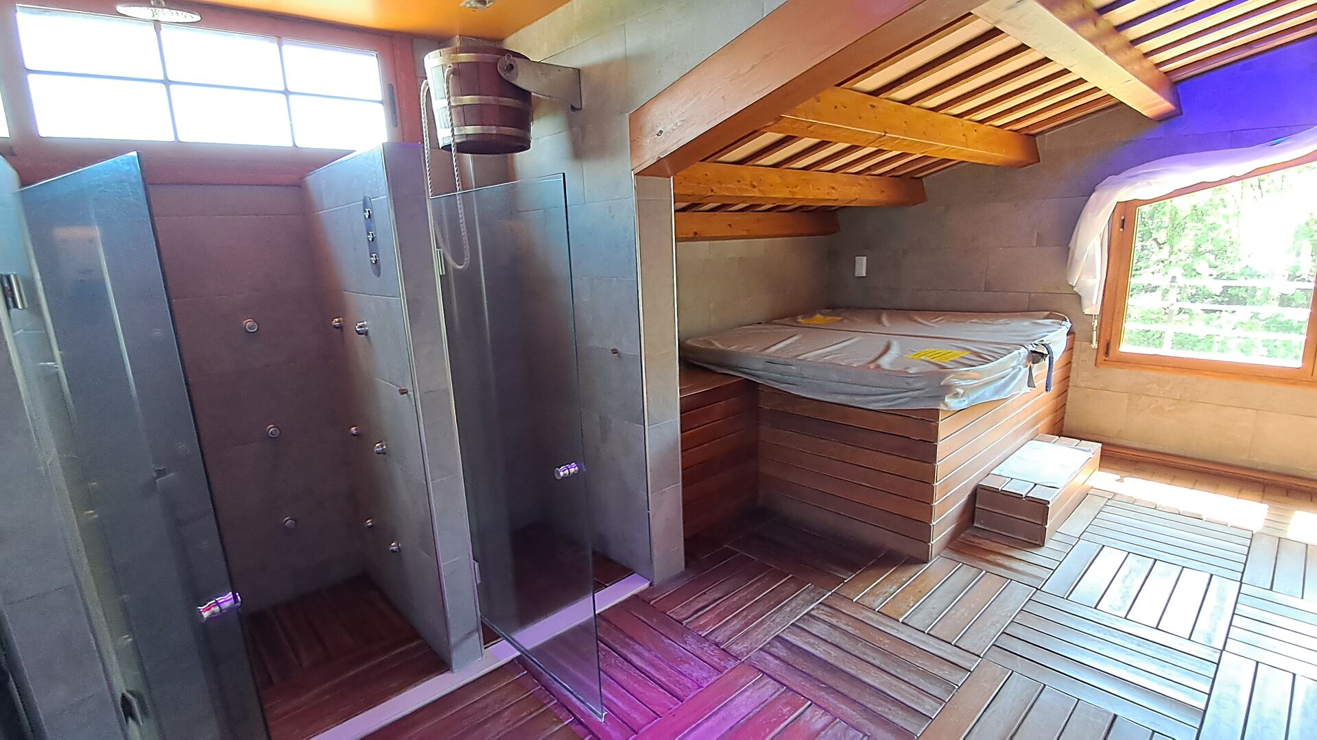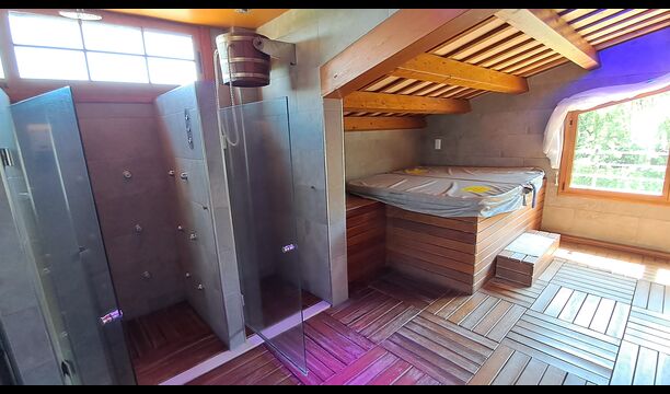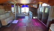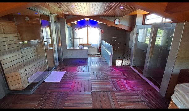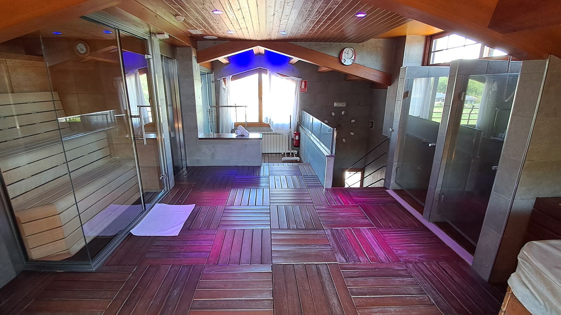 En el segundo piso, los propietarios han construido un área de bienestar completa. Si estás aquí para relajarte, entonces ciertamente has encontrado el lugar. Hay dos piscinas de hidromasaje, baño de agua fría, duchas de hidromasaje y dos saunas, una con eucalipto y otra normal. El ascensor sube hasta aquí, y con mucha luz y música de diferentes colores, el escenario está preparado para una experiencia especial.