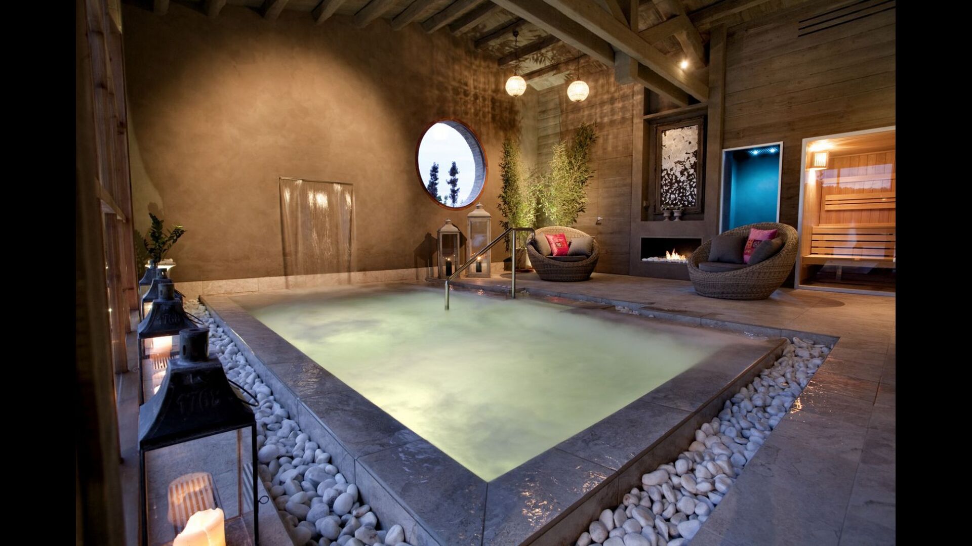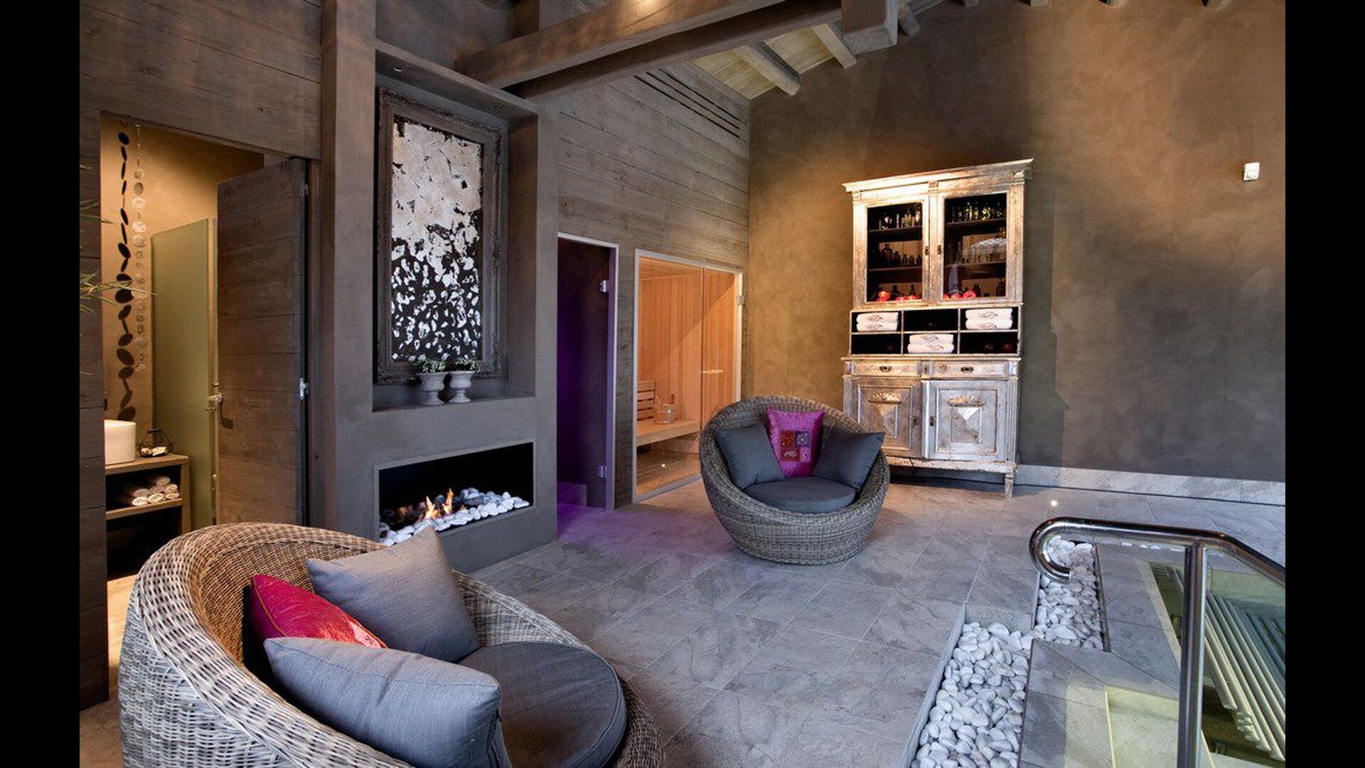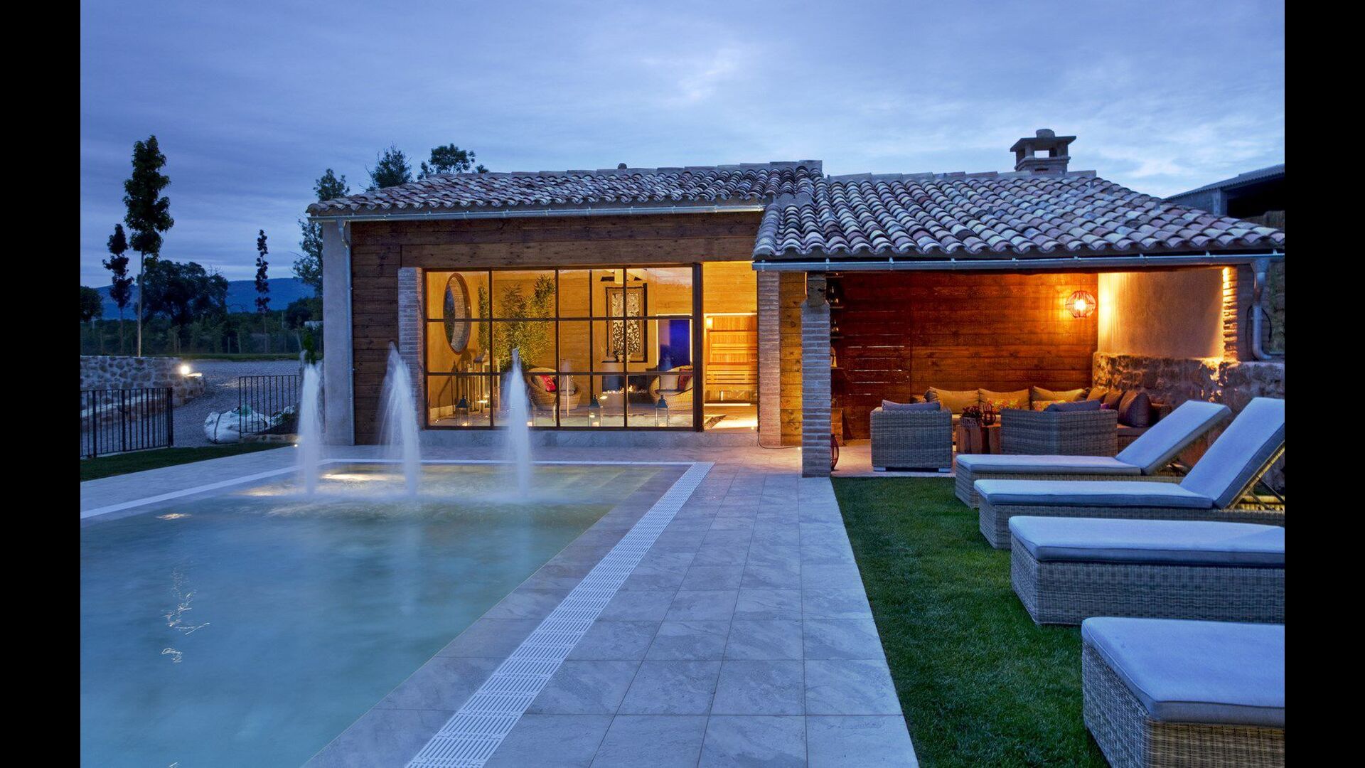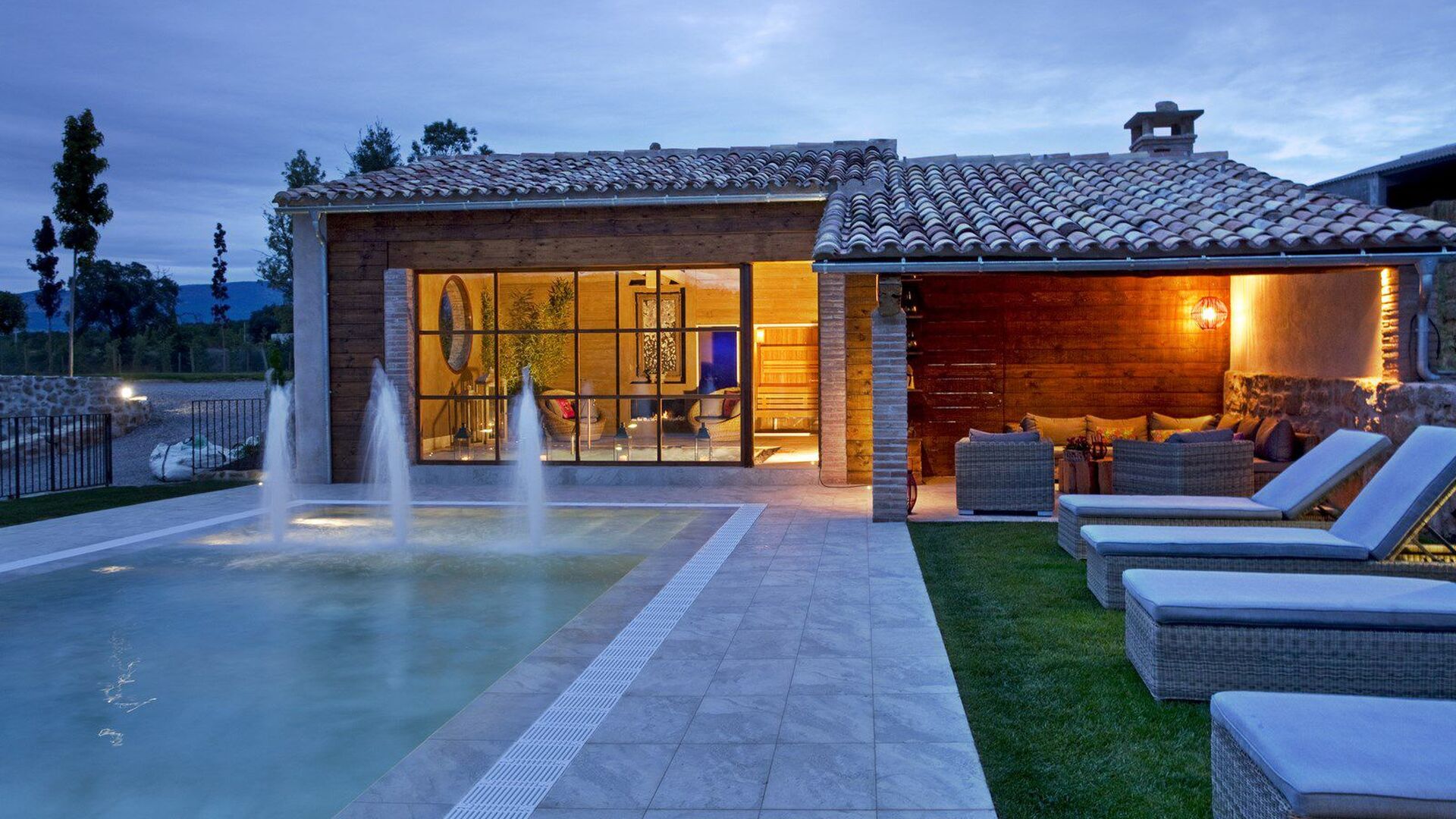 Las zonas comunes (cocina, salón con chimenea de leña y comedor) estan situadas en la planta baja, junto al porche con barbacoa, también del jardín y de la piscina exterior, y son espacios ideales para relajarse y compartir momentos con la familia o los amigos. Cirera d'Avall dispone además de un Spa con piscina interior y una sauna. La cocina dispone de todas las comodidades necesarias y la decoración de la casa conjuga el gusto por lo delicado con los materiales rústicos de su entorno natural, como la piedra y la madera.
