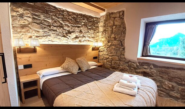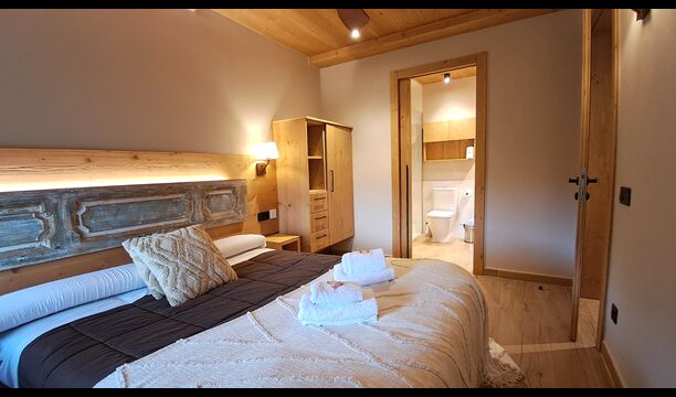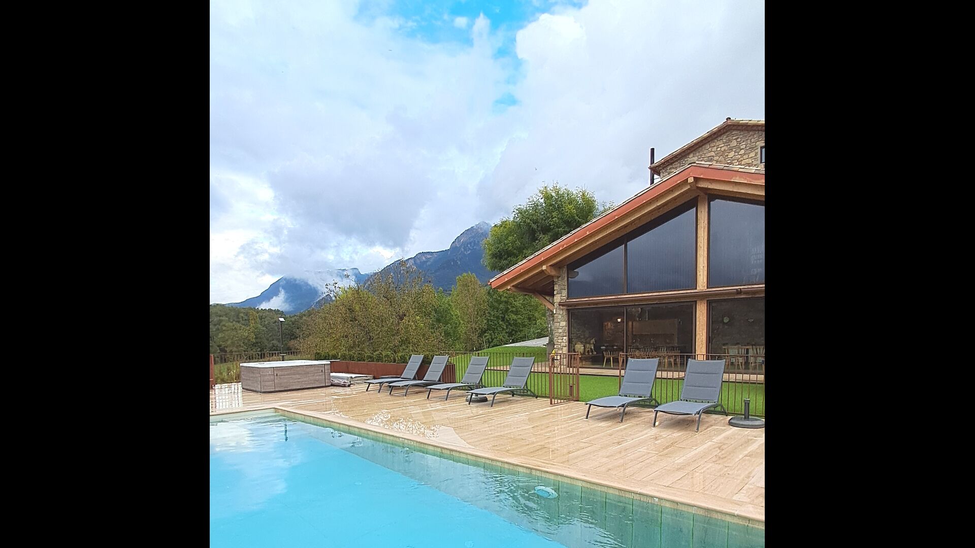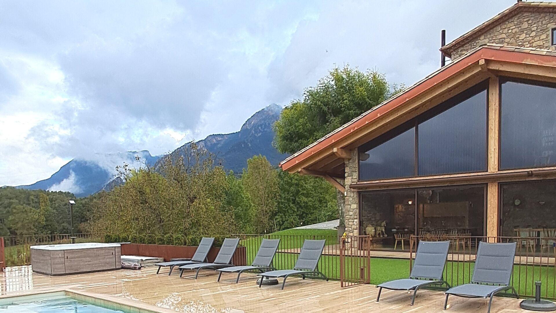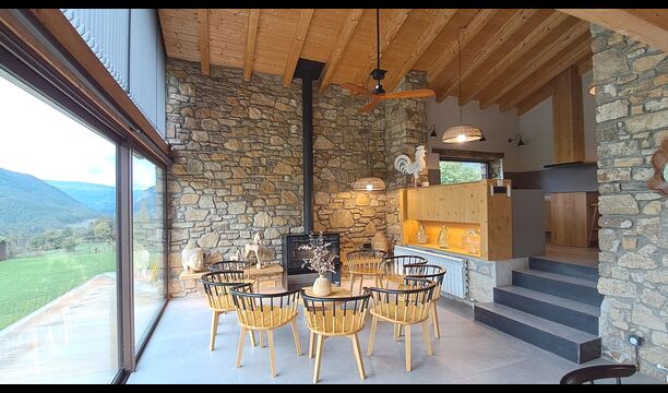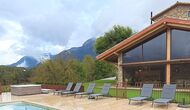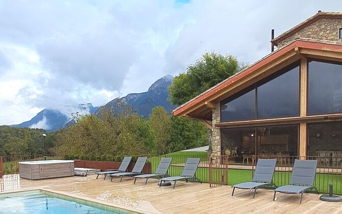 La piscina privada y el espacioso jardín ofrecen vistas despejadas a las montañas, mientras que la zona de barbacoa y las terrazas soleadas permiten disfrutar de cada momento al aire libre. En invierno, la experiencia se vuelve mágica con el jacuzzi exterior, donde hasta ocho personas pueden relajarse mientras admiran los picos nevados de los Pirineos.