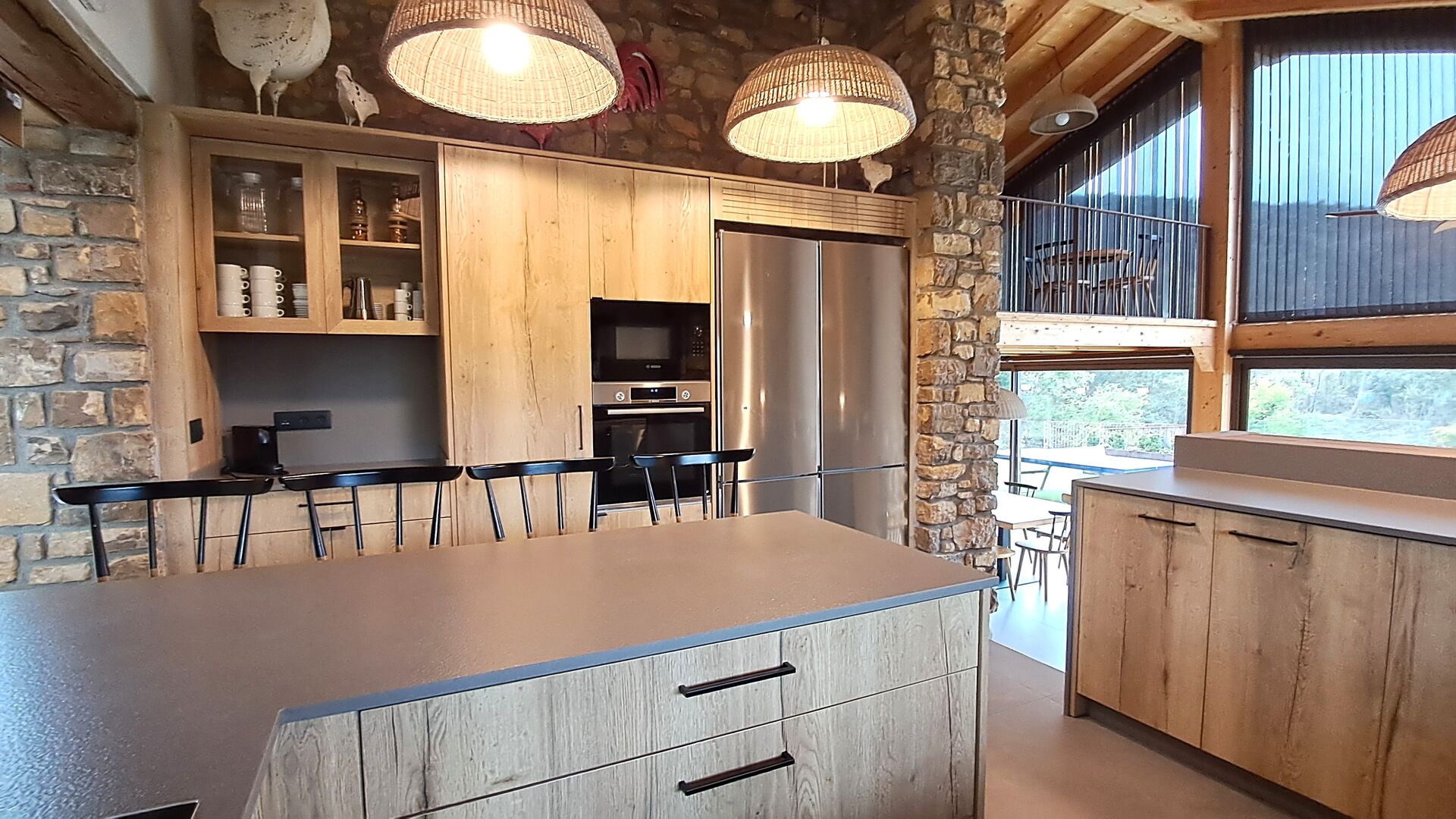 En el otro extremo de la casa, podéis reuniros en el precioso comedor de diseño, conectado con una gran cocina totalmente equipada. En conexión directa se encuentran la terraza exterior y la piscina, lo que permite comer dentro o fuera según las preferencias y el clima. En la planta superior hay un bonito altillo con juguetes para los más pequeños.