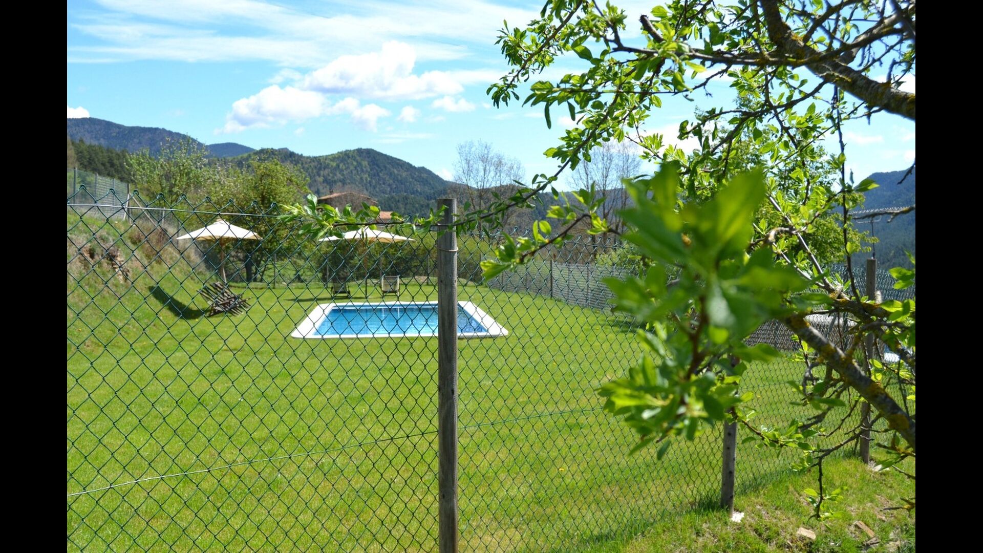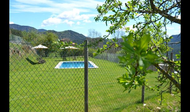 Fuera de la villa se encuentra la piscina de casi 43 m². Es muy amigable para los niños porque tiene escaleras, por lo que los niños pueden meterse fácilmente en el agua. Hay tumbonas y sombrillas y las hermosas y maravillosas vistas a las montañas. El área de la piscina está cercada, por lo que los niños pequeños no pueden acceder sin supervisión.