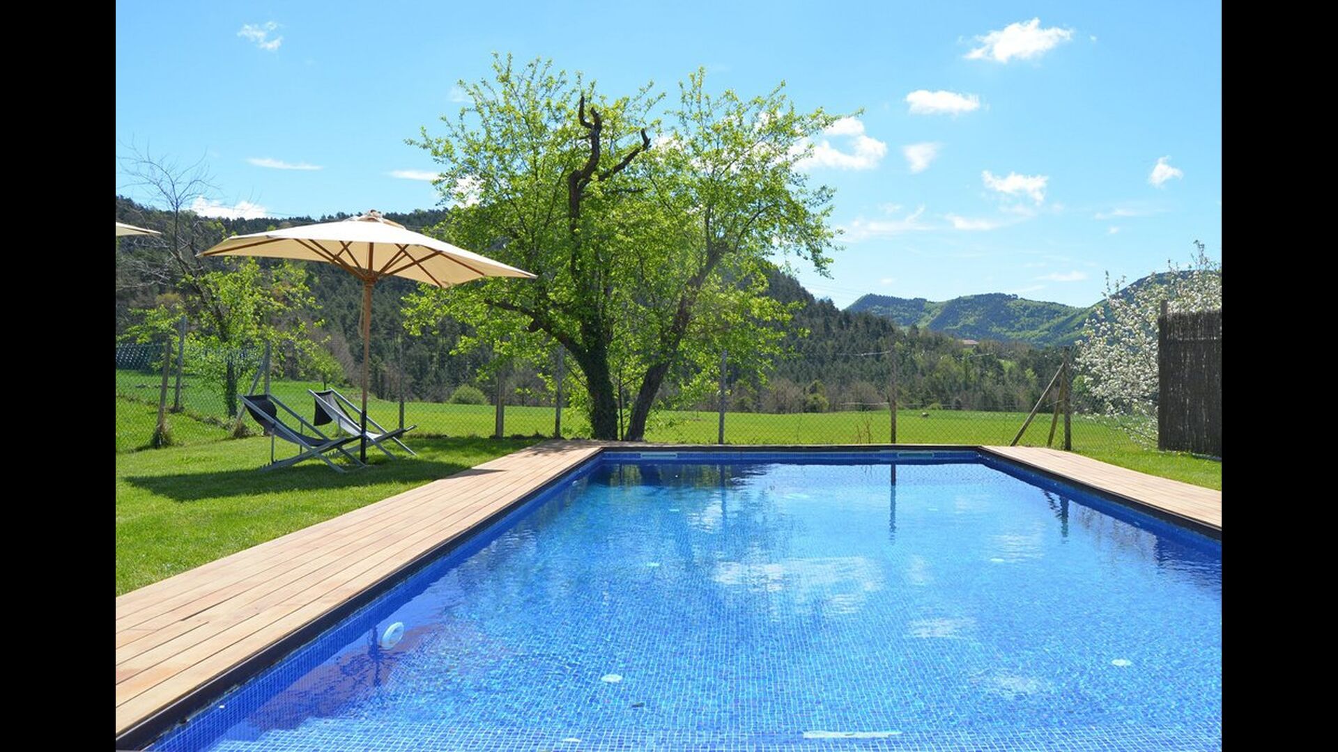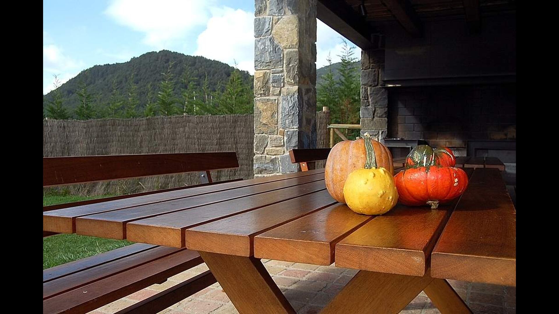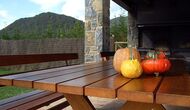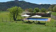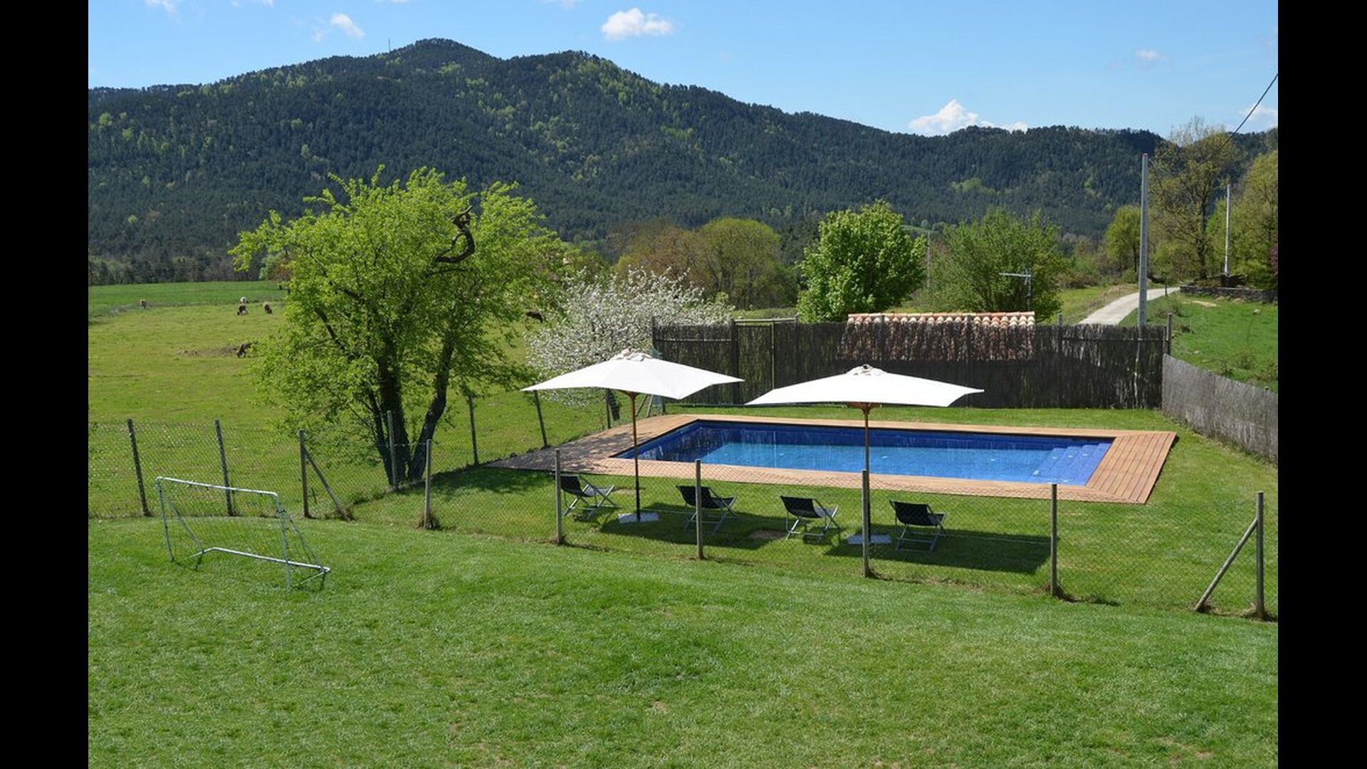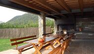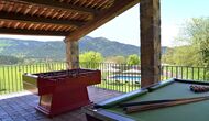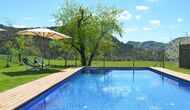 En el exterior, Casa Ferrera dispone de una terraza cubierta con zona de comedor, que se abre a amplias zonas ajardinadas que conducen a una piscina privada y vallada. Rodeados de naturaleza y con vistas abiertas al paisaje y a las montañas, los espacios exteriores son ideales para relajarse, comer al aire libre o para que los niños jueguen con total seguridad.