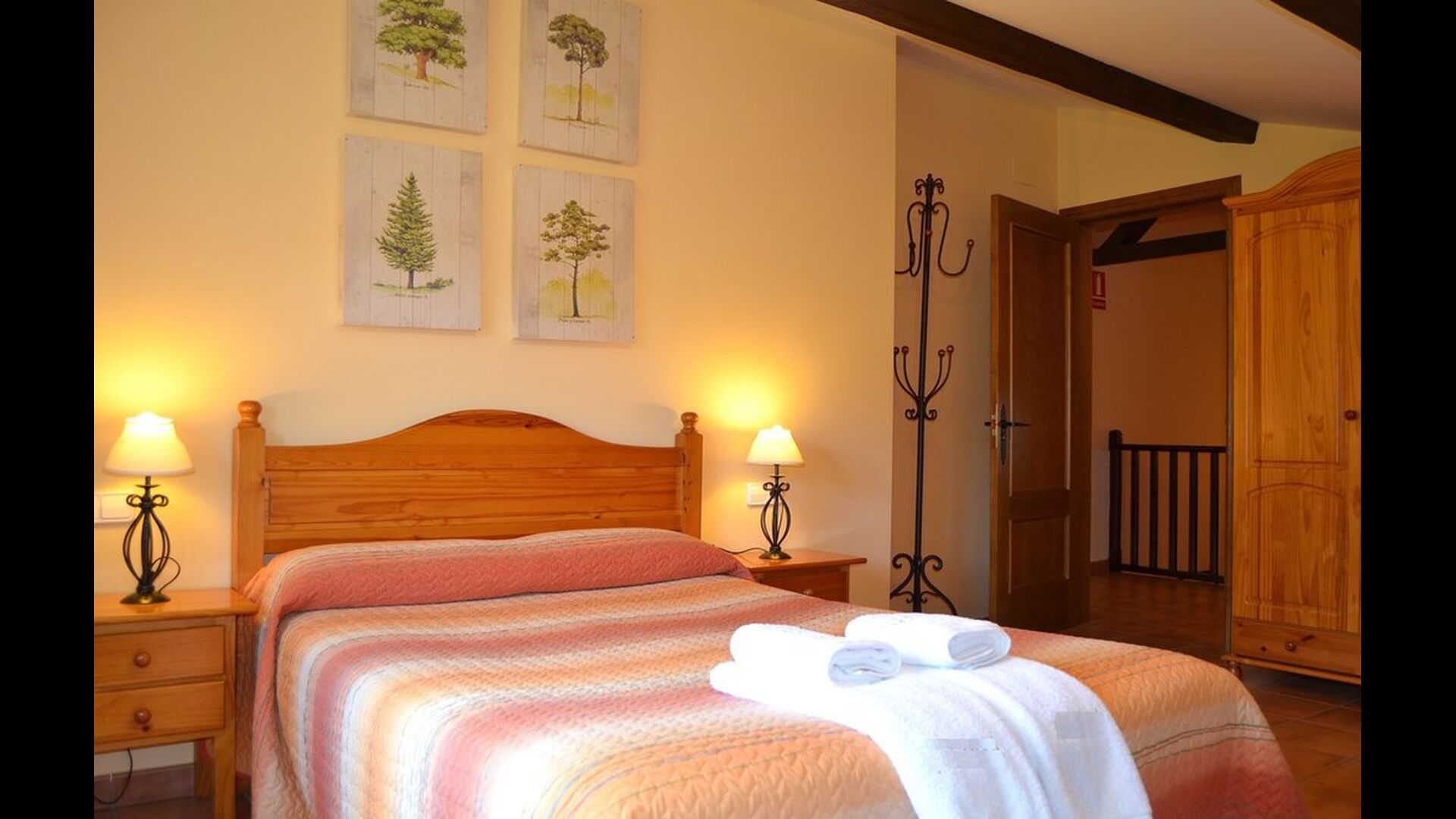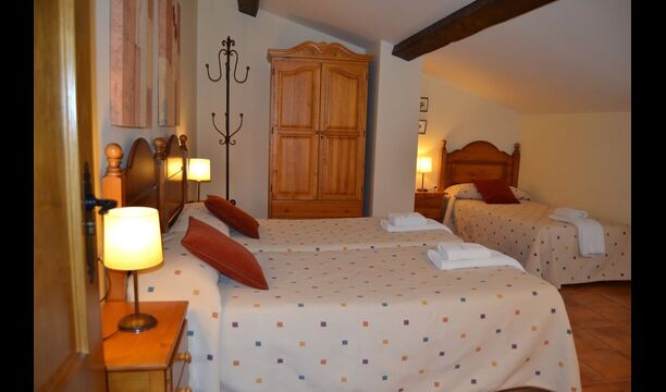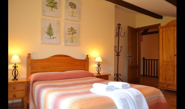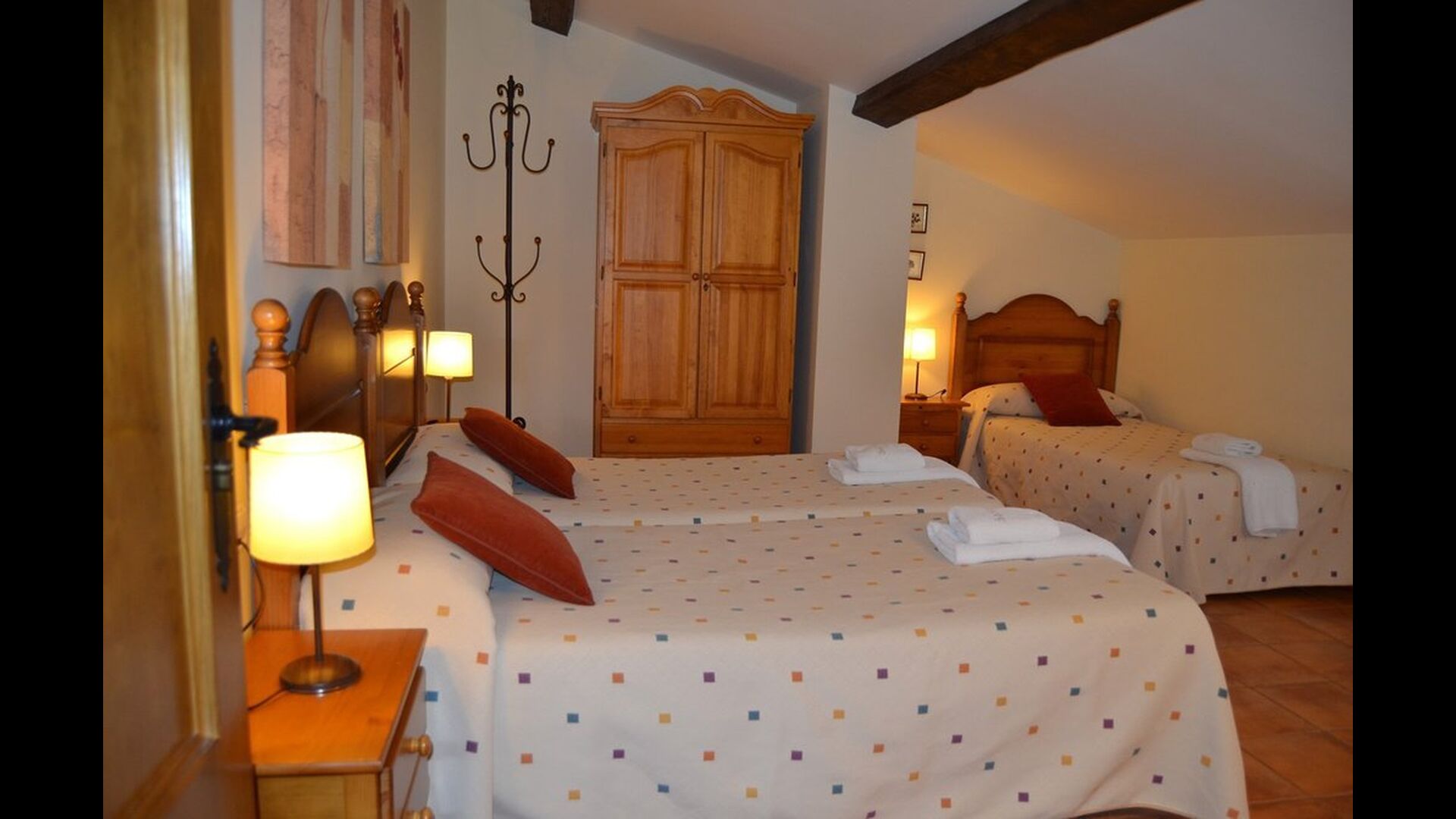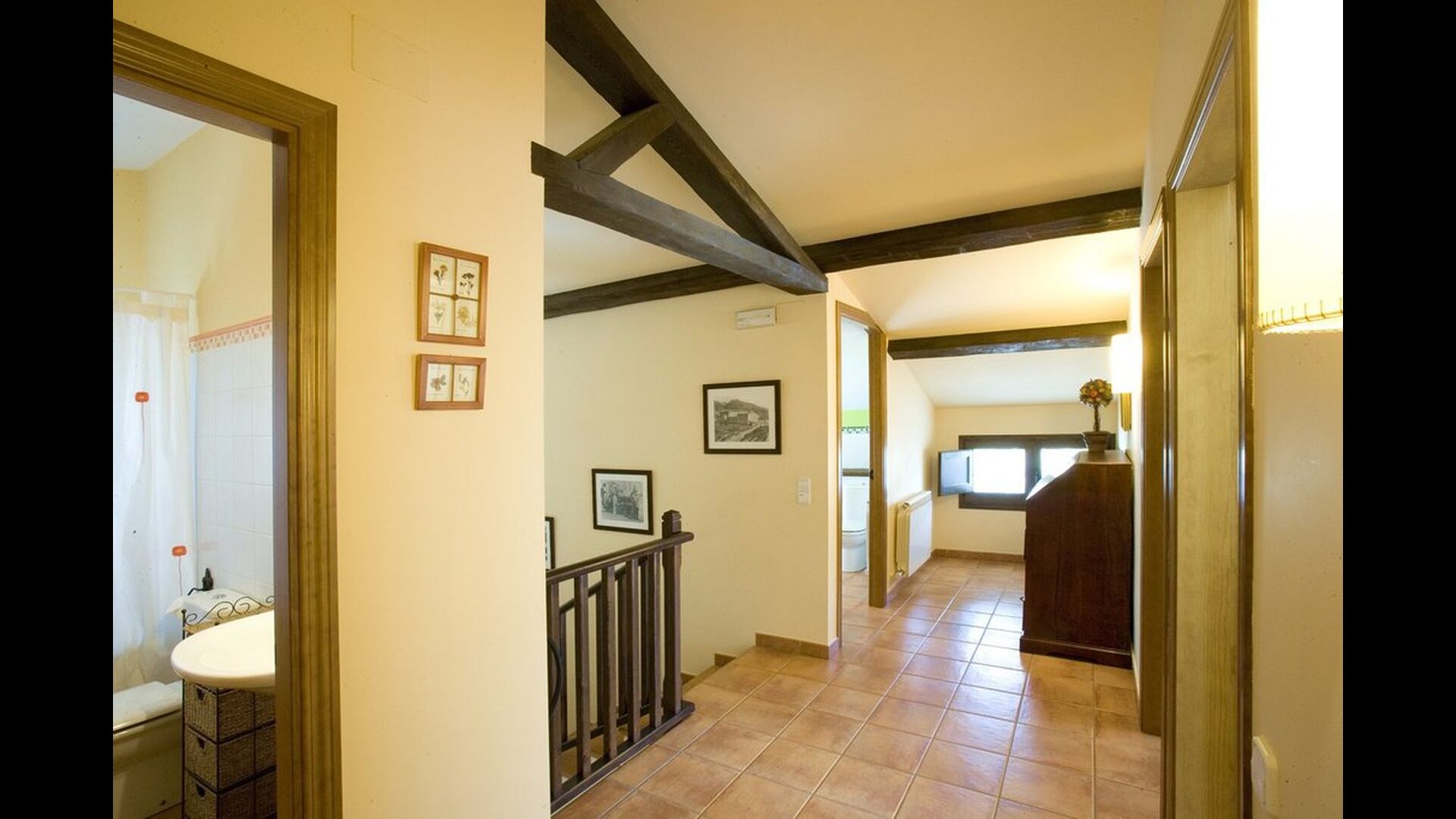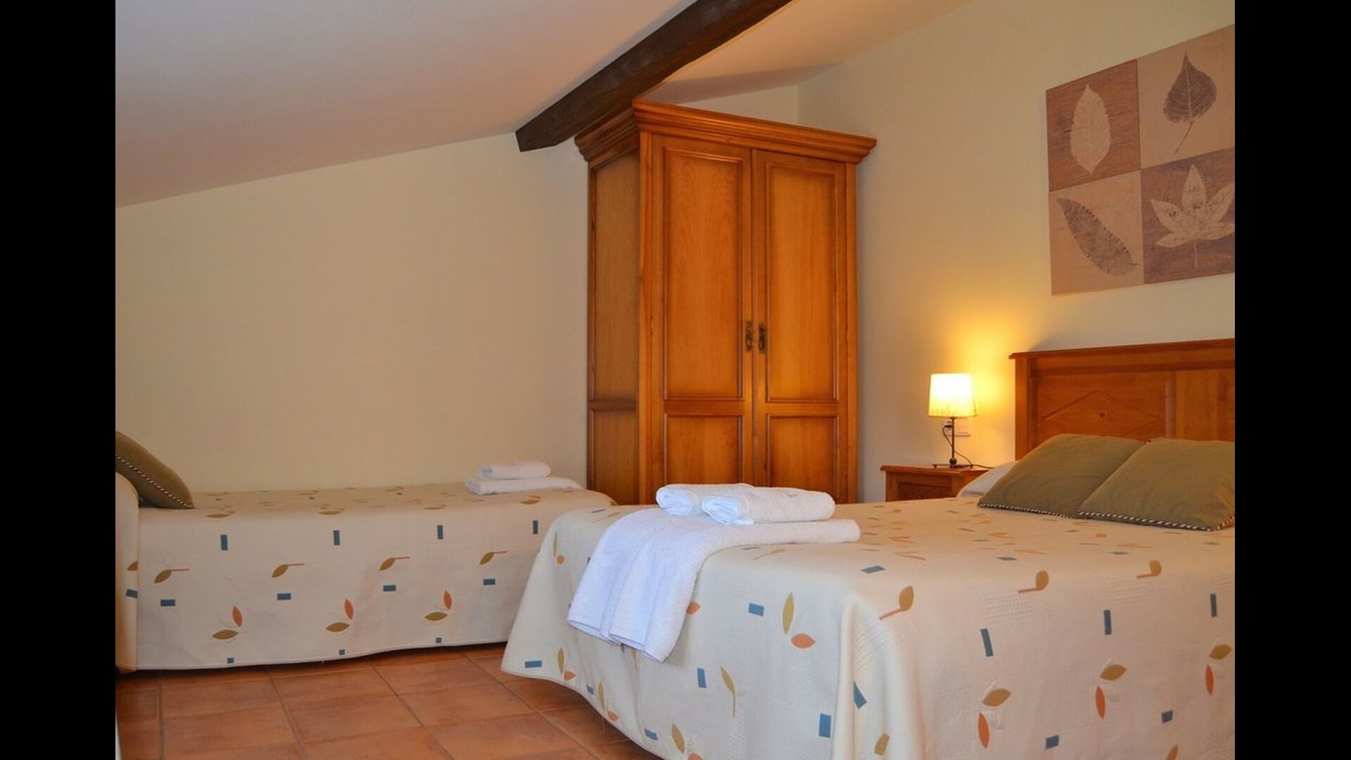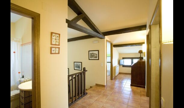 El piso superior es el área de descanso. Dispone de una habitación doble con 2 camas individuales y tres habitaciones triples, dos con 1 cama doble y 1 cama individual y una con 3 camas individuales. Todas están amuebladas con muebles modernos de estilo rústico y cómodas camas. Hay dos baños, uno con ducha y otro con bañera.
