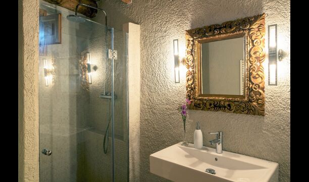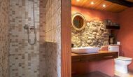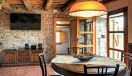 Al entrar por la puerta principal, hay una acogedora sala de estar con sofá de cuero, sala de estar y un gran televisor de pantalla plana. Hay hermosos muros de piedra y vigas en el techo. Junto a esto, hay una cocina bien equipada con dos refrigeradores, congelador grande, microondas, horno, cafetera, lavavajillas y mucho más. Conectado a la cocina, hay un acogedor comedor con una bonita mesa tallada en una sola pieza de madera y acceso directo al jardín.