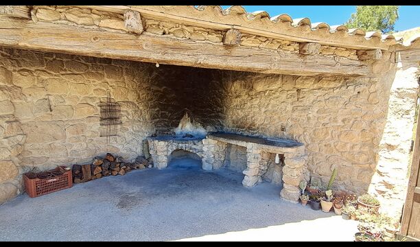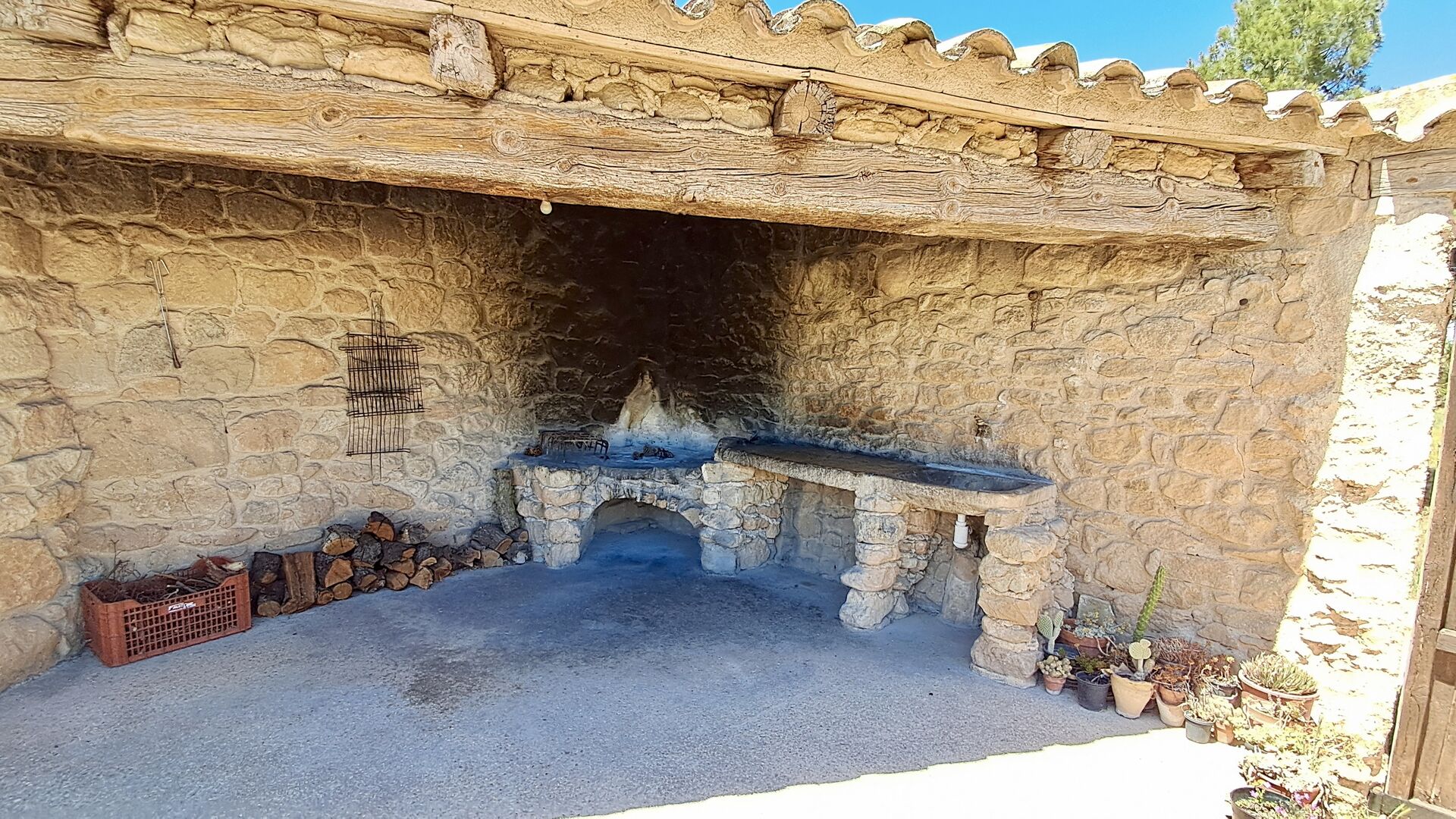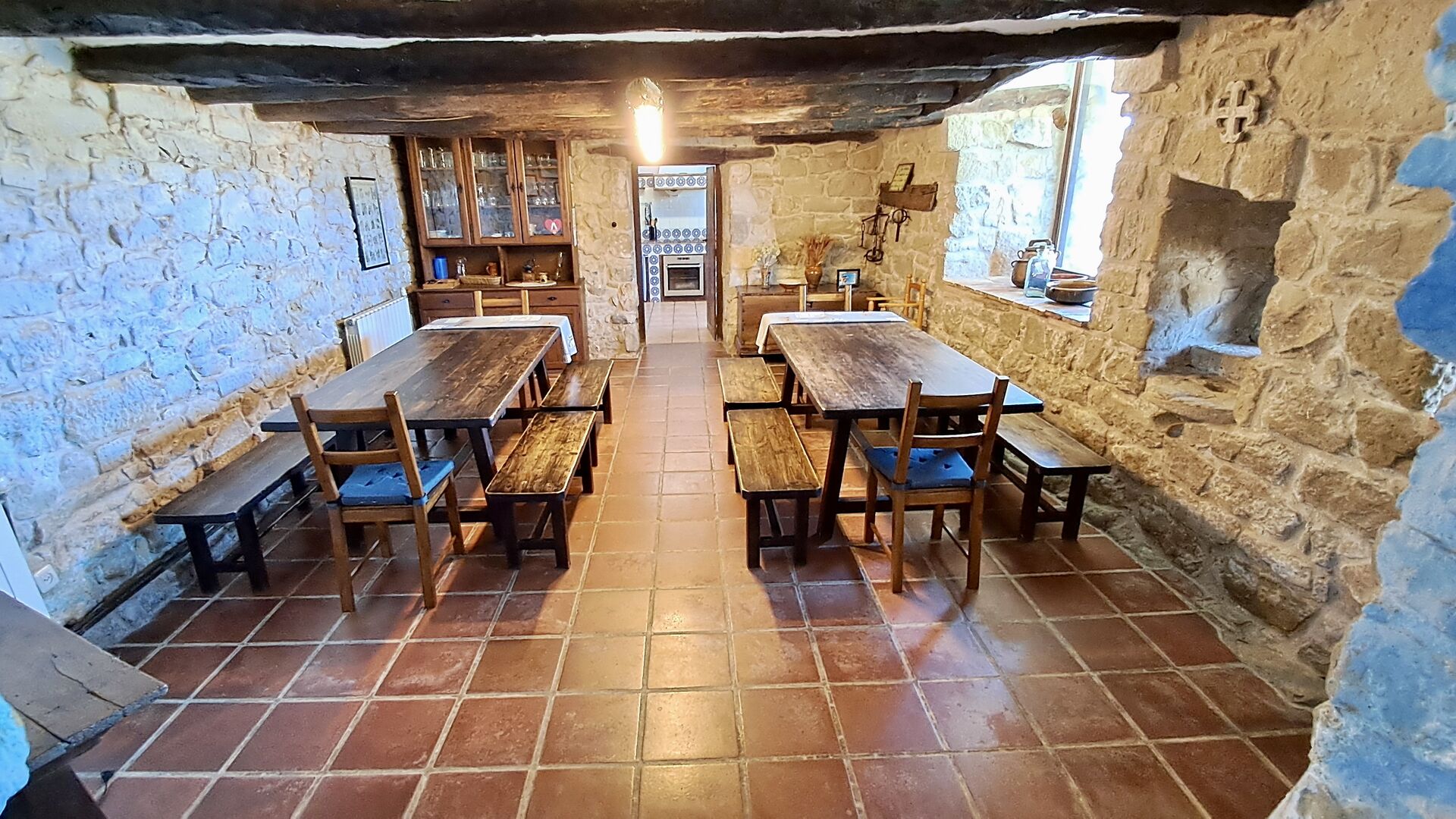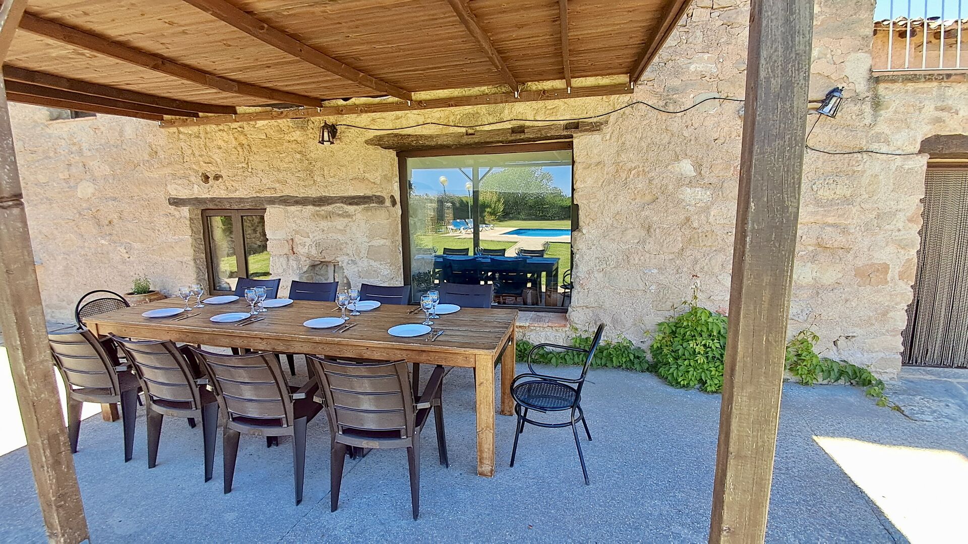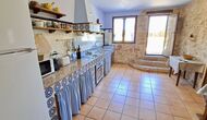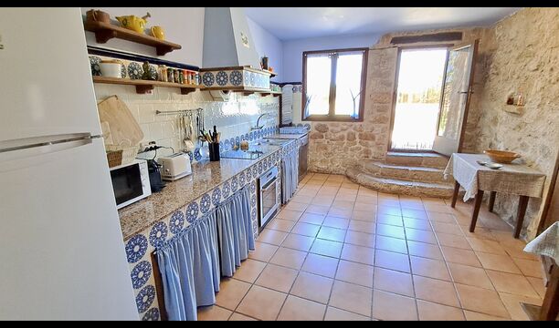 Desde el gran jardín con piscina y camas de flores pequeñas, se puede llegar a la cocina por la entrada directa desde la terraza. La cocina es de estilo clásico catalán con las instalaciones de cocina necesarias. Muchas de las partes más auténticas y desgastadas todavía están en la casa de vacaciones y le dan a la casa un estilo muy clásico. Es perfecto para aquellos que valoran el toque histórico y no les importa que no todos los detalles estén actualizados y sean nuevos. En la planta baja también hay una habitación adicional con plancha, tabla de planchar, lavadora, nevera adicional y congelador. Hay acceso al comedor interior desde la cocina.