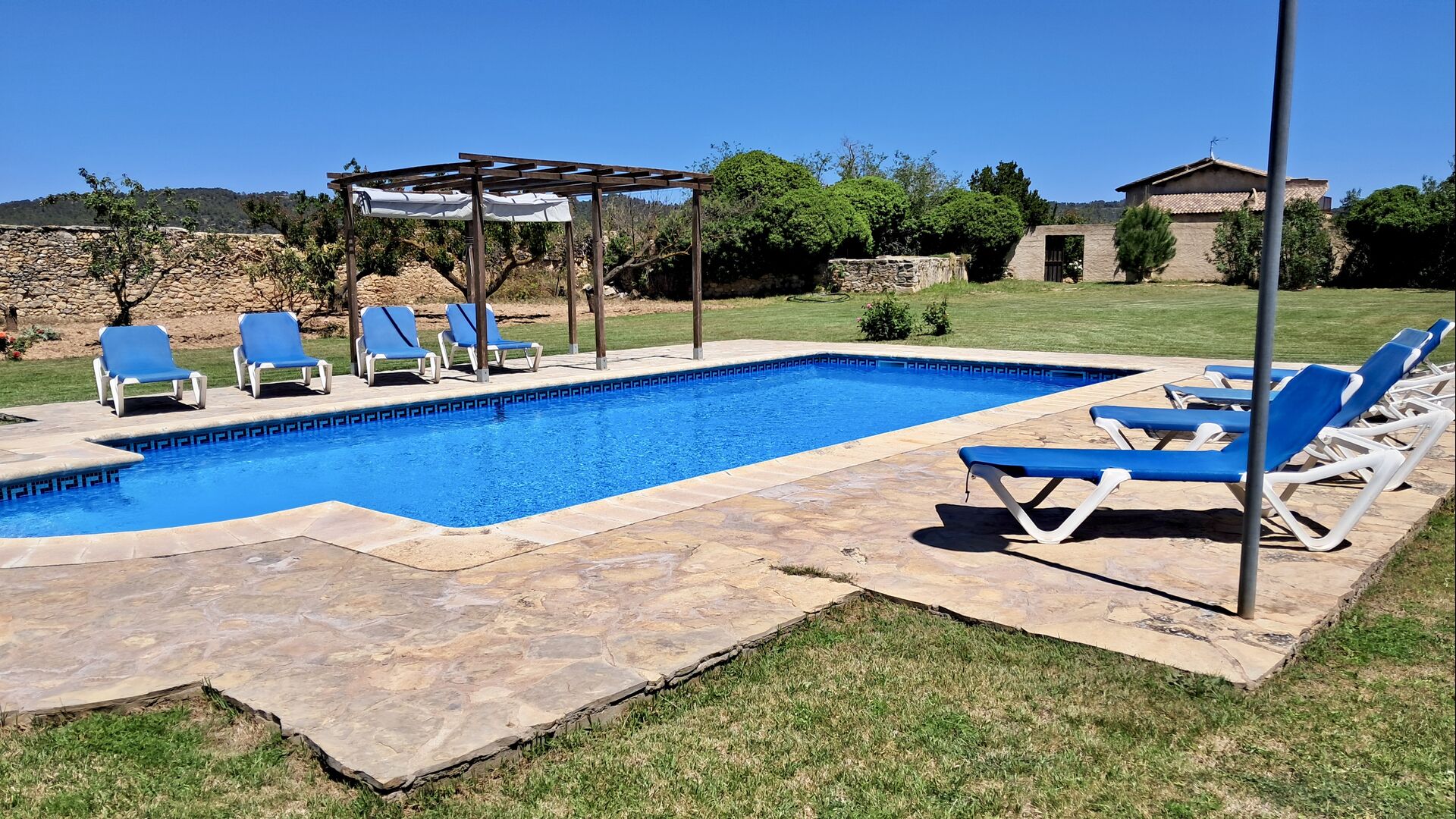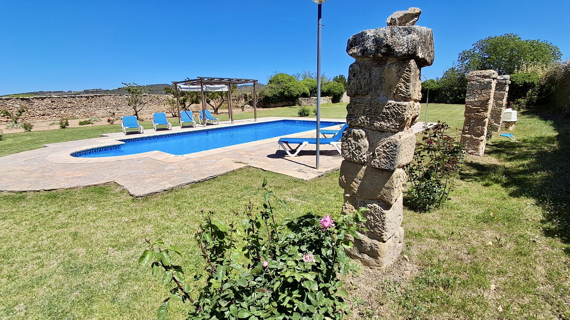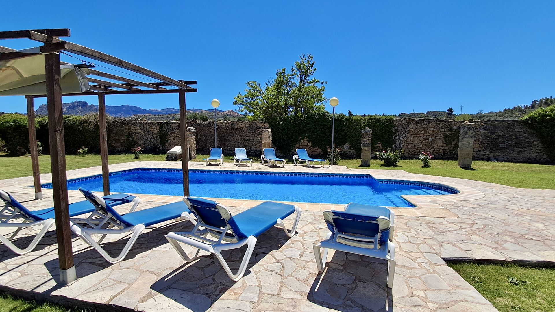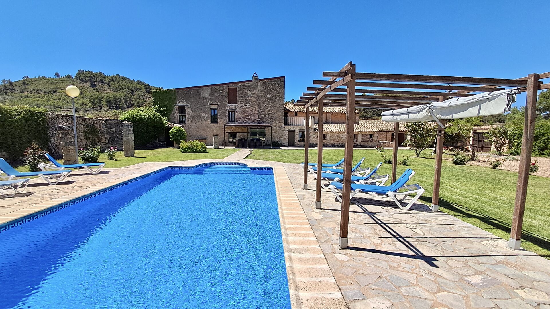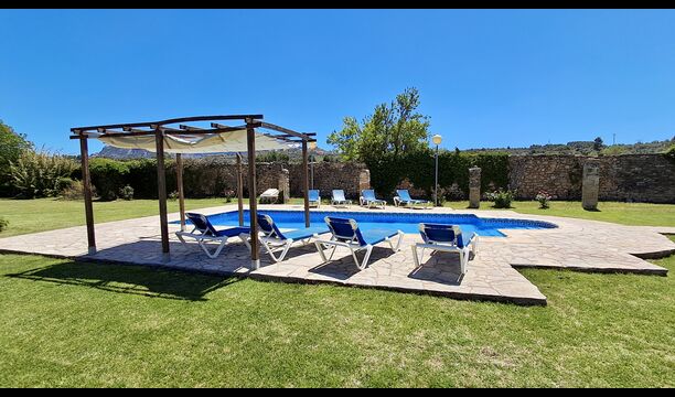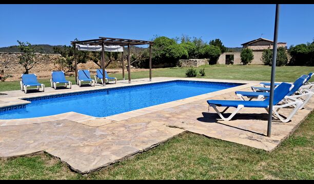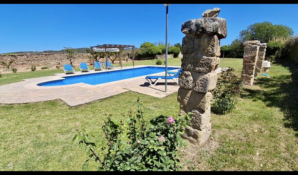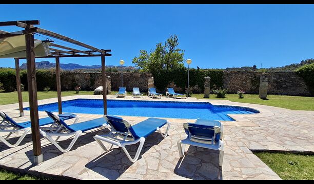 A su llegada a Mas de Rei Pedro, en primer lugar, notará las hermosas instalaciones al aire libre. En primer lugar, la gran piscina privada (50 m2) con un área de piscina circundante donde puede disfrutar de los días cálidos, ya sea con un buen libro en las muchas tumbonas o jugando y nadando en el agua refrescante. La ciudad está ubicada en una colina, y desde el jardín se puede disfrutar de la vista de los encantadores tejados.