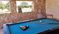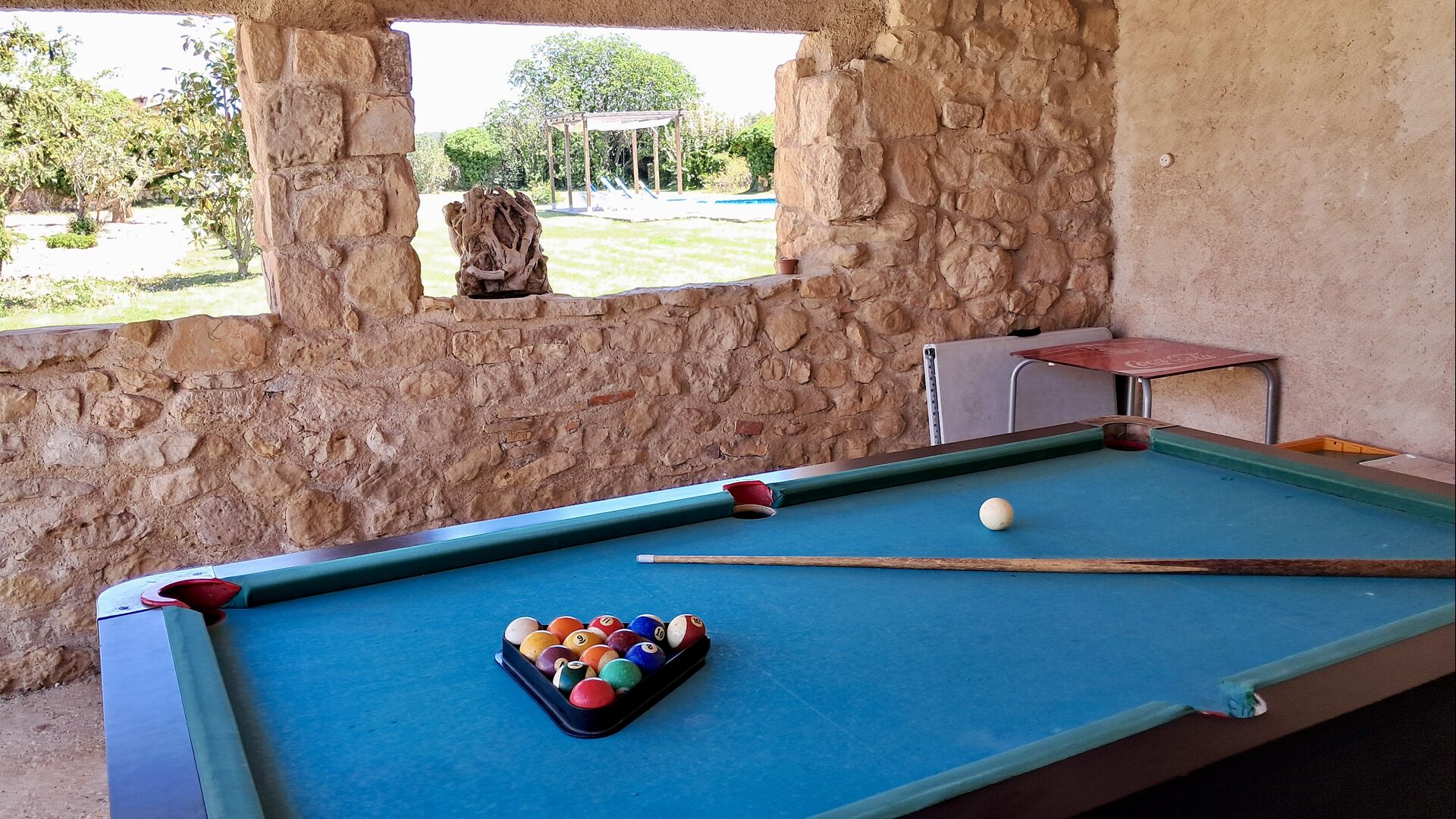 Terraza exterior con barbacoa y mesa de billar.