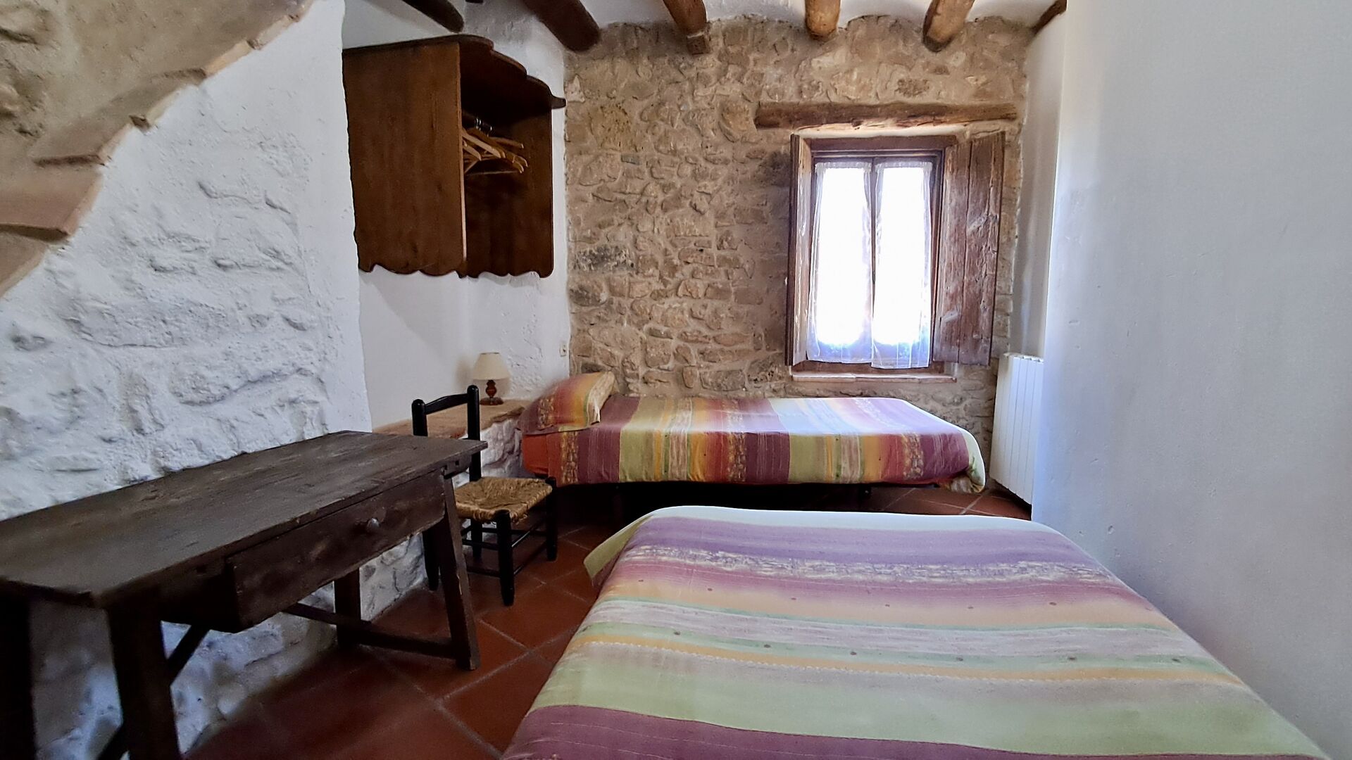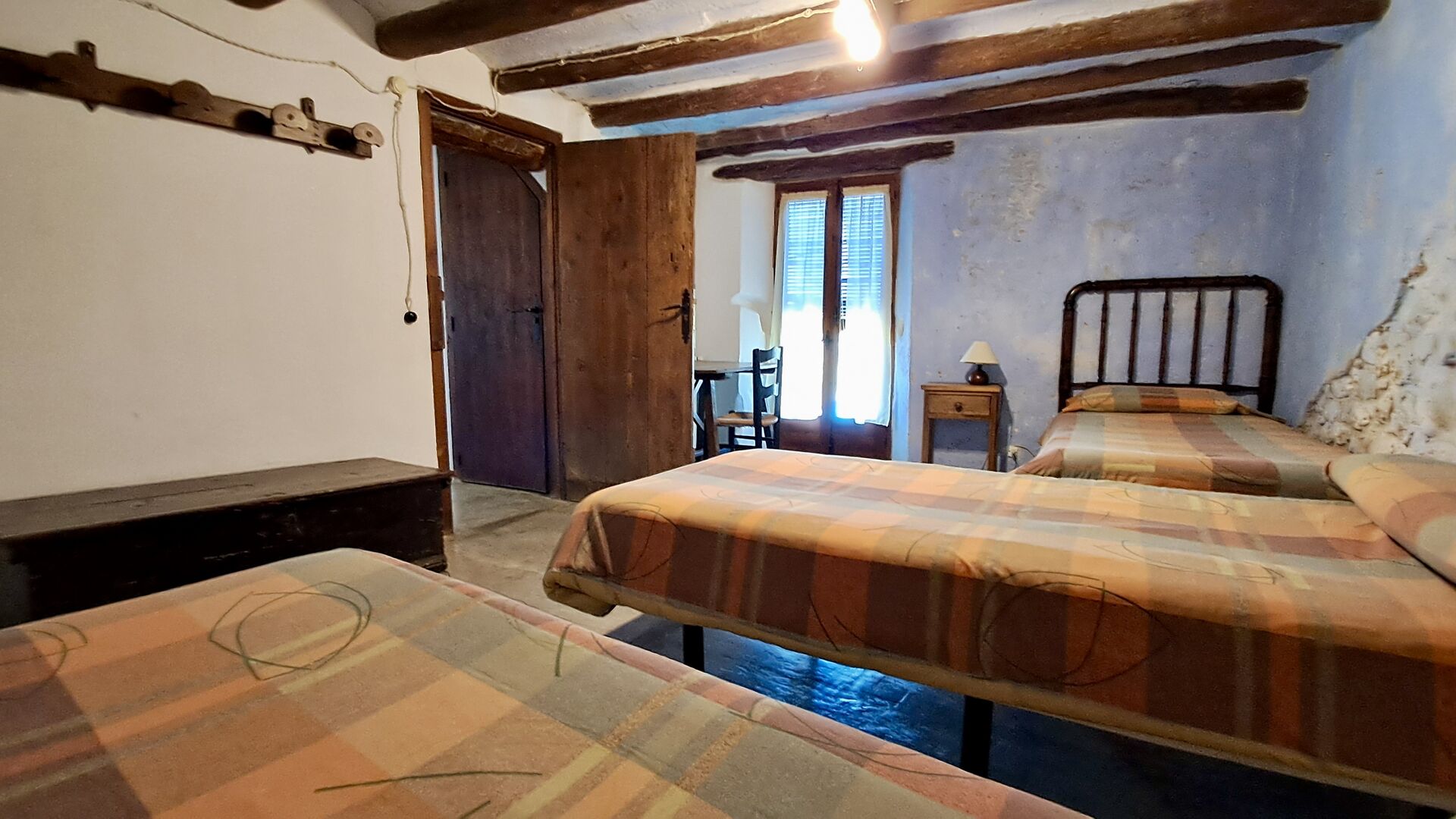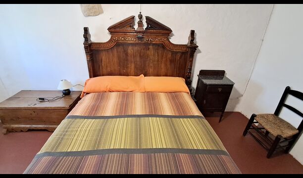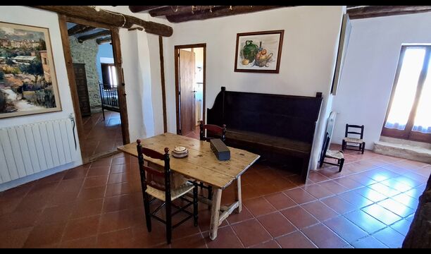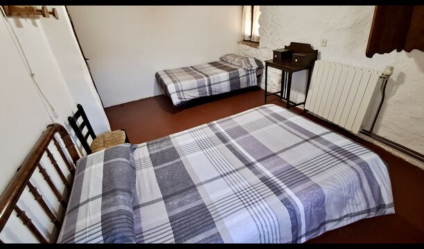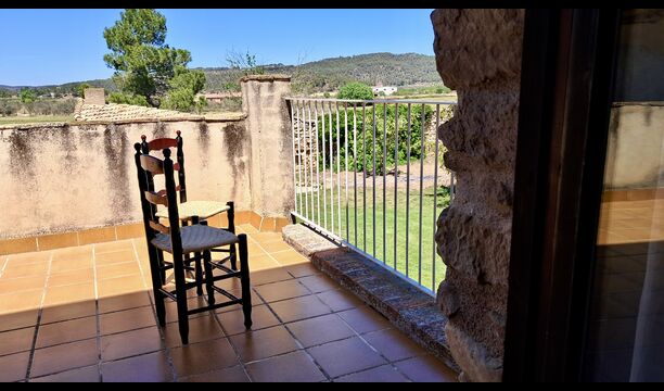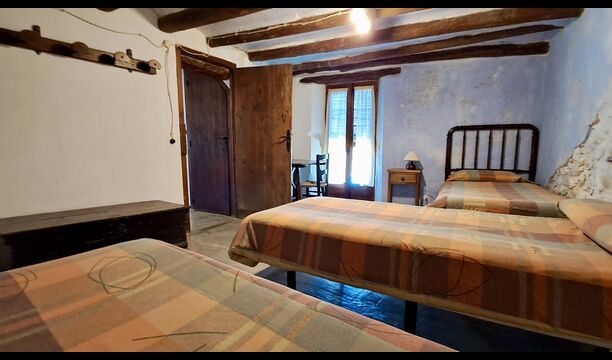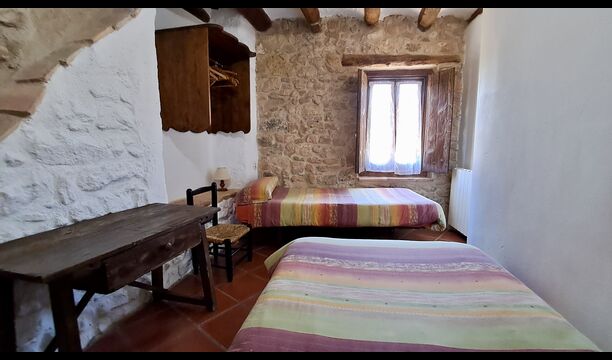 En la planta superior hay un total de cinco habitaciones, incluidas 4 habitaciones dobles y 1 habitación triple. 2 de las habitaciones tienen camas dobles, 2 tienen camas gemelas y la habitación triple tiene una cama doble y una cama individual. Todas las habitaciones están decoradas en estilo antiguo agricultor catalán. Uno de los marcos de cama más bellos tiene más de 300 años y hace 200 años el rey Pedro dormía allí (los colchones, por supuesto, se han reemplazado muchas veces desde :)). En la terraza del primer piso podrá disfrutar de su café de la mañana, el sol de la tarde y la vista del jardín y la acogedora ciudad de Horta de Saint Joan en el horizonte.