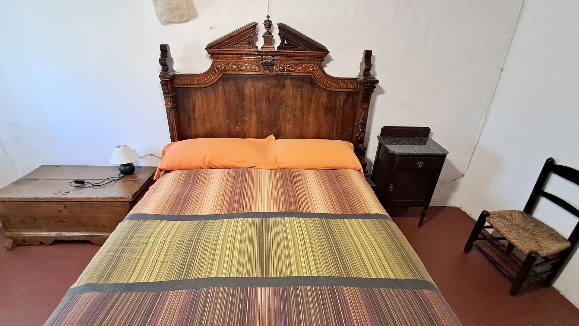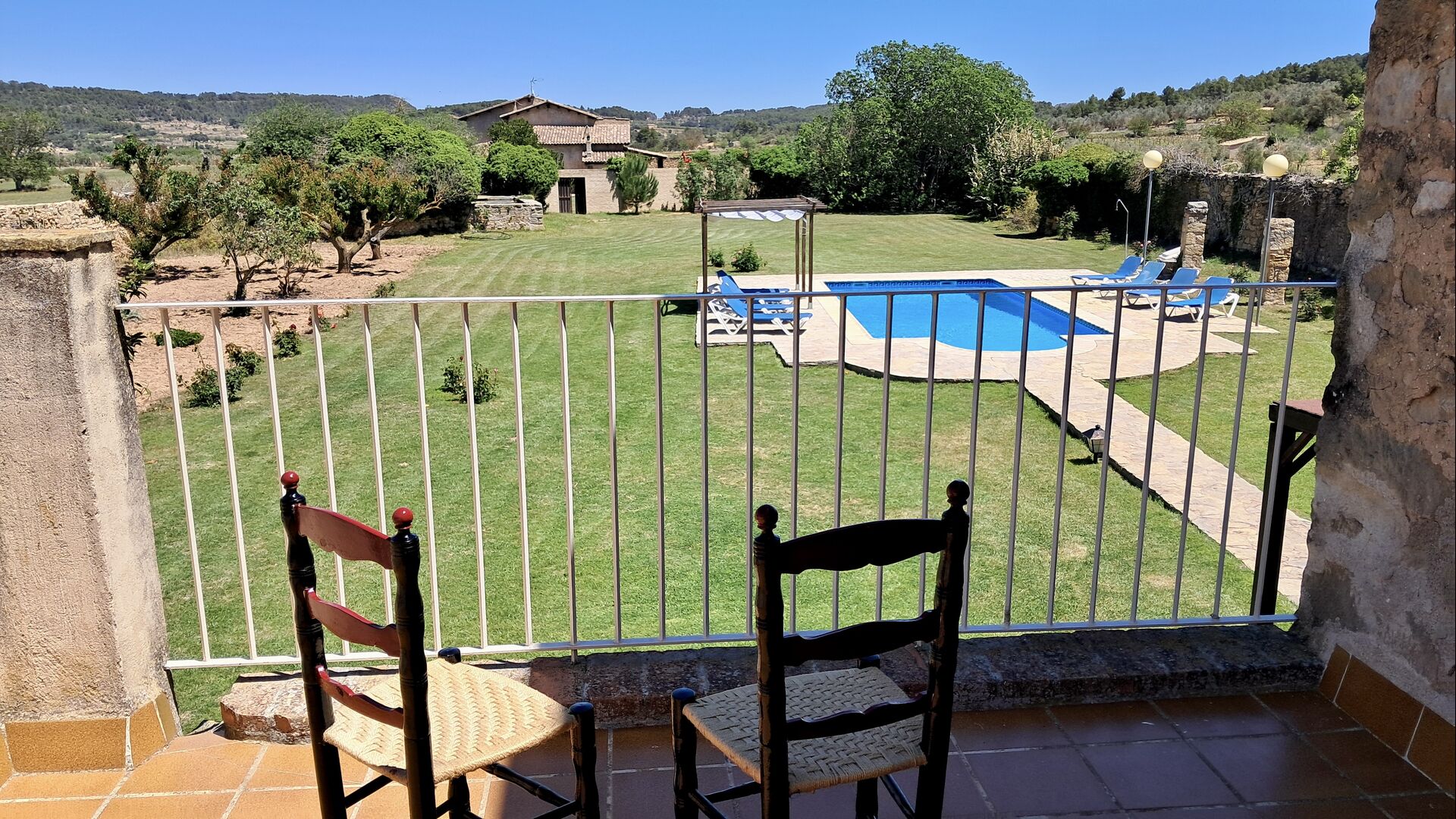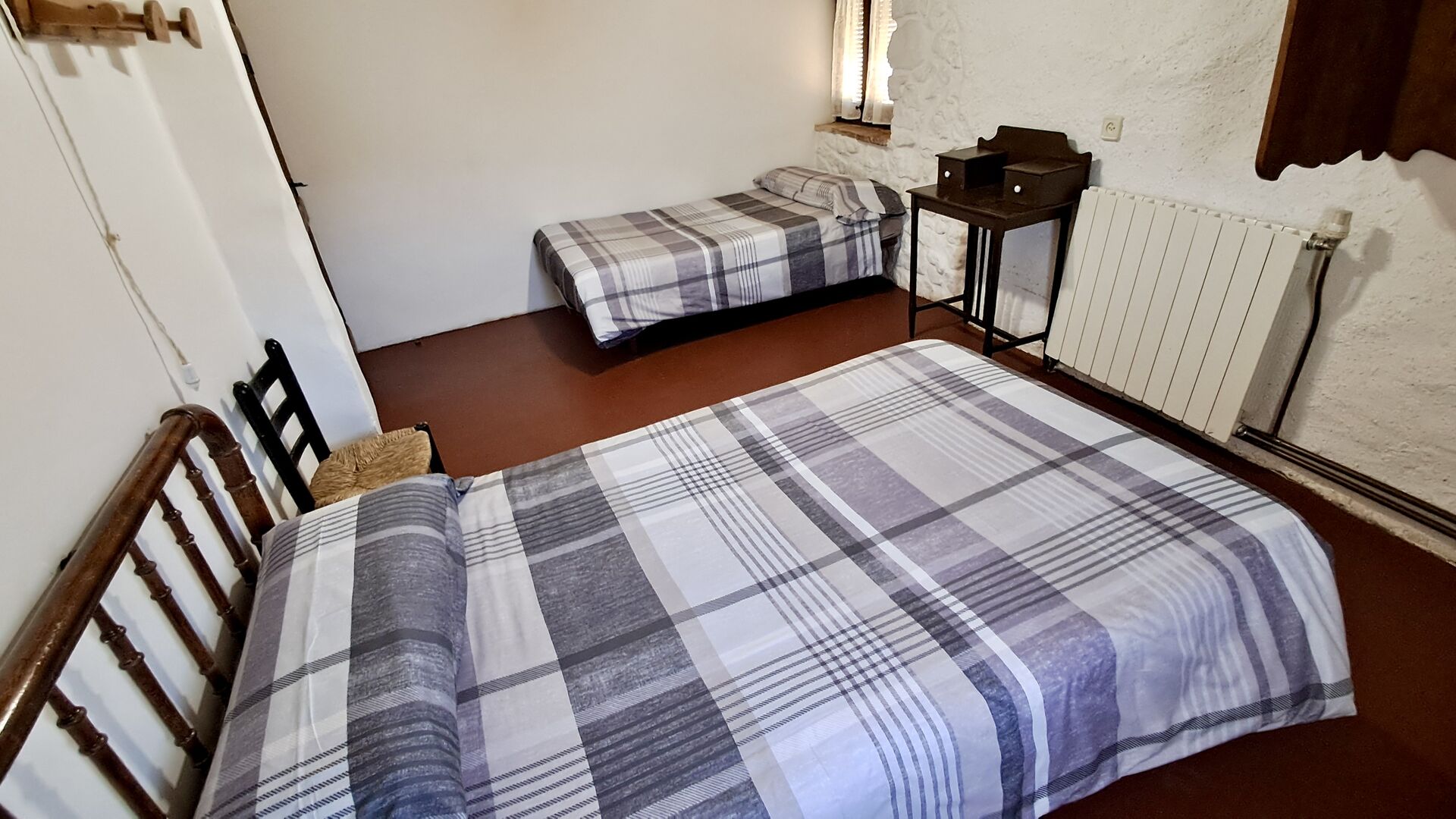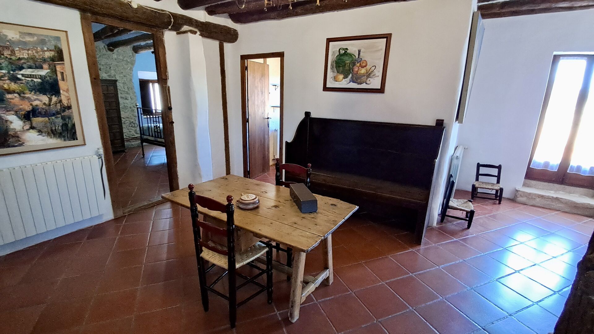 En la planta superior hay un total de cinco habitaciones, incluidas 4 habitaciones dobles y 1 habitación triple. 2 de las habitaciones tienen camas dobles, 2 tienen camas gemelas y la habitación triple tiene una cama doble y una cama individual. Todas las habitaciones están decoradas en estilo antiguo agricultor catalán. Uno de los marcos de cama más bellos tiene más de 300 años y hace 200 años el rey Pedro dormía allí (los colchones, por supuesto, se han reemplazado muchas veces desde :)). En la terraza del primer piso podrá disfrutar de su café de la mañana, el sol de la tarde y la vista del jardín y la acogedora ciudad de Horta de Saint Joan en el horizonte.
