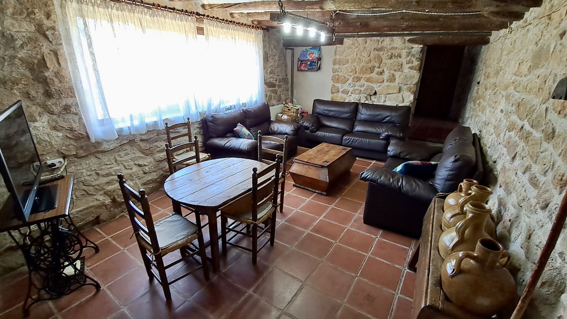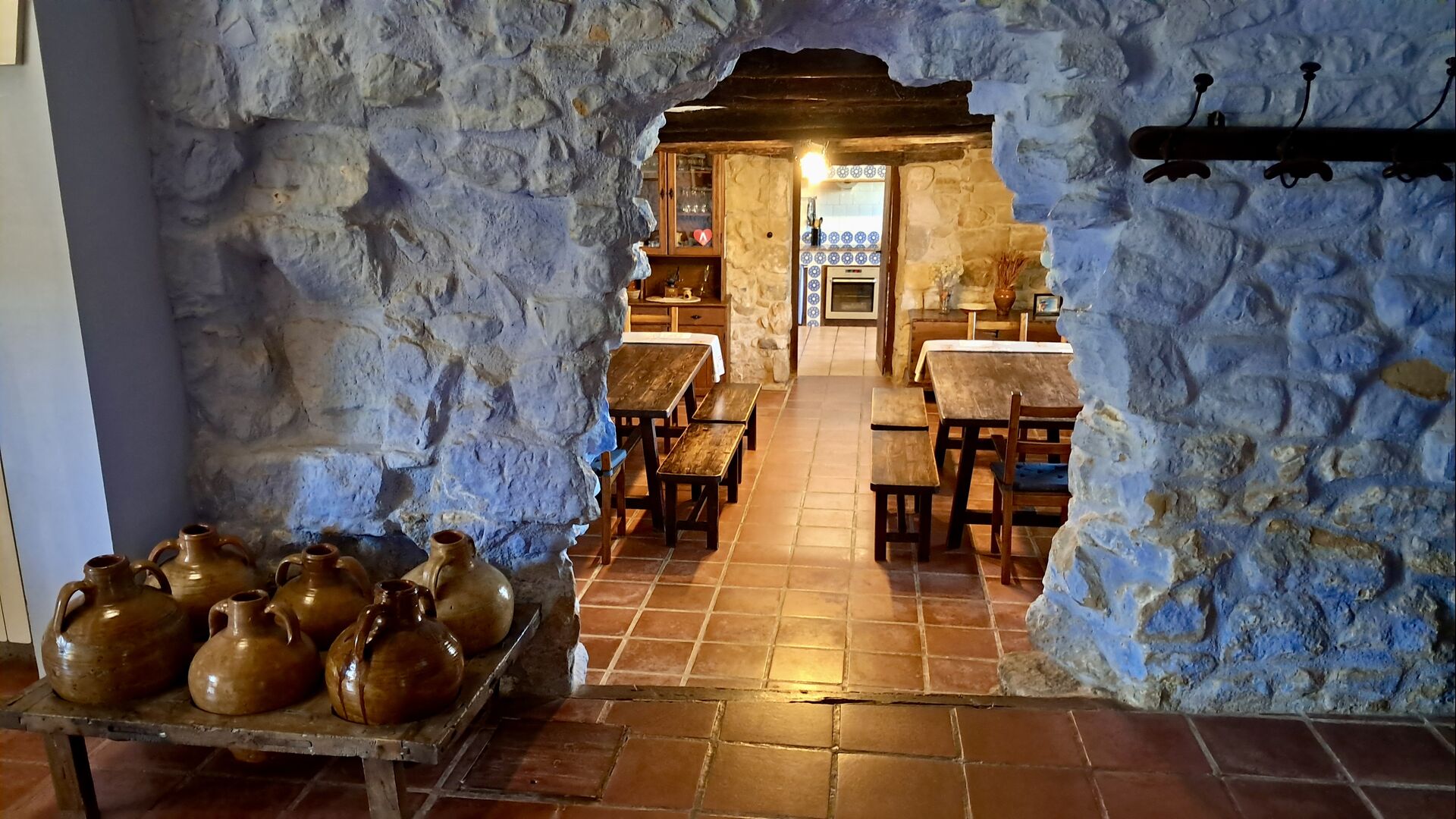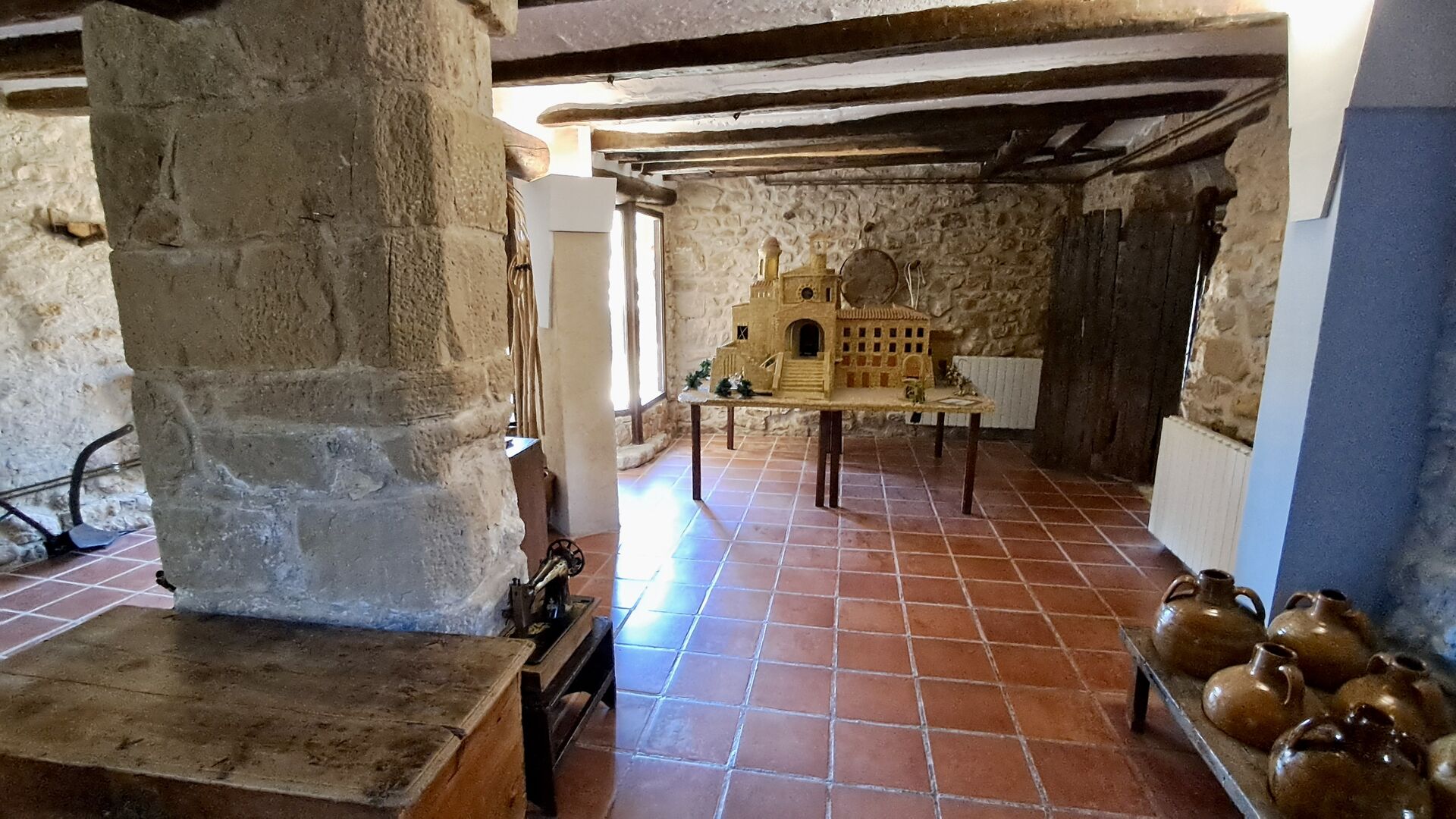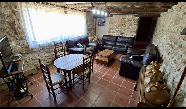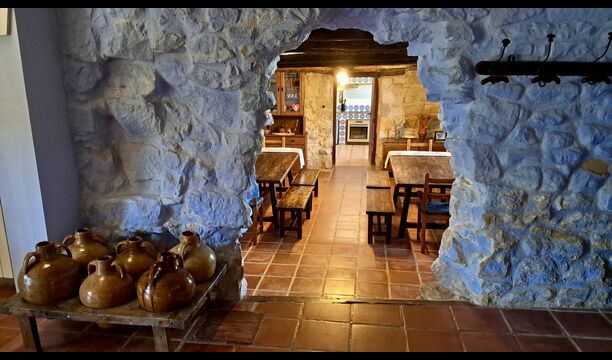 Además, la planta baja ofrece una sala de estar con sofás, pantallas planas, máquina de DVD, Wi-Fi y una característica chimenea antigua. En el Hall encontrará un área de intercambio de libros y deliciosos vinos y aceitunas locales, que puede comprar a precios justos. También se coloca un modelo del famoso monasterio Convento de SantSalvador en el salón (el monasterio se encuentra en la cercana ciudad de Horta de Sant Joan). En la pared del pasillo cuelgan herramientas agrícolas antiguas y antiguas que enfatizan el estilo tradicional del agricultor catalán del edificio.