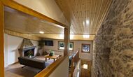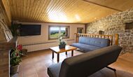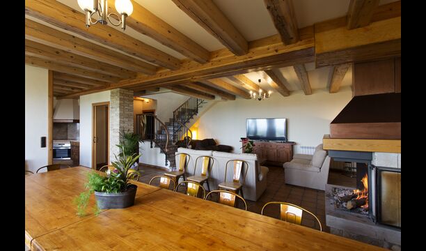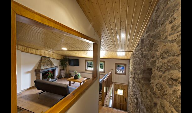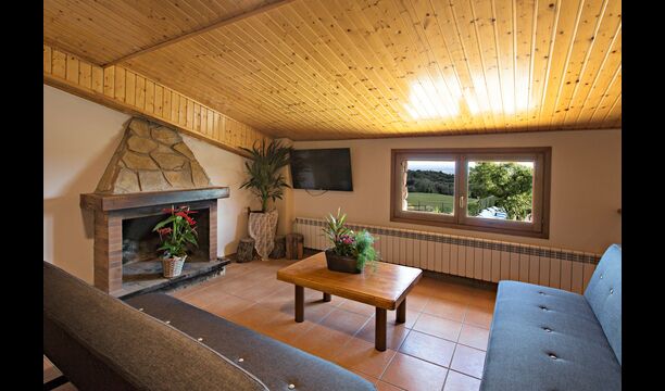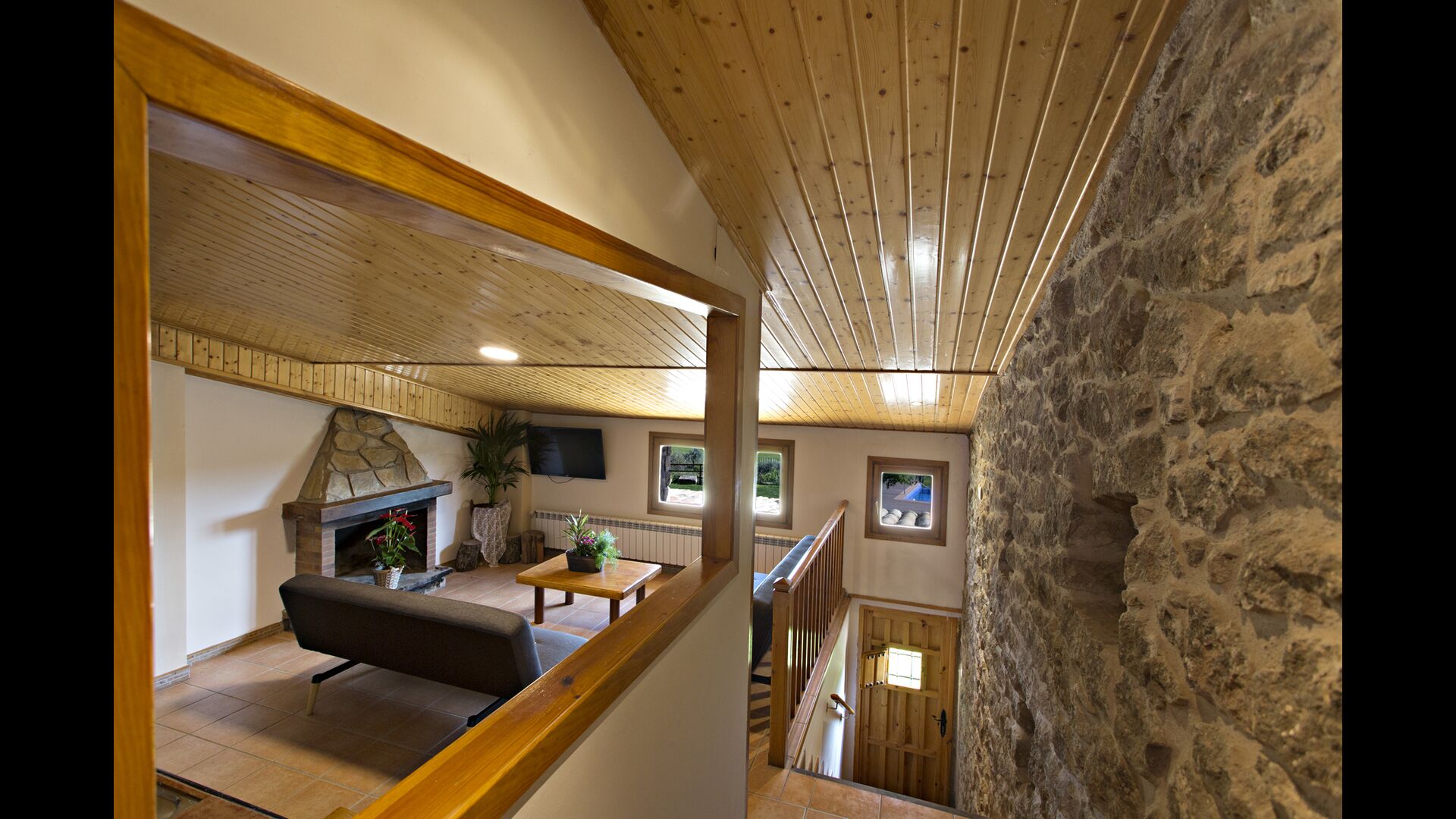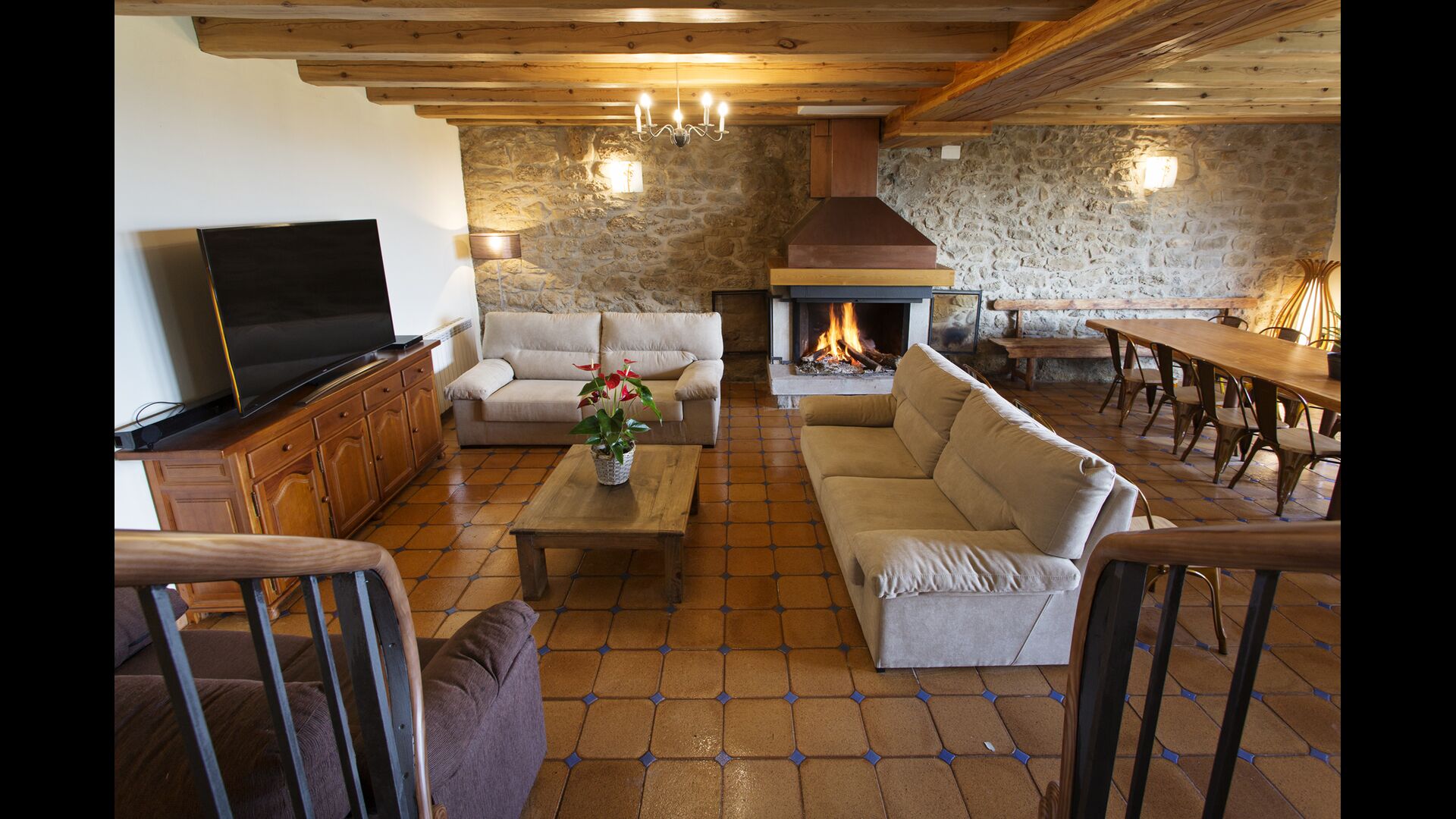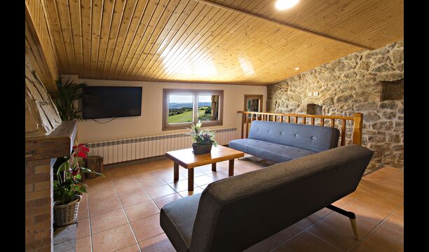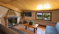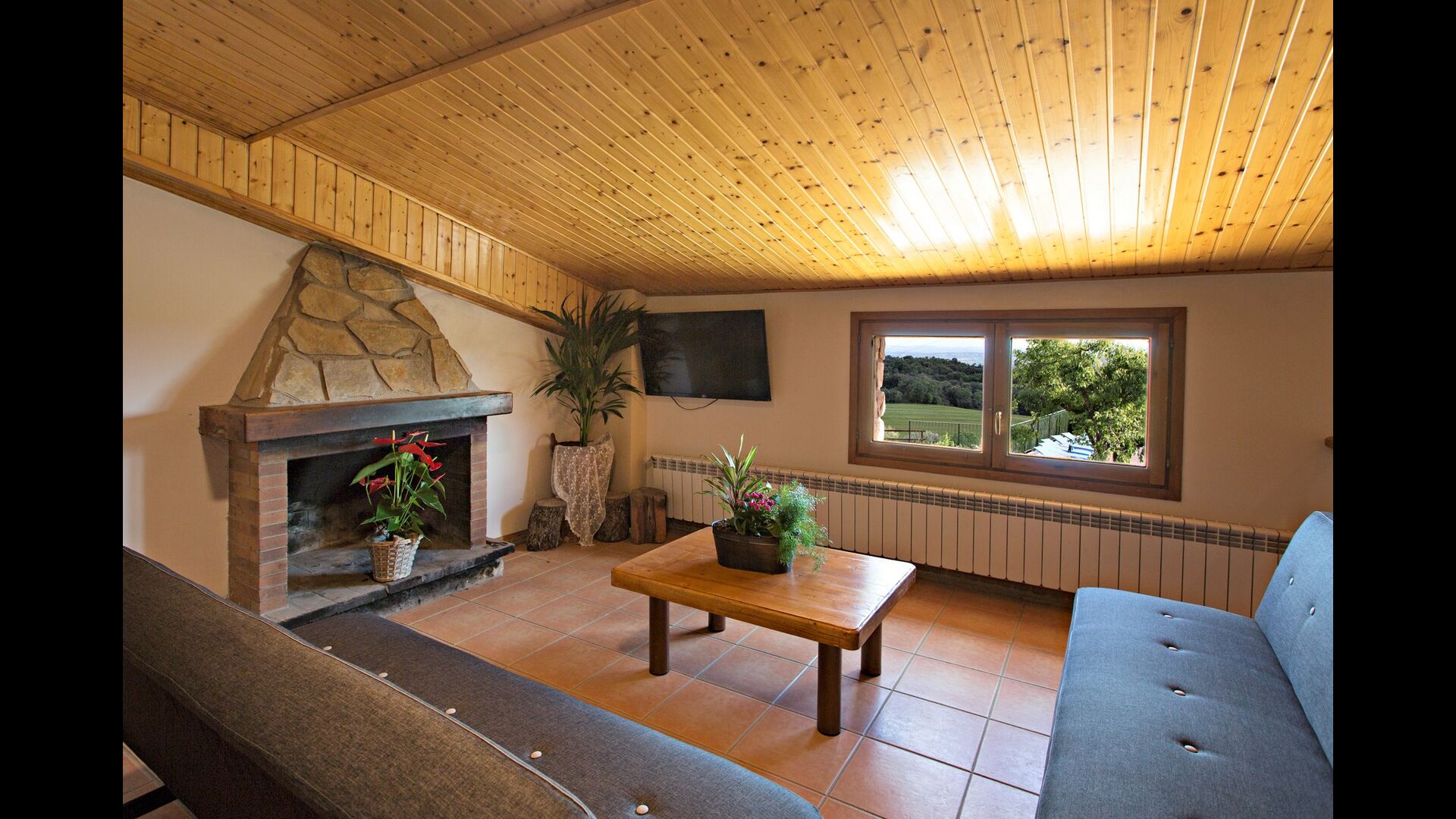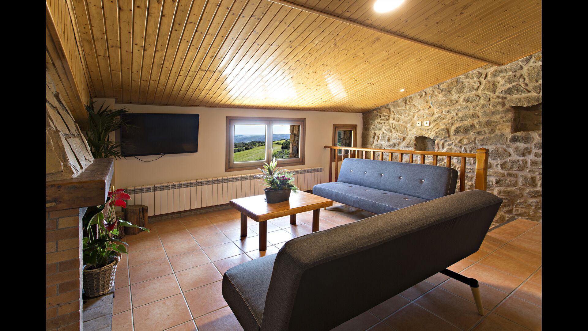 En la parte de arriba, encontramos otra sala de estar con T V, sofás para pasar buenos ratos descansando. En esta sala también hay chimenea.