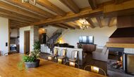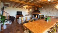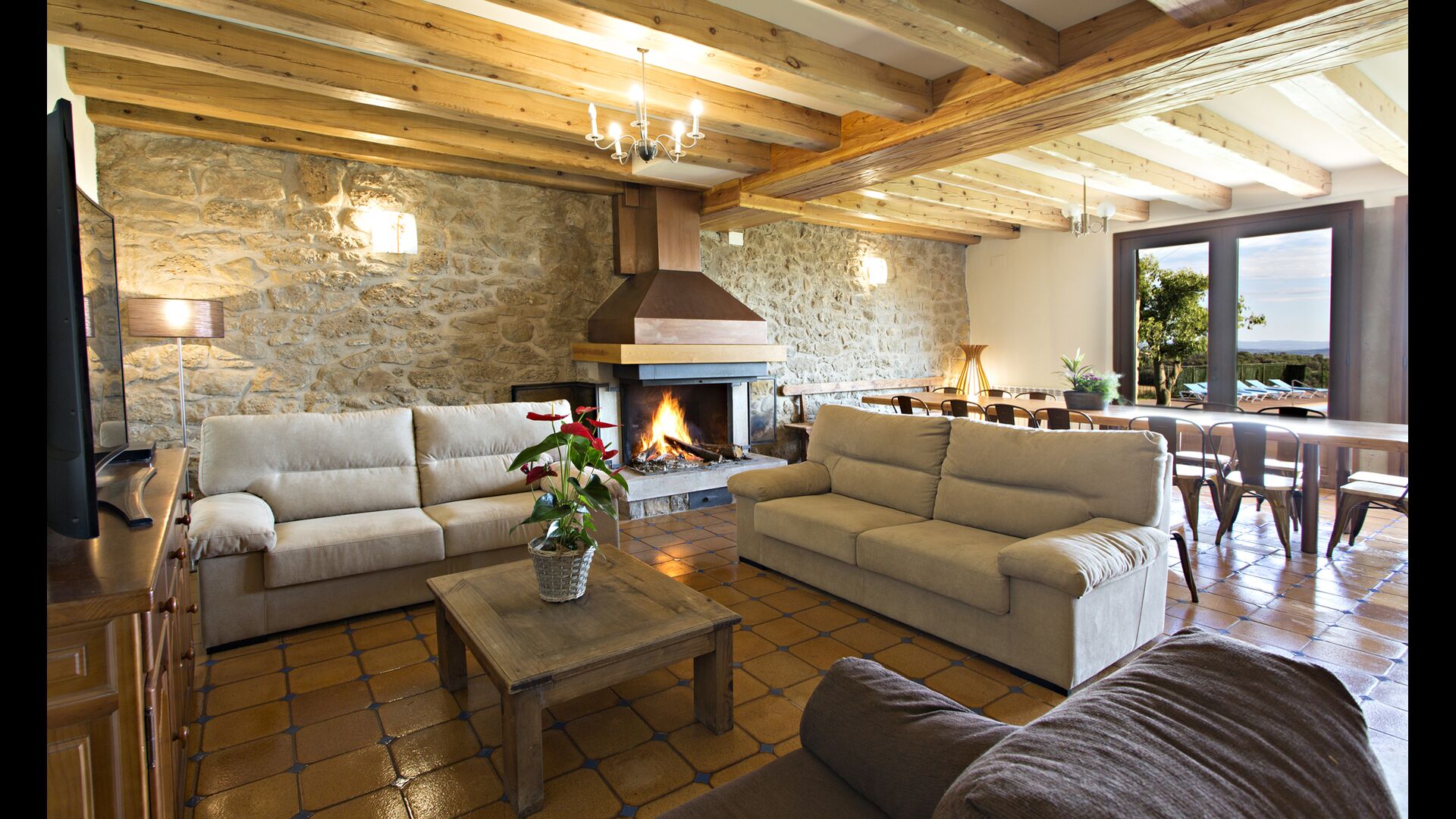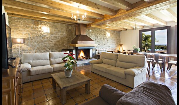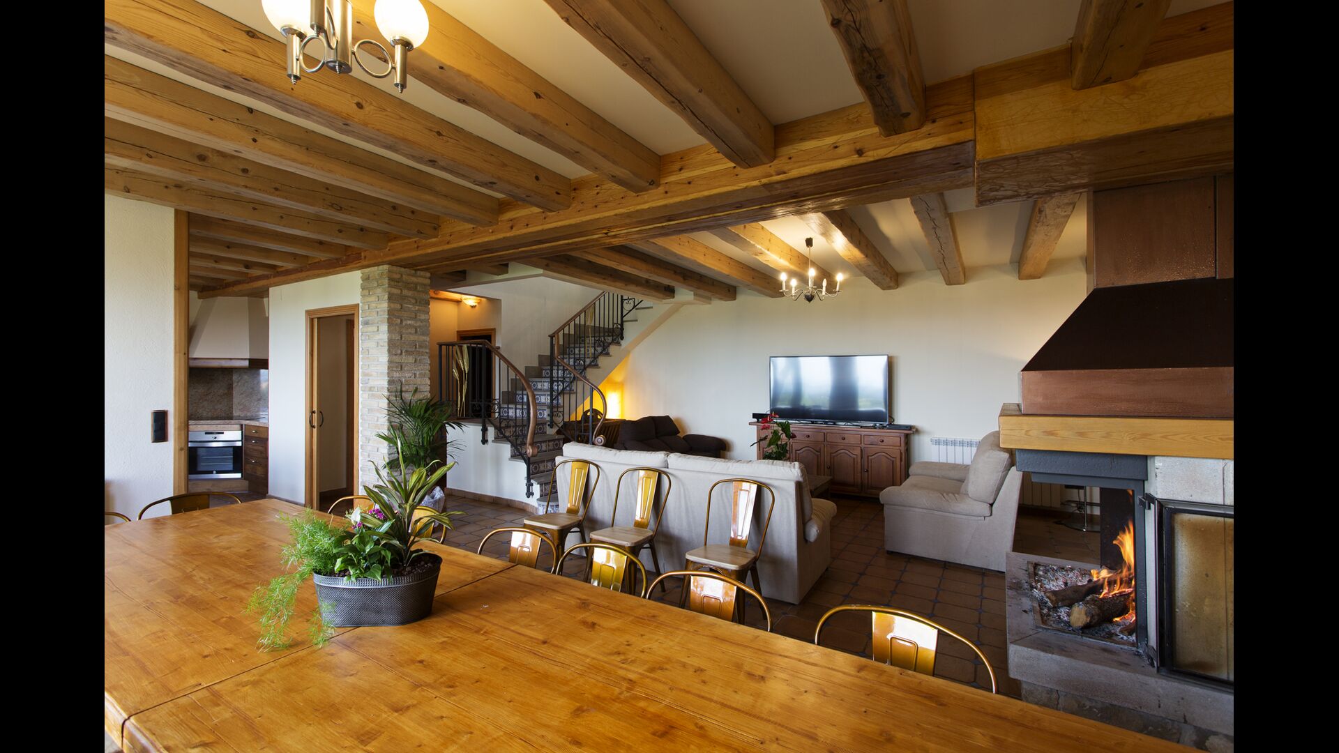 Encontramos un espacioso comedor con sofás y una mesa grande para 20 comensales con chimenea , TV de 60 ', DVD, BluRay y con unas vistas espectaculares en la zona de piscina. Junto al comedor encontramos la cocina, totalmente equipada , con lavavajillas, 2 microondas, horno, nevera, congelador, cafetera dolce gusto, nespresso, tostadora, ...