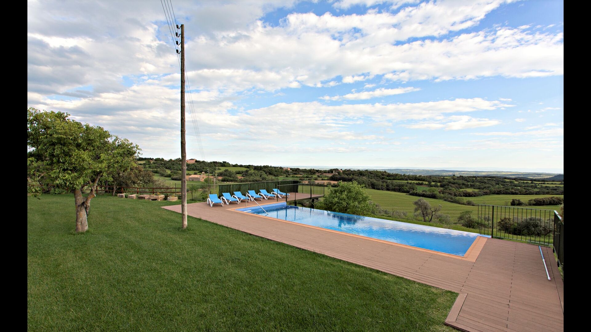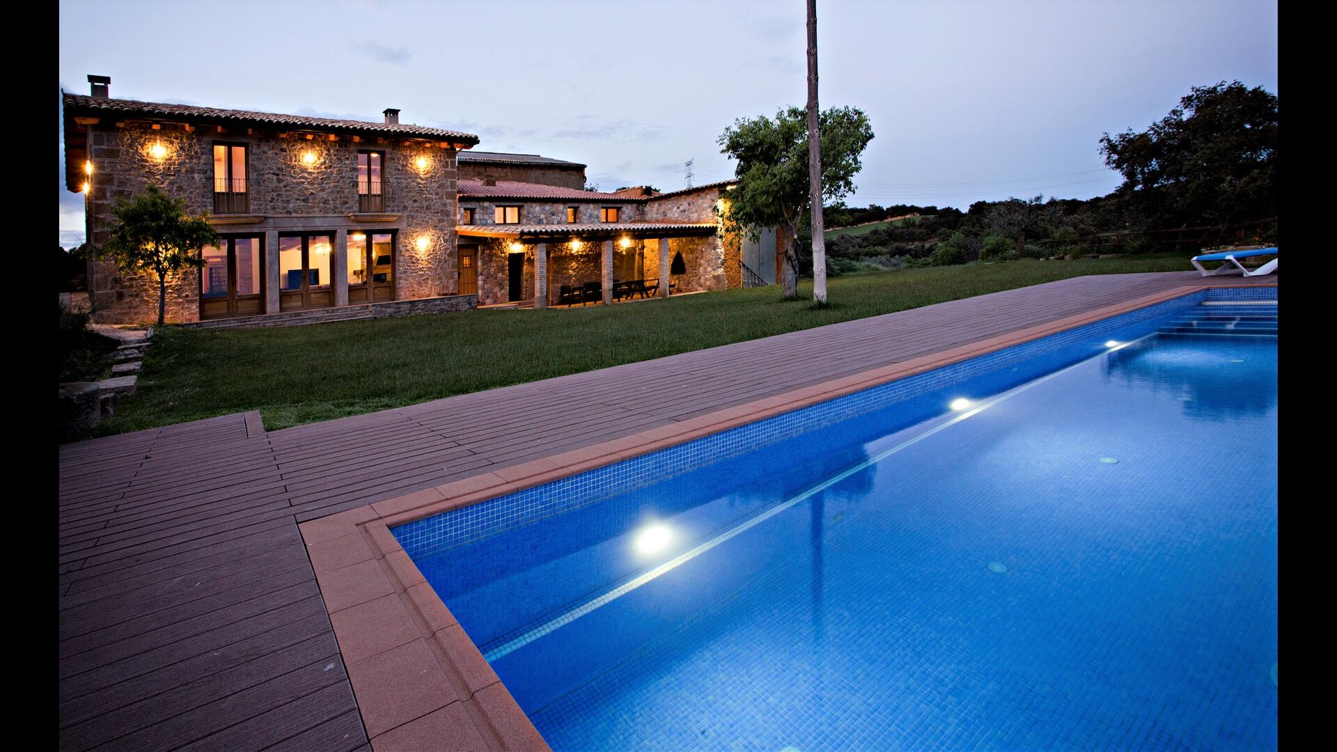 En el exterior de la finca encontramos una gran zona ajardinada con una piscina con pared de vidrio, porche con barbacoa y mobiliario de jardín.