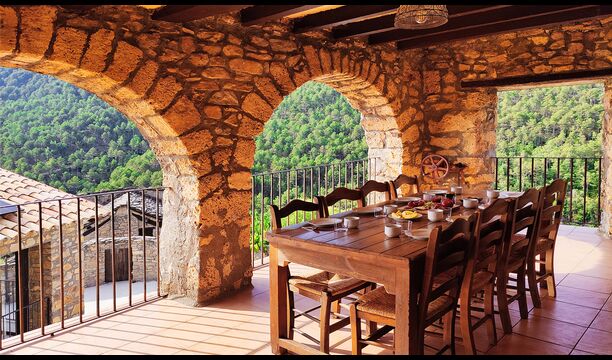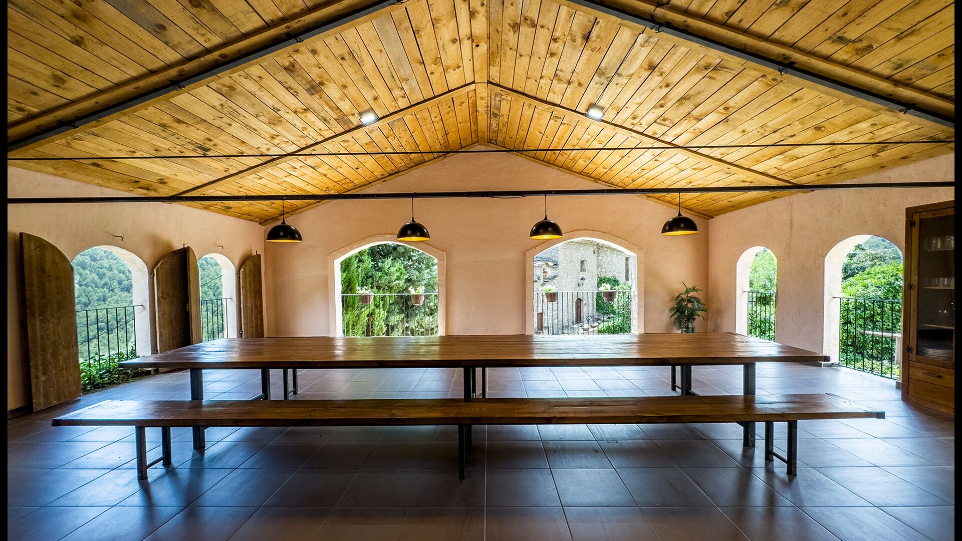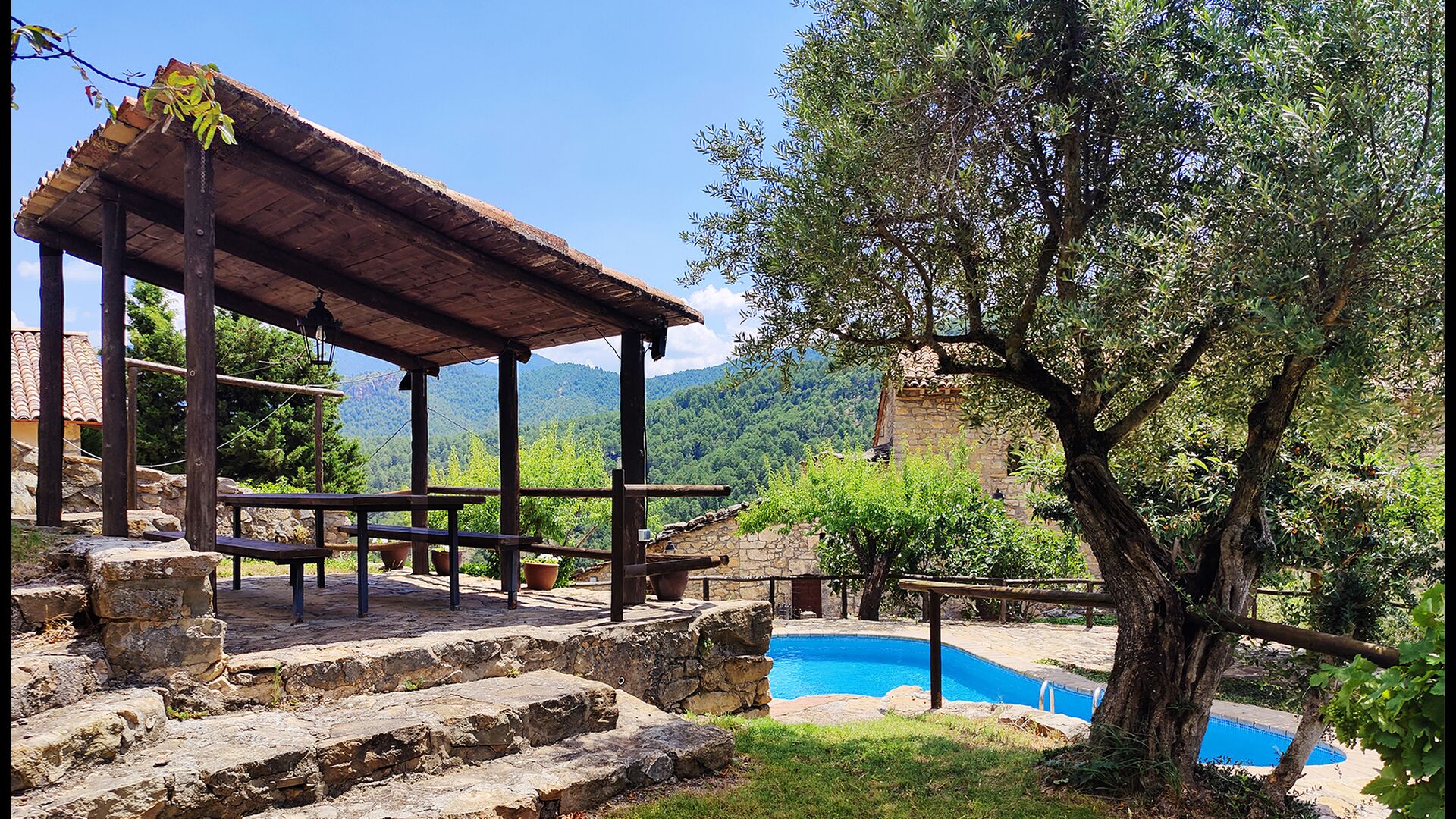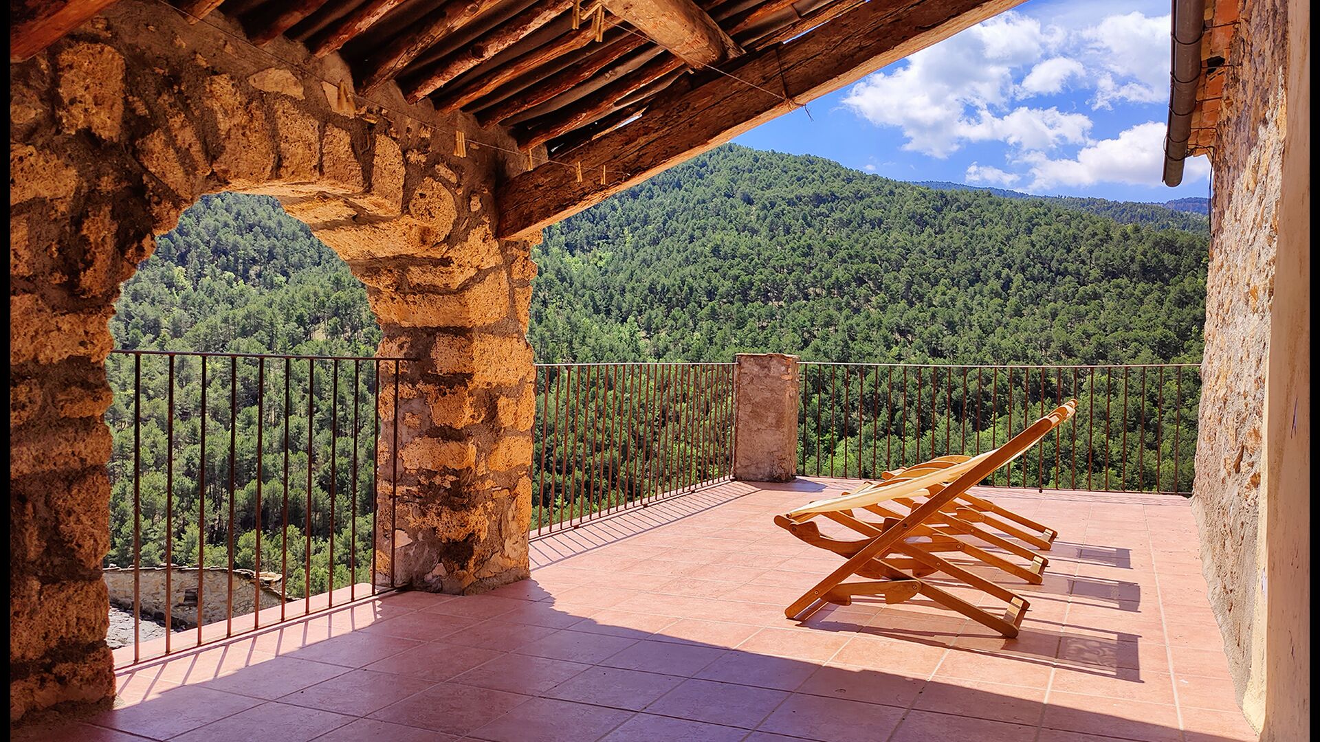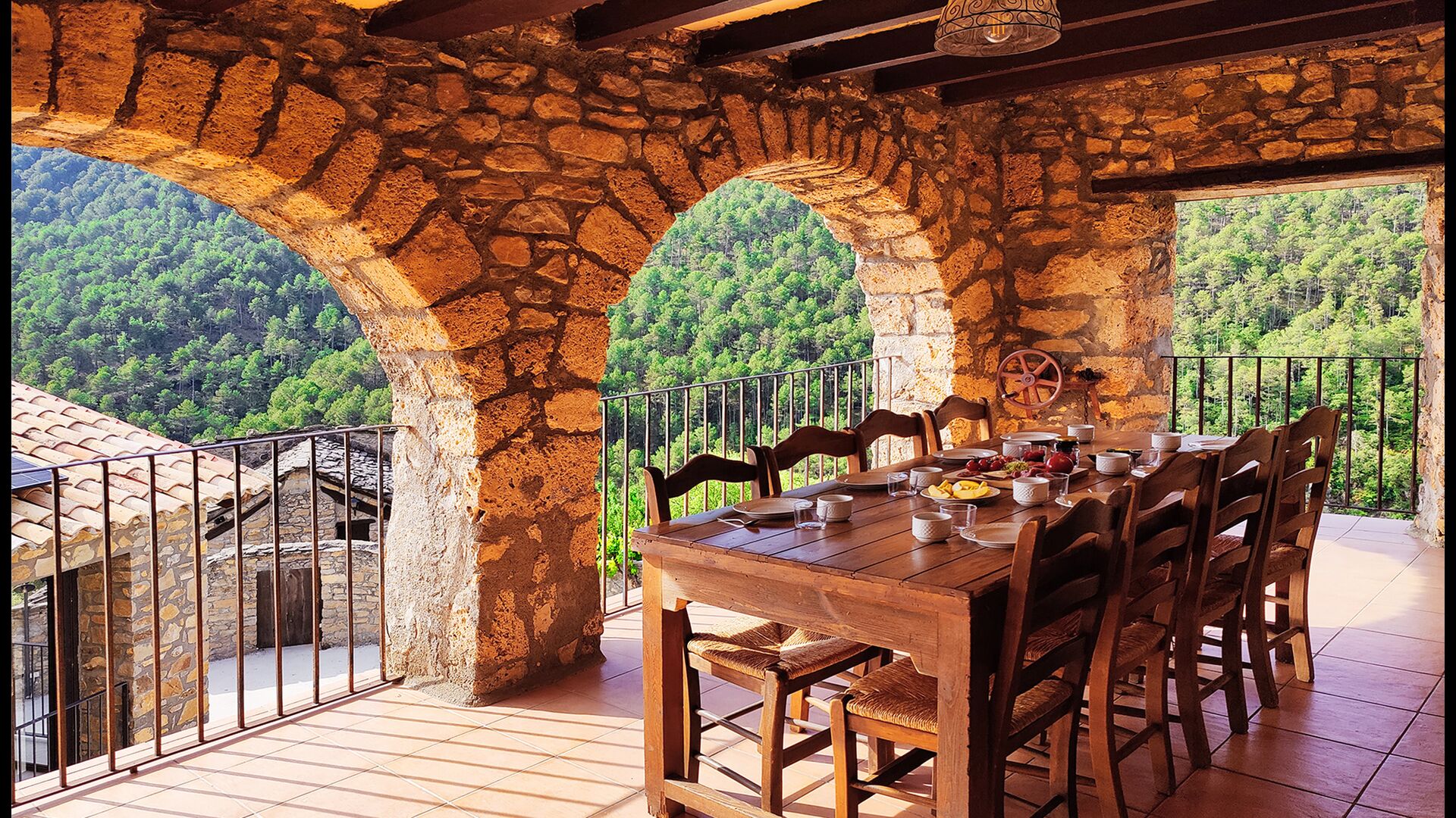 La terraza cubierta es uno de los lugares más encantadores de la casa, perfecta para desayunar o relajarse mientras se escucha el cercano arroyo de Valldarques.