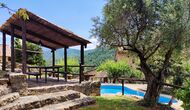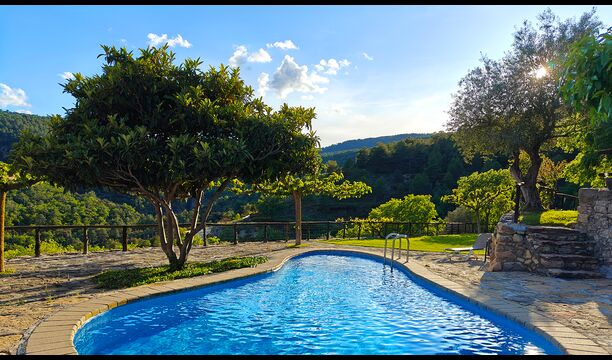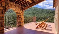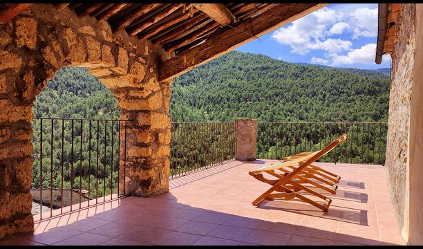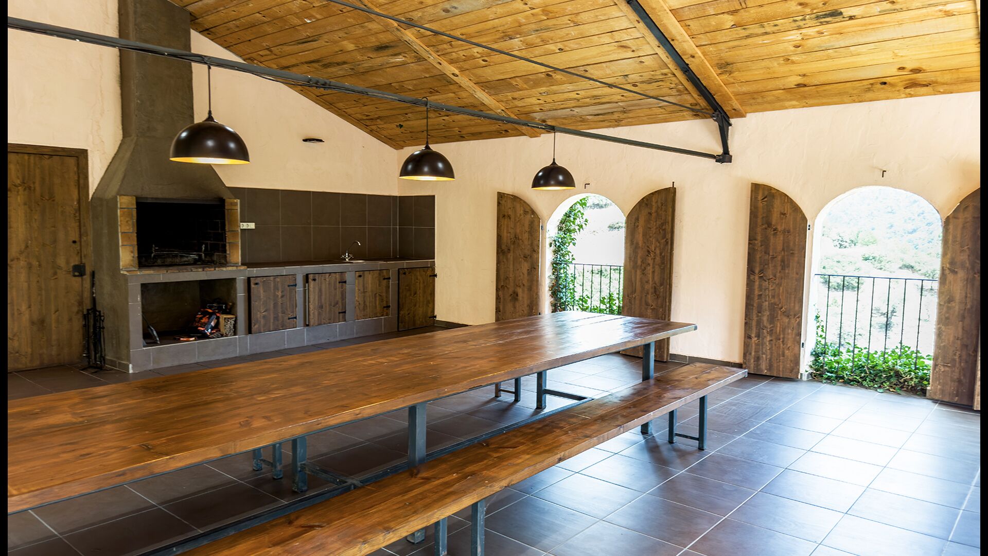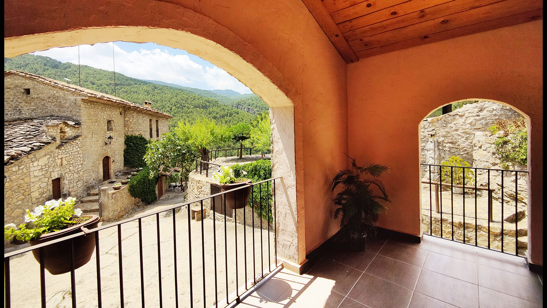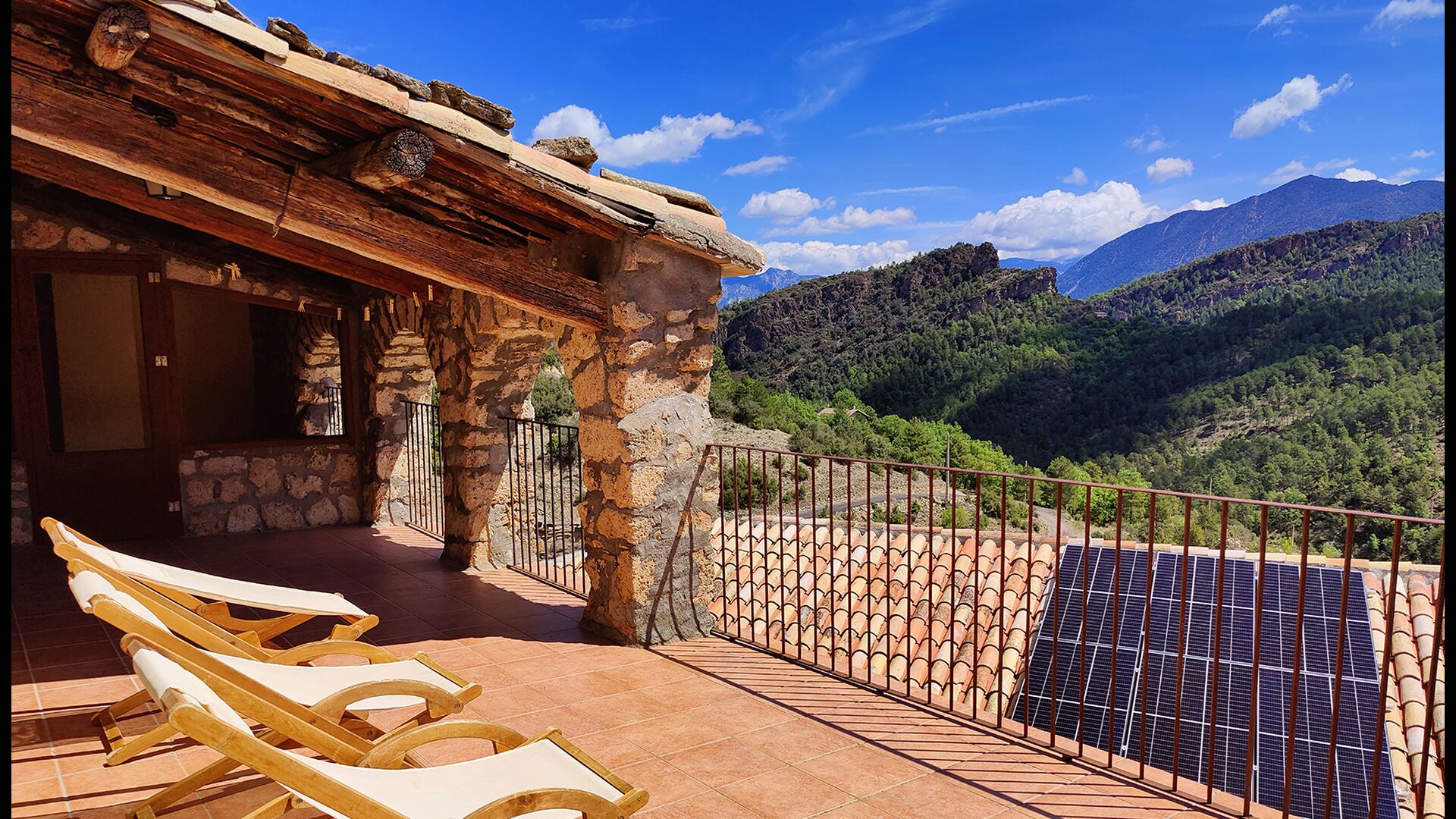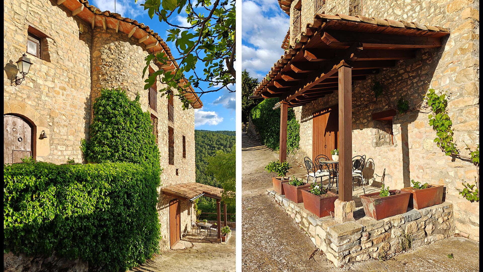 La terraza cubierta es uno de los lugares más encantadores de la casa, perfecta para desayunar o relajarse mientras se escucha el cercano arroyo de Valldarques.