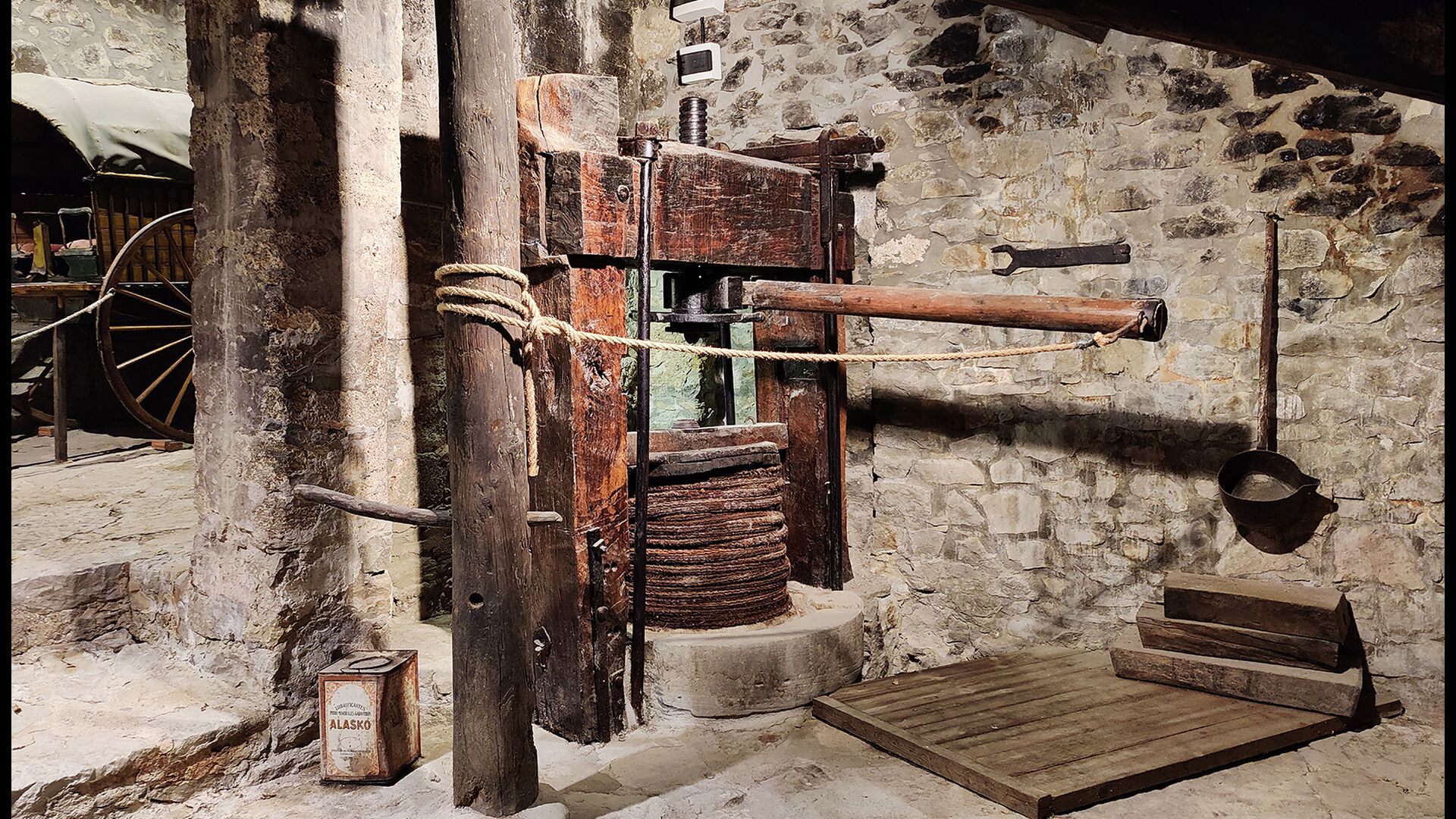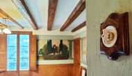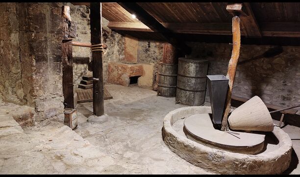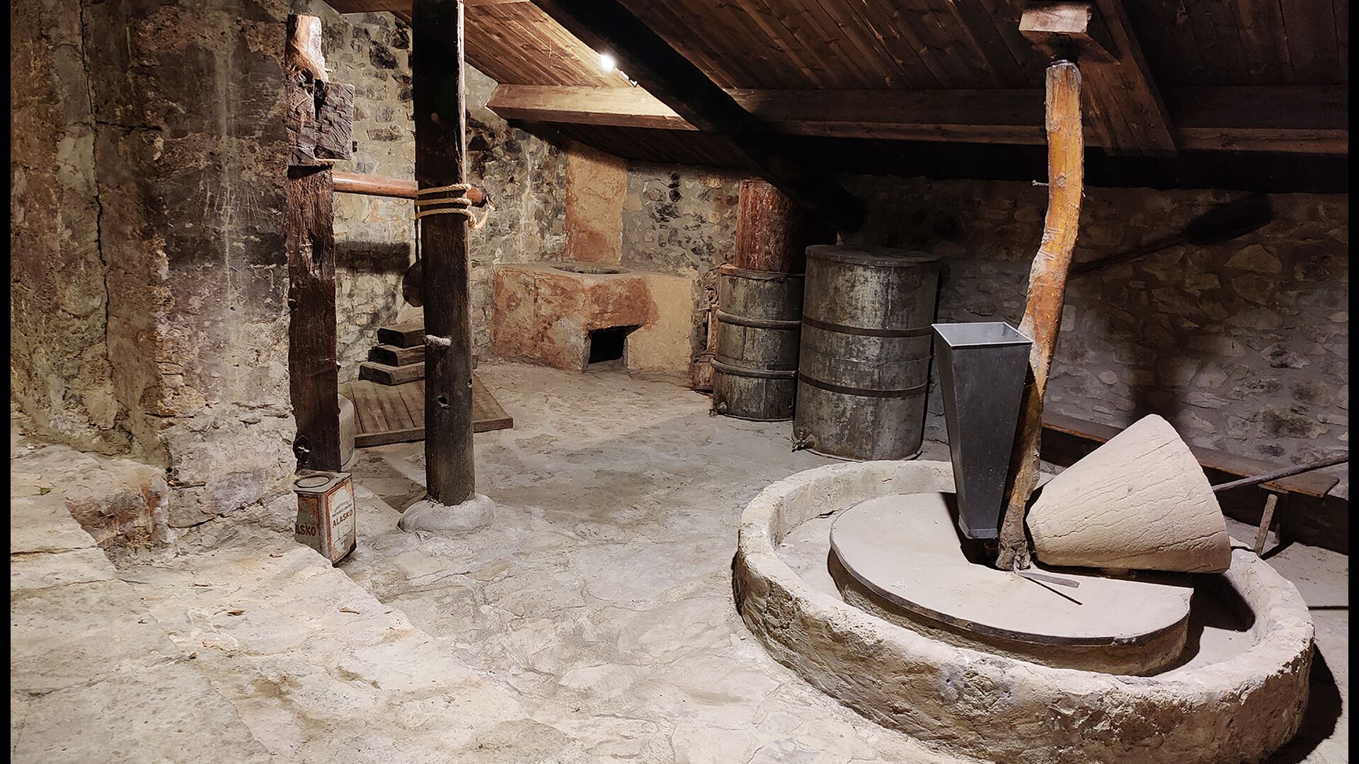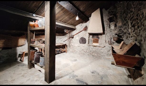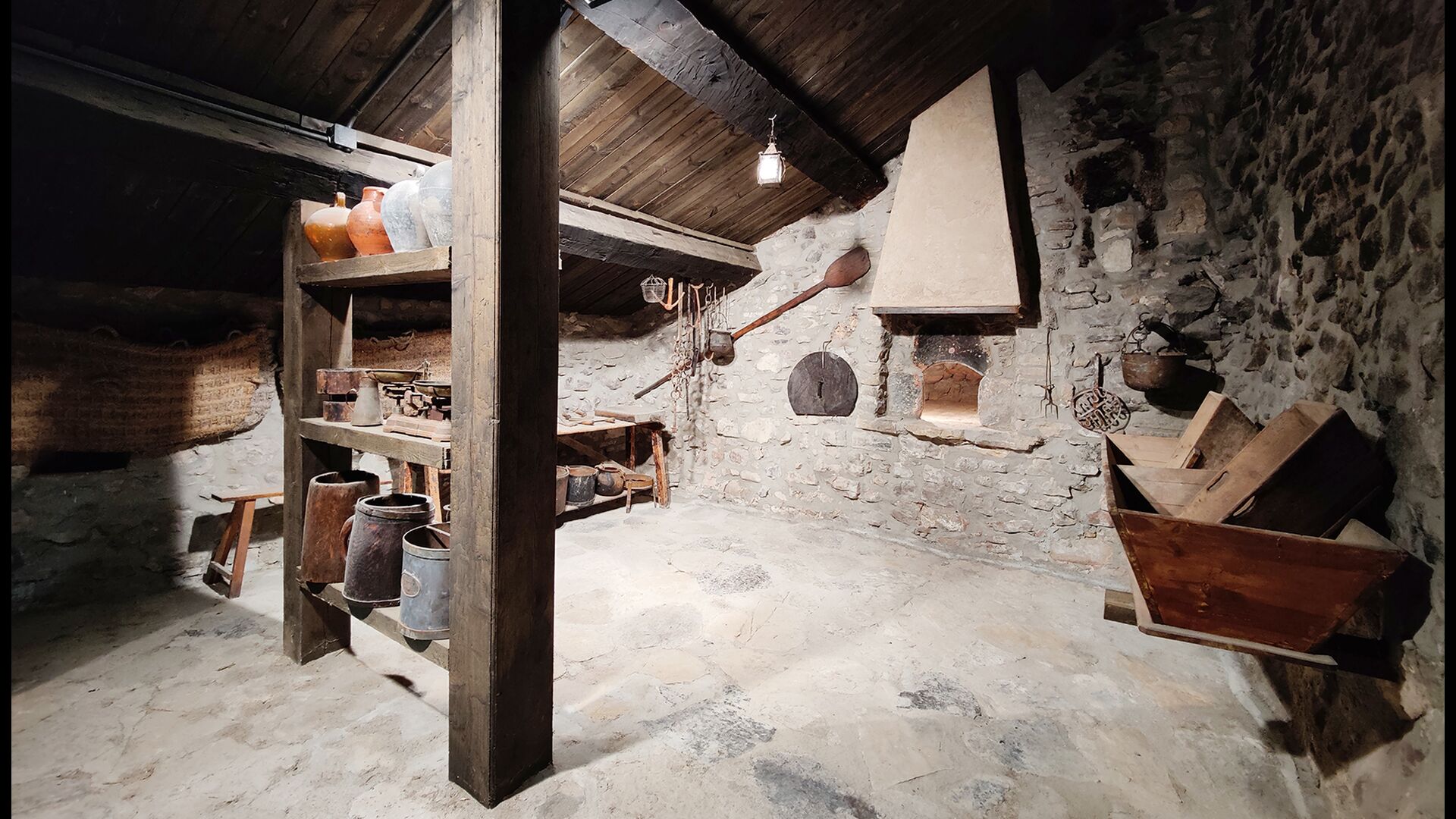 La propiedad cuenta con gruesos muros de piedra, una sólida puerta de entrada de madera e incluso frescos del siglo XVIII conservados, que reflejan la larga historia de esta tradicional finca rural. Una pequeña capilla y un museo conectados con la casa muestran herramientas y espacios que ilustran la vida cotidiana en una antigua granja de montaña autosuficiente.