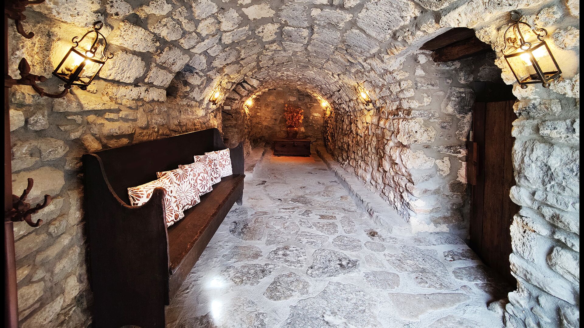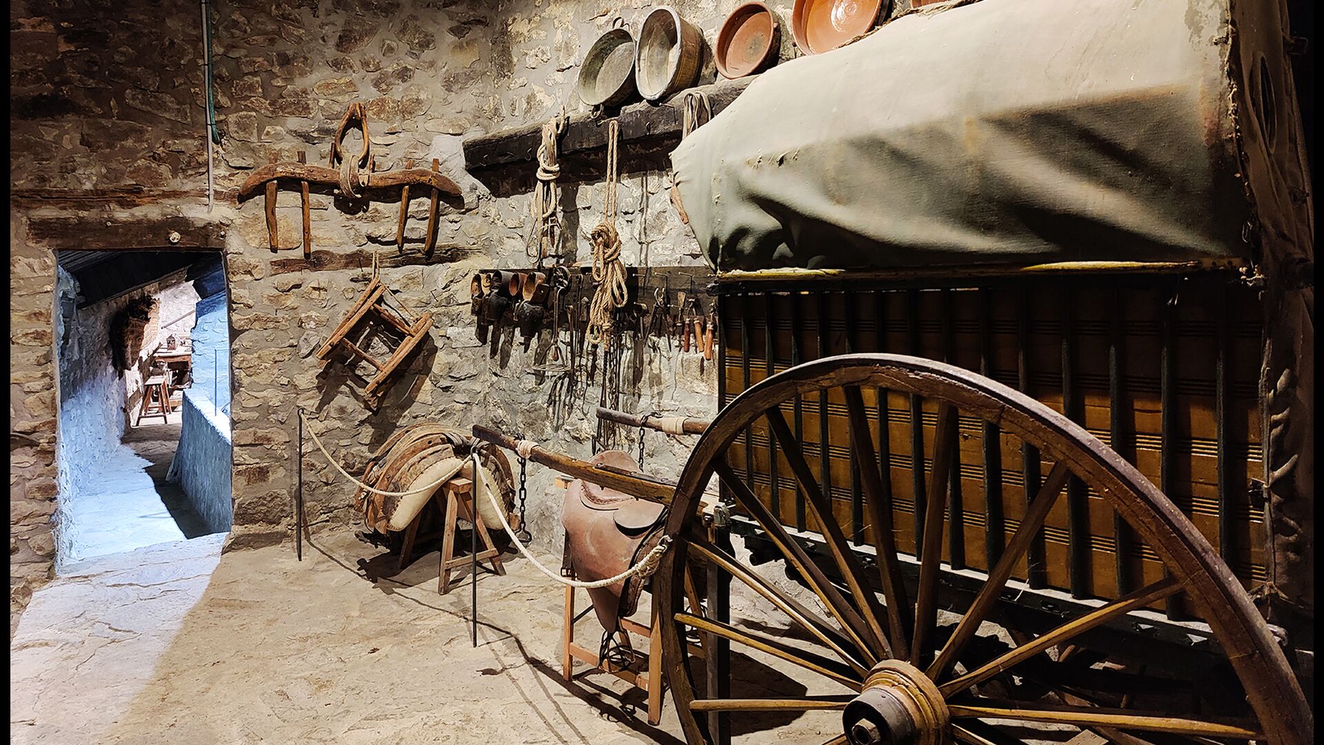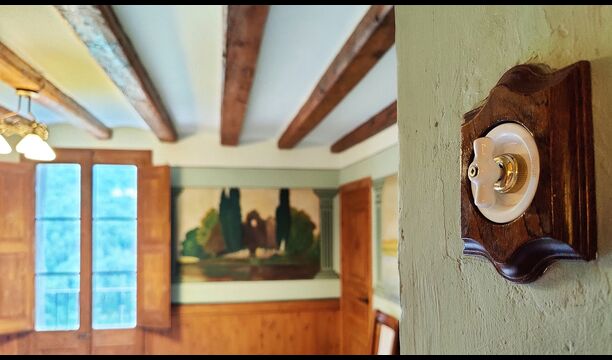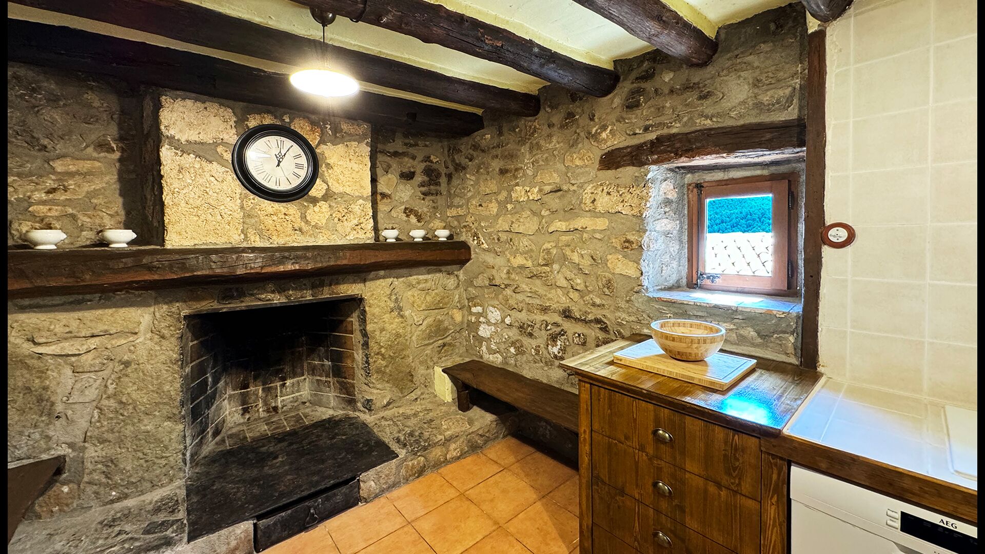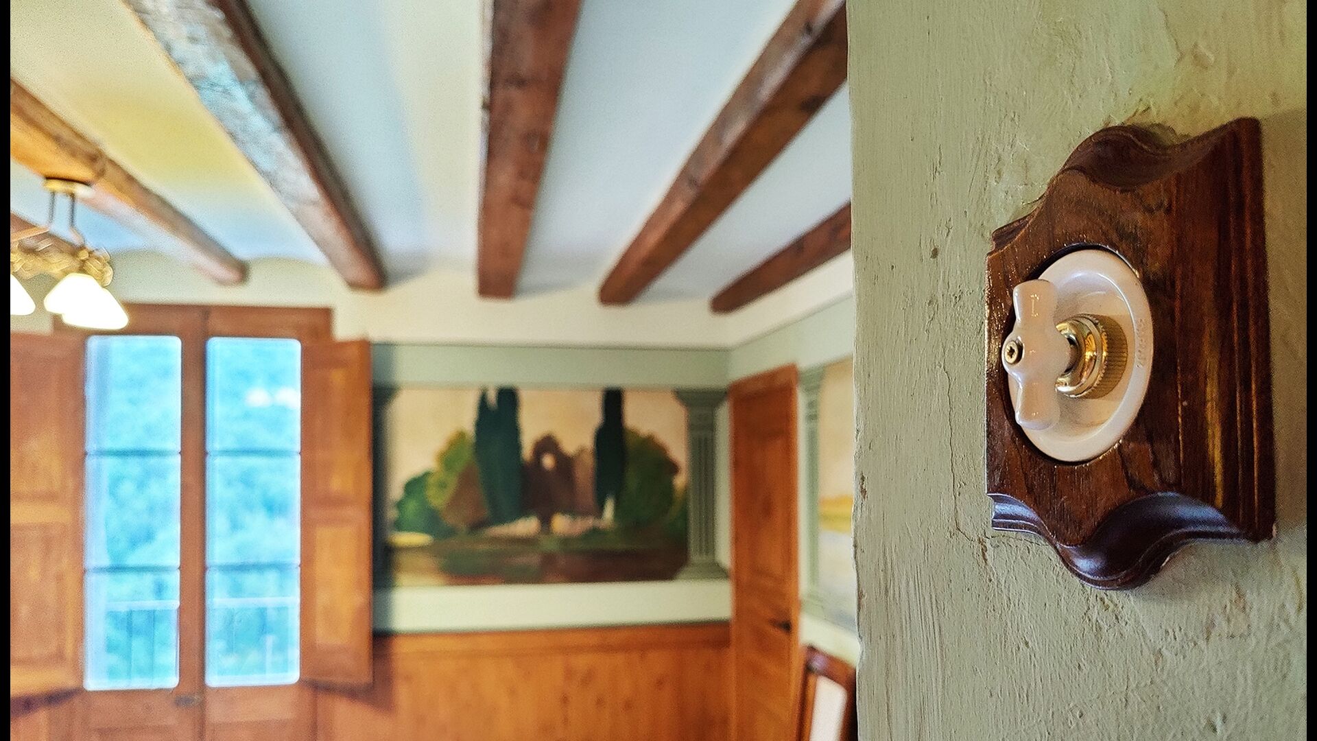 La propiedad cuenta con gruesos muros de piedra, una sólida puerta de entrada de madera e incluso frescos del siglo XVIII conservados, que reflejan la larga historia de esta tradicional finca rural. Una pequeña capilla y un museo conectados con la casa muestran herramientas y espacios que ilustran la vida cotidiana en una antigua granja de montaña autosuficiente.
