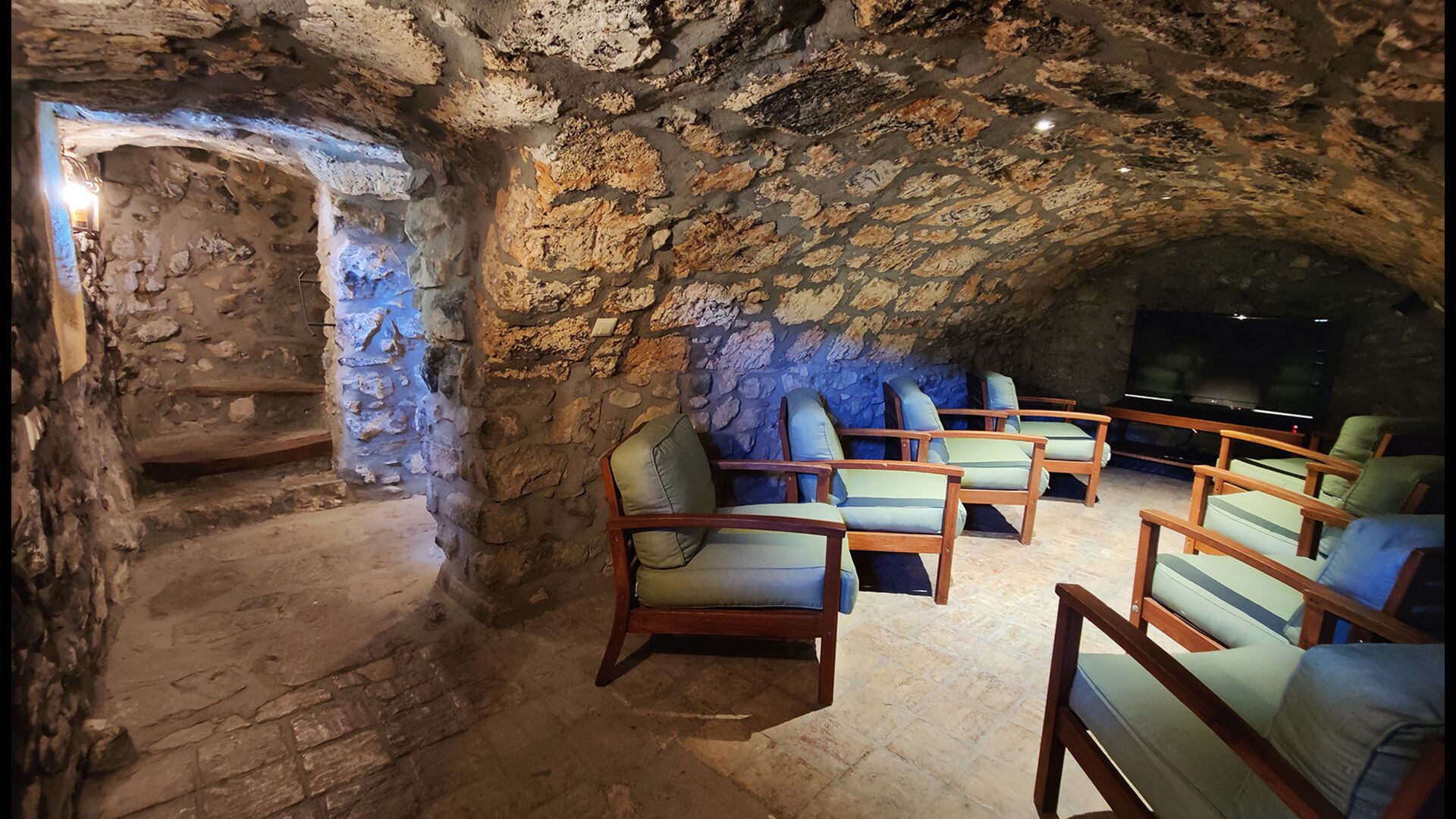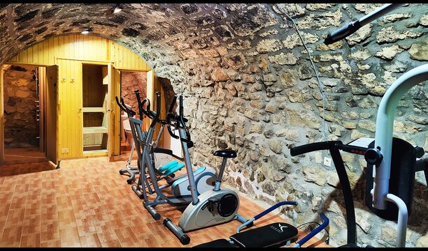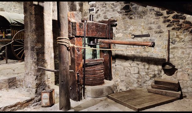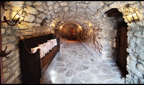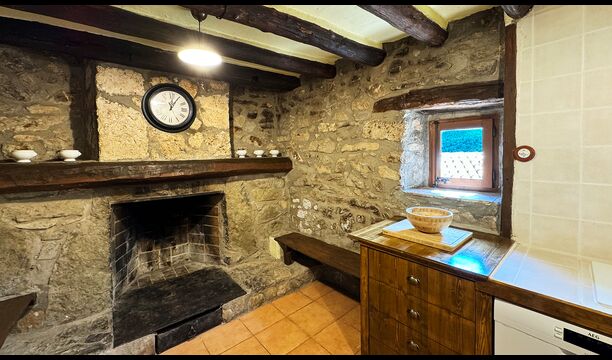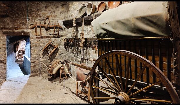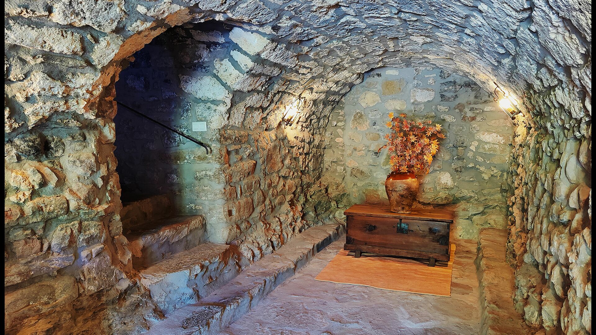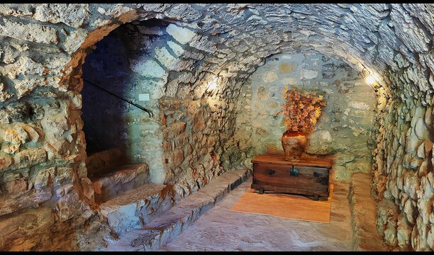 La propiedad cuenta con gruesos muros de piedra, una sólida puerta de entrada de madera e incluso frescos del siglo XVIII conservados, que reflejan la larga historia de esta tradicional finca rural. Una pequeña capilla y un museo conectados con la casa muestran herramientas y espacios que ilustran la vida cotidiana en una antigua granja de montaña autosuficiente.
