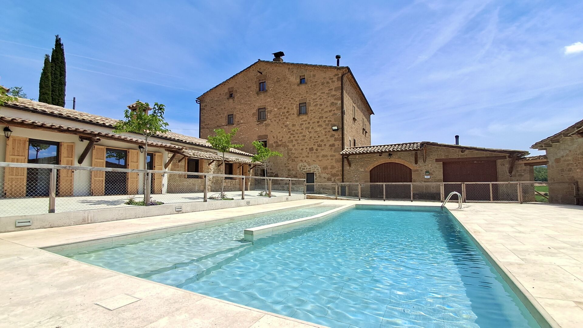 La finca en su conjunto comprende varios edificios históricos protegidos, incluyendo un molino harinero, una masía y una casa de administrador del siglo XVII, todos inscritos en el inventario del patrimonio arquitectónico de Cataluña. Estos edificios han sido renovados recientemente y funcionan ahora como casas rurales de vacaciones, cuidadosamente restauradas para preservar su encanto original y al mismo tiempo ofrecer comodidad moderna.