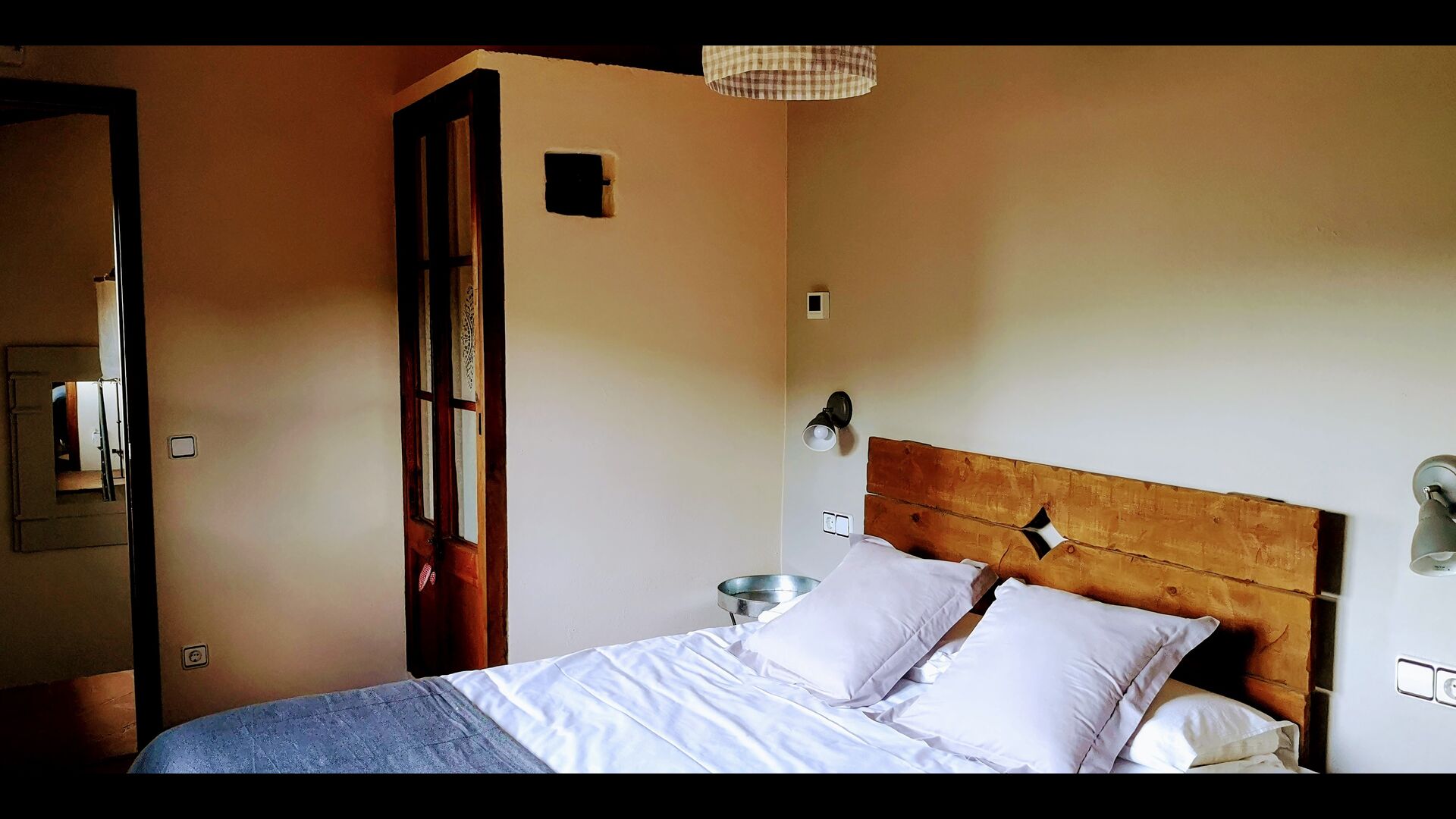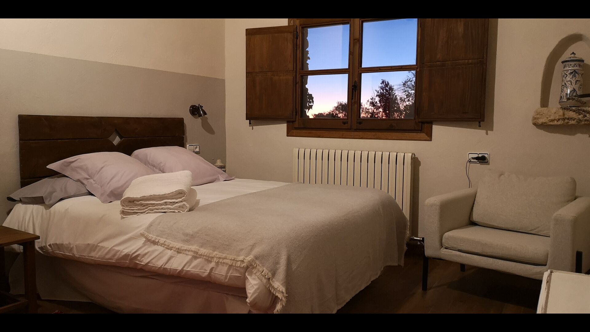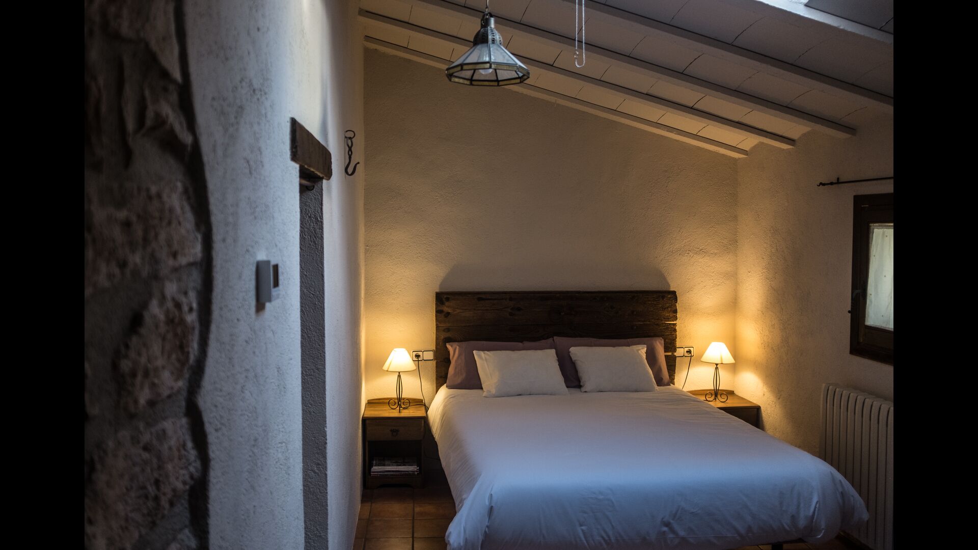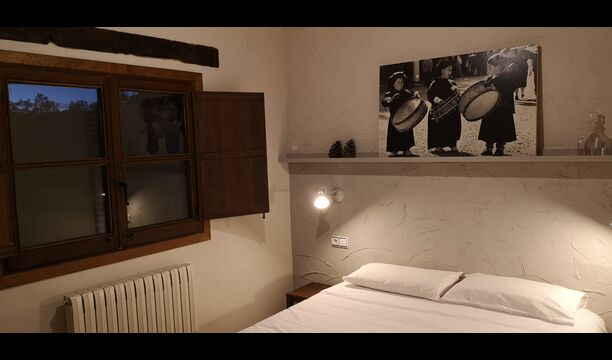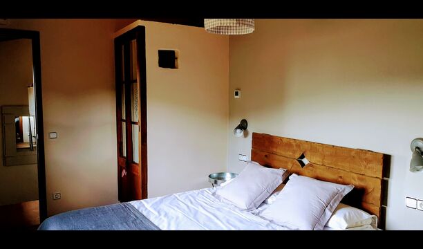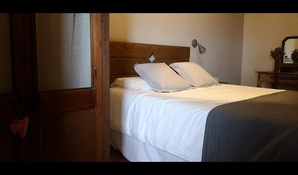 - Farena: Una habitación con 1 cama de matrimonio, dos pequeñas mesitas de noche con lámparas y baño privado, con vistas al jardín y a la montaña, con opción a cama supletoria. (35 EUR), y admite mascotas. Las dimensiones de la cama son 150x190cm.