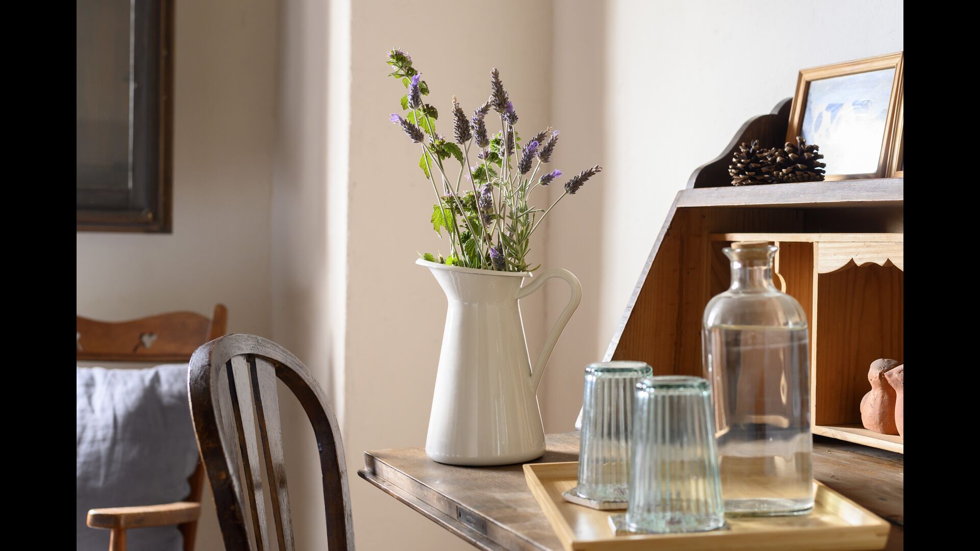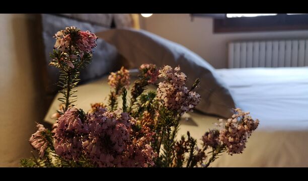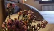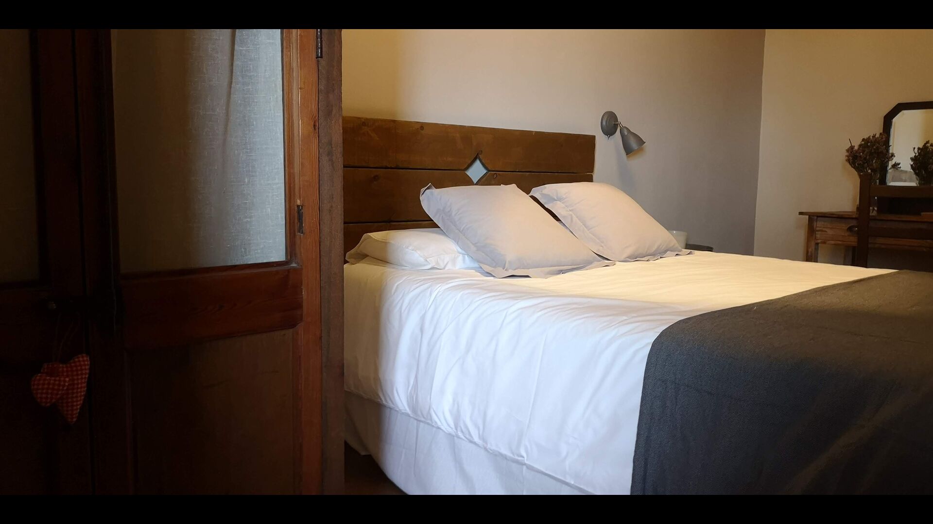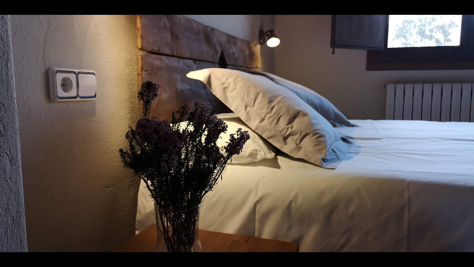 - Farena: Una habitación con 1 cama de matrimonio, dos pequeñas mesitas de noche con lámparas y baño privado, con vistas al jardín y a la montaña, con opción a cama supletoria. (35 EUR), y admite mascotas. Las dimensiones de la cama son 150x190cm.