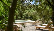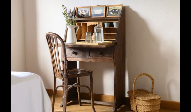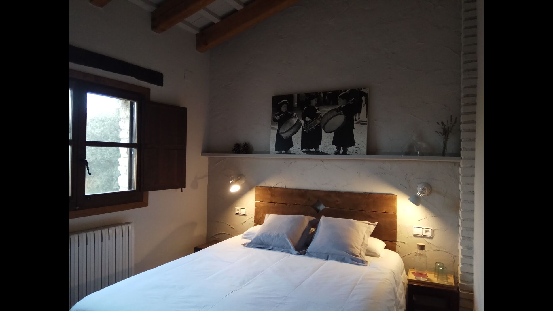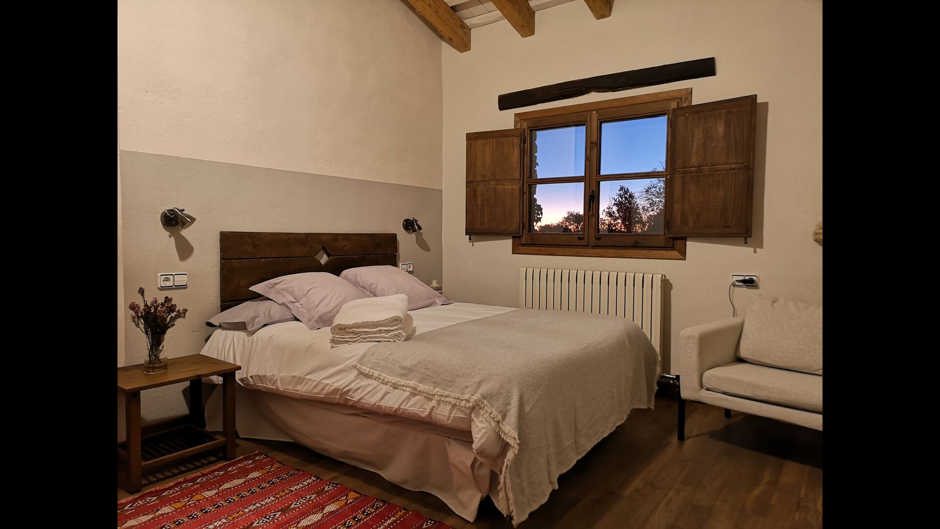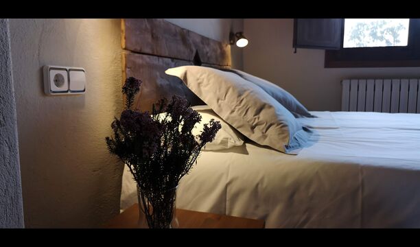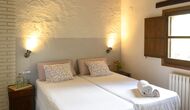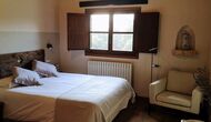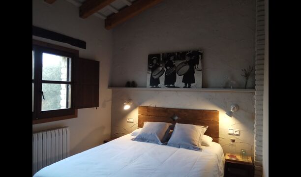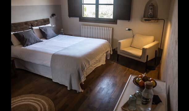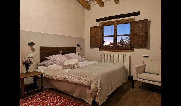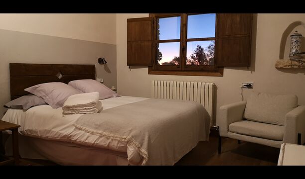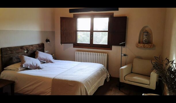 - Mont-Ral: Una habitación con 1 cama de matrimonio y baño privado, equipada con una mesita de madera clásica catalana y vistas al jardín y a la montaña. Las dimensiones de la cama son 150x190cm.