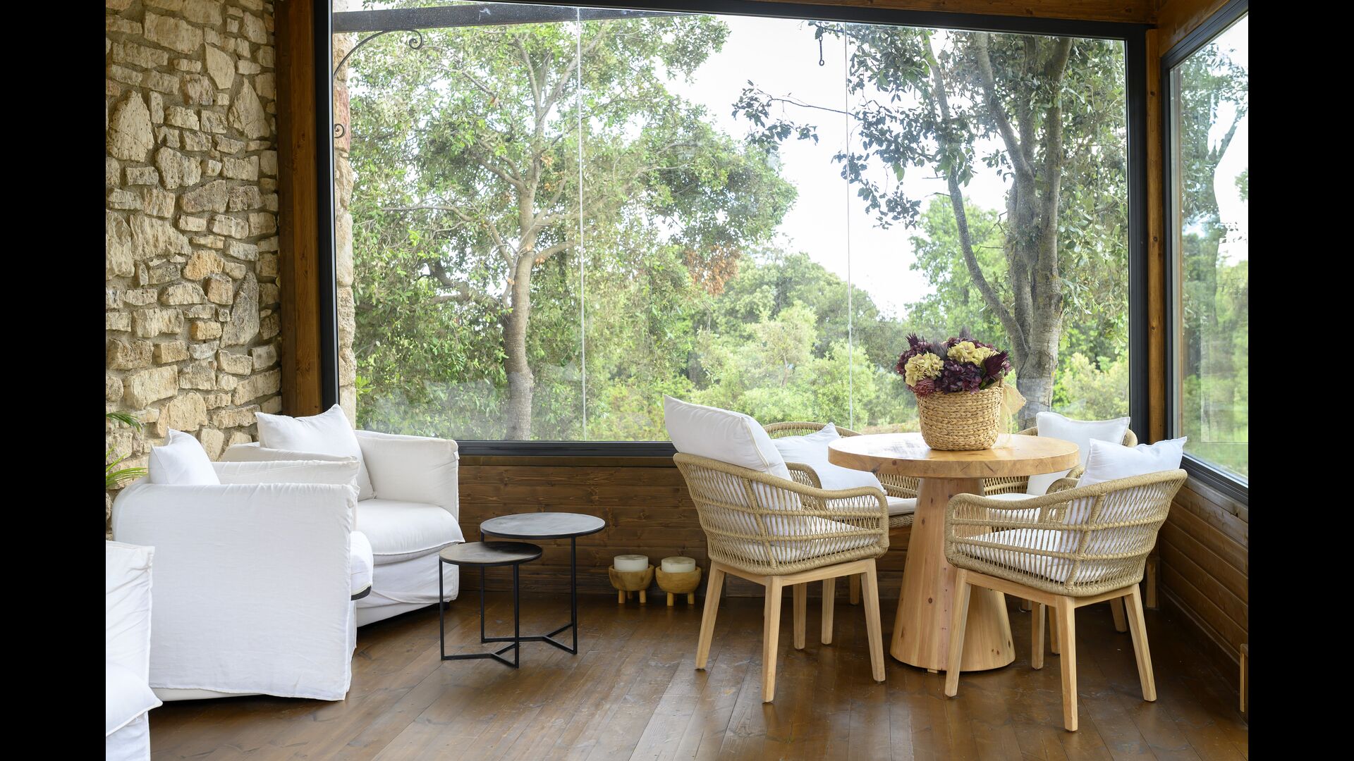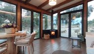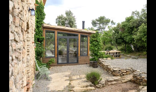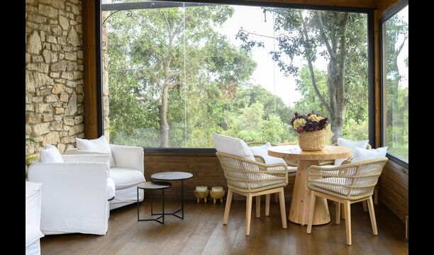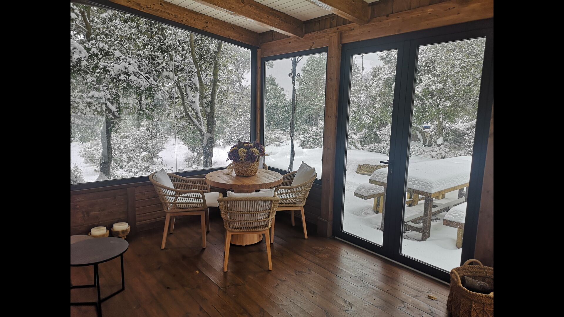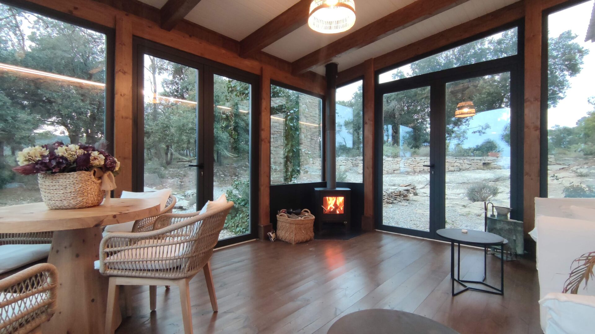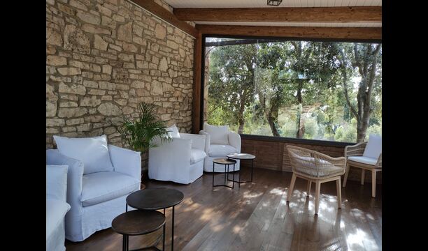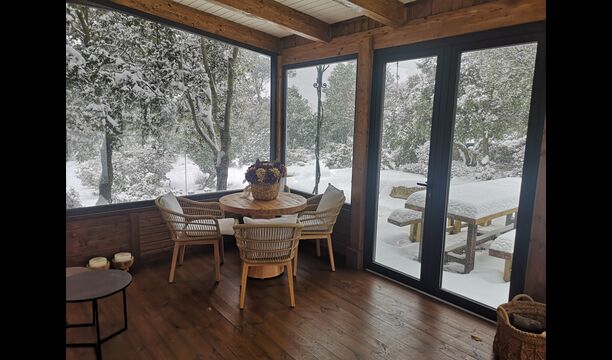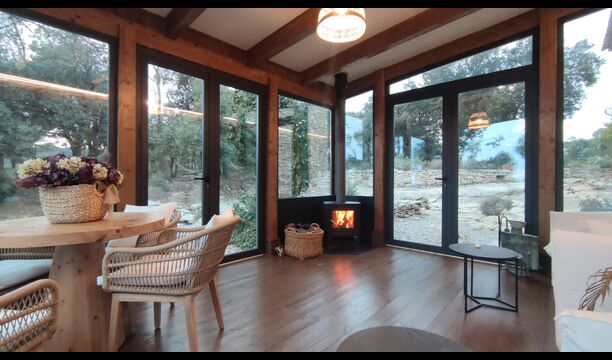 Además, la casa también cuenta con una zona de terraza techada y totalmente cubierta, con grandes grandes ventanales de cristal. Esta área también cuenta con una pequeña estufa, sillones y mesas para relajarse, leer libros o jugar a las cartas. No importa la estación o el clima, descansar en esta área seguramente le brindará una sensación de paz y tranquilidad, ya que podrá contemplar el gran jardín, que es un hermoso jardín. y las maravillosas vistas del paisaje más allá.
