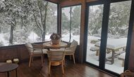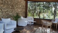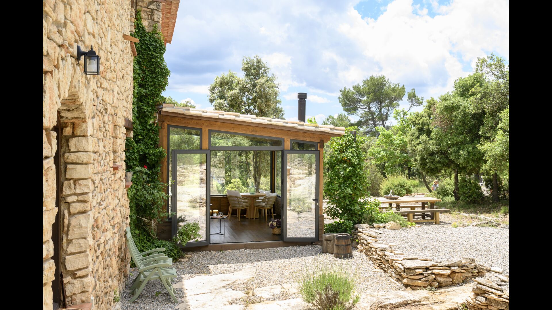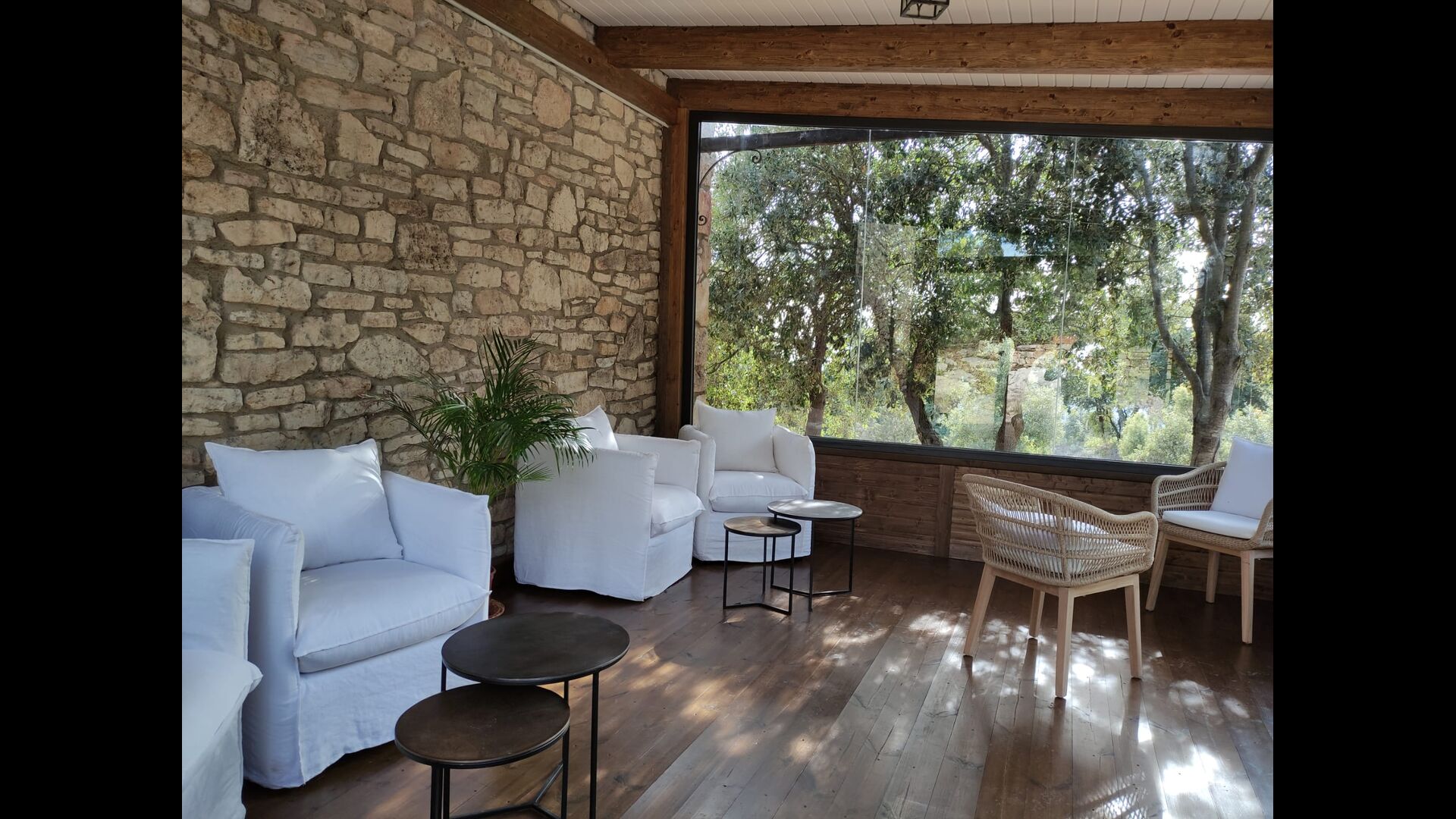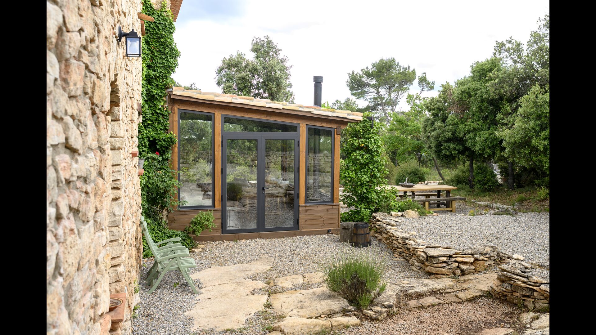 Además, la casa también cuenta con una zona de terraza techada y totalmente cubierta, con grandes grandes ventanales de cristal. Esta área también cuenta con una pequeña estufa, sillones y mesas para relajarse, leer libros o jugar a las cartas. No importa la estación o el clima, descansar en esta área seguramente le brindará una sensación de paz y tranquilidad, ya que podrá contemplar el gran jardín, que es un hermoso jardín. y las maravillosas vistas del paisaje más allá.