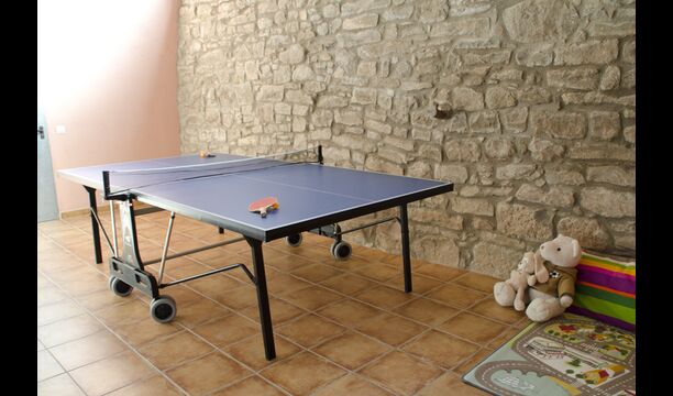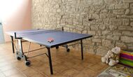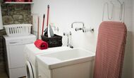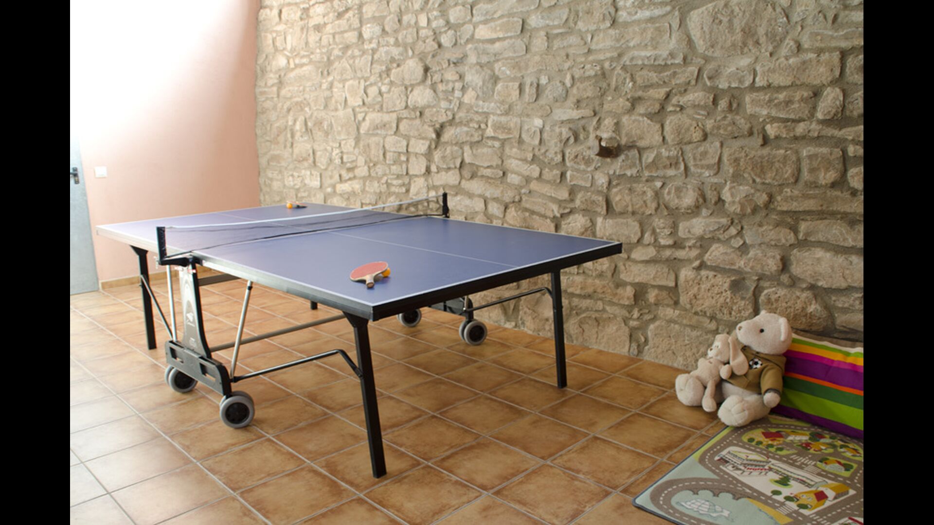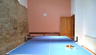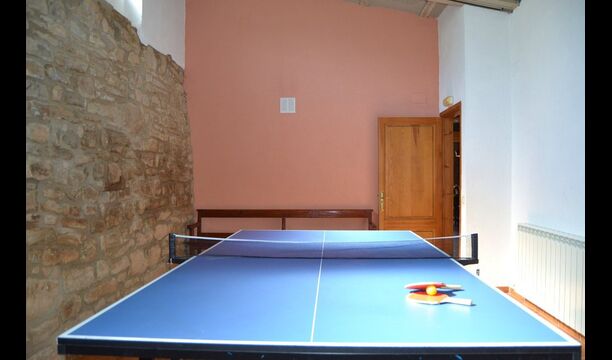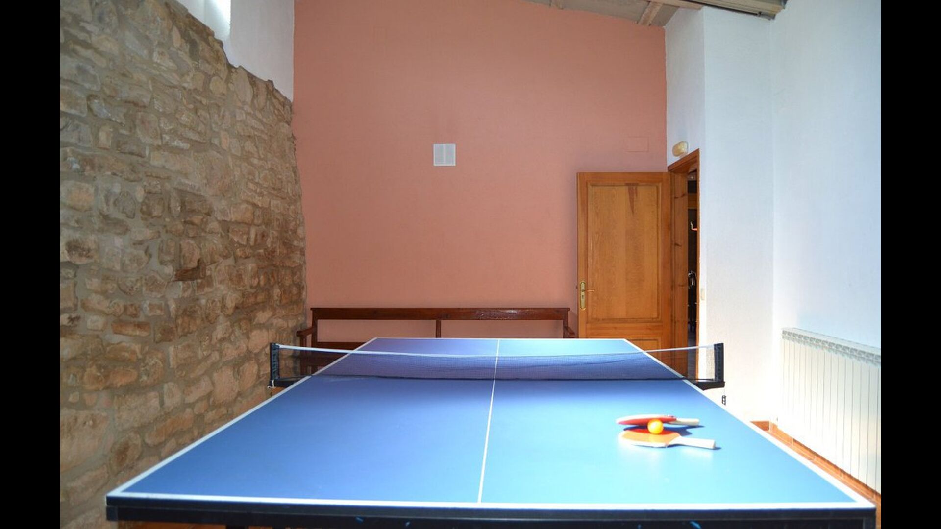 - La entrada principal en la planta baja tiene un patio con barbacoa y mesas. Dentro del edificio hay un comedor y un salón con dos sofás, chimenea y televisión. La cocina está en la misma zona y está equipada con vitrocerámica, nevera, horno y lavavajillas. Un área común conduce a un baño con ducha, un dormitorio con dos camas individuales, un área de lavado con fregadero, lavadora y secadora, y una sala de juegos con mesa de ping pong y juegos de mesa.