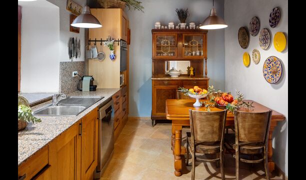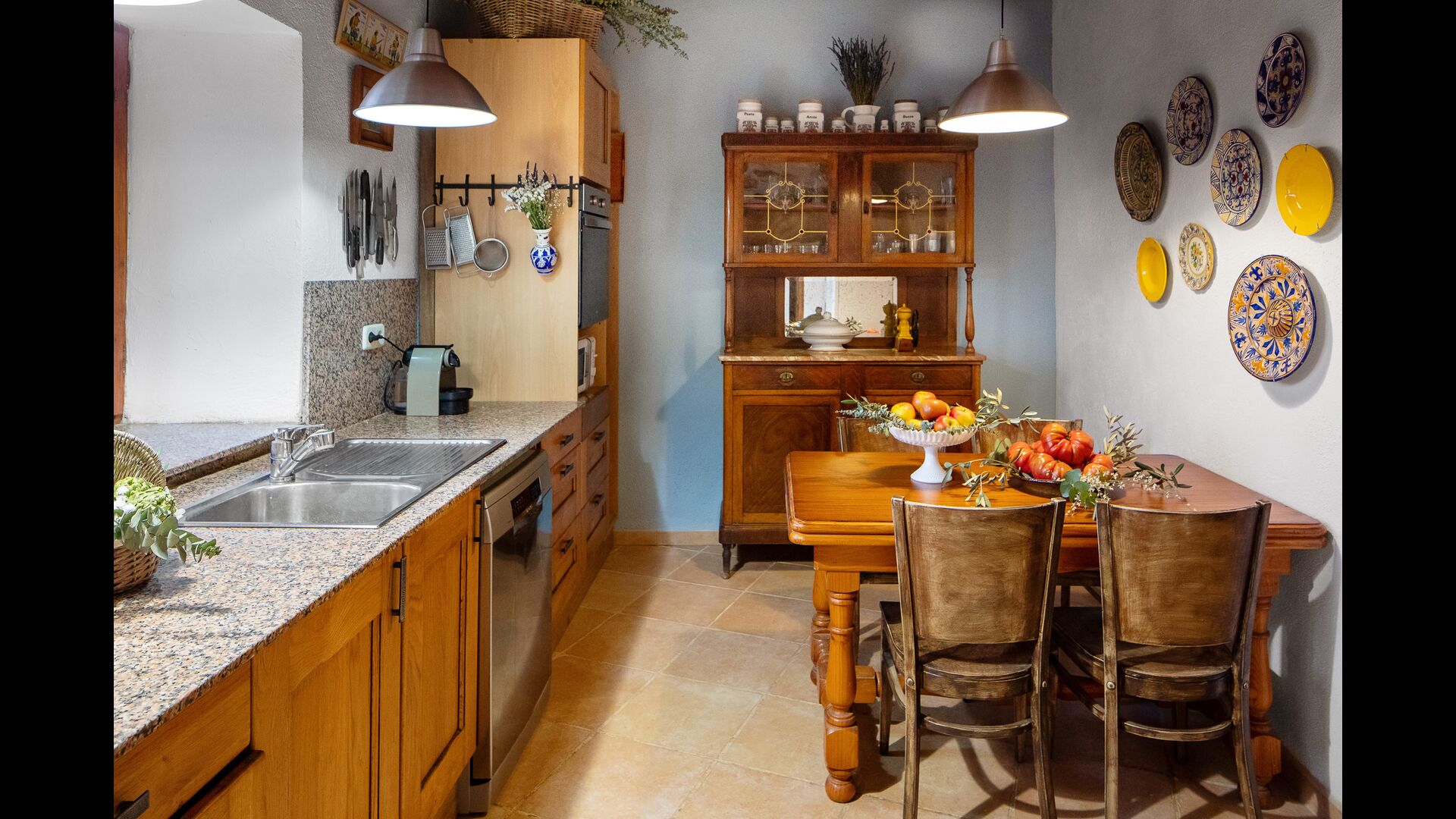 La casa tiene una acogedora y cocina de estilo rural bien equipada con neveras adicionales para sus bebidas frías, así como una gran sala común con mesa de comedor y sofás . Arriba, hay una muy bonita “terraza de cristal” con una vista fantástica sobre el paisaje.